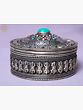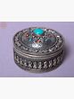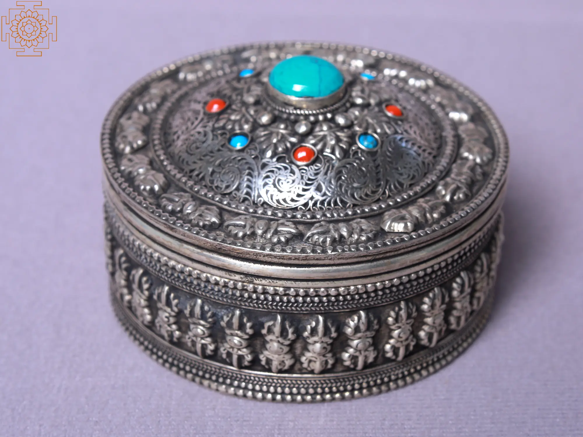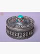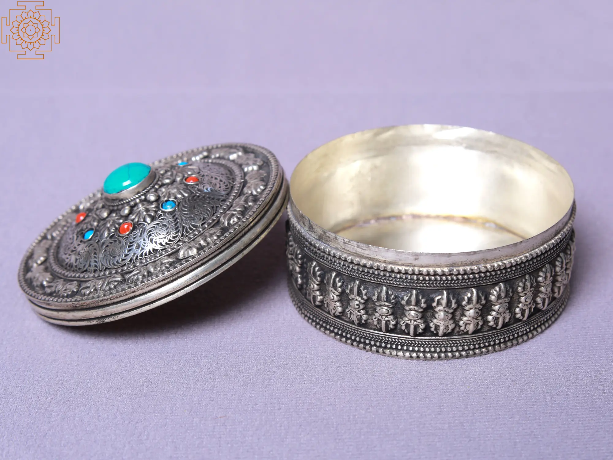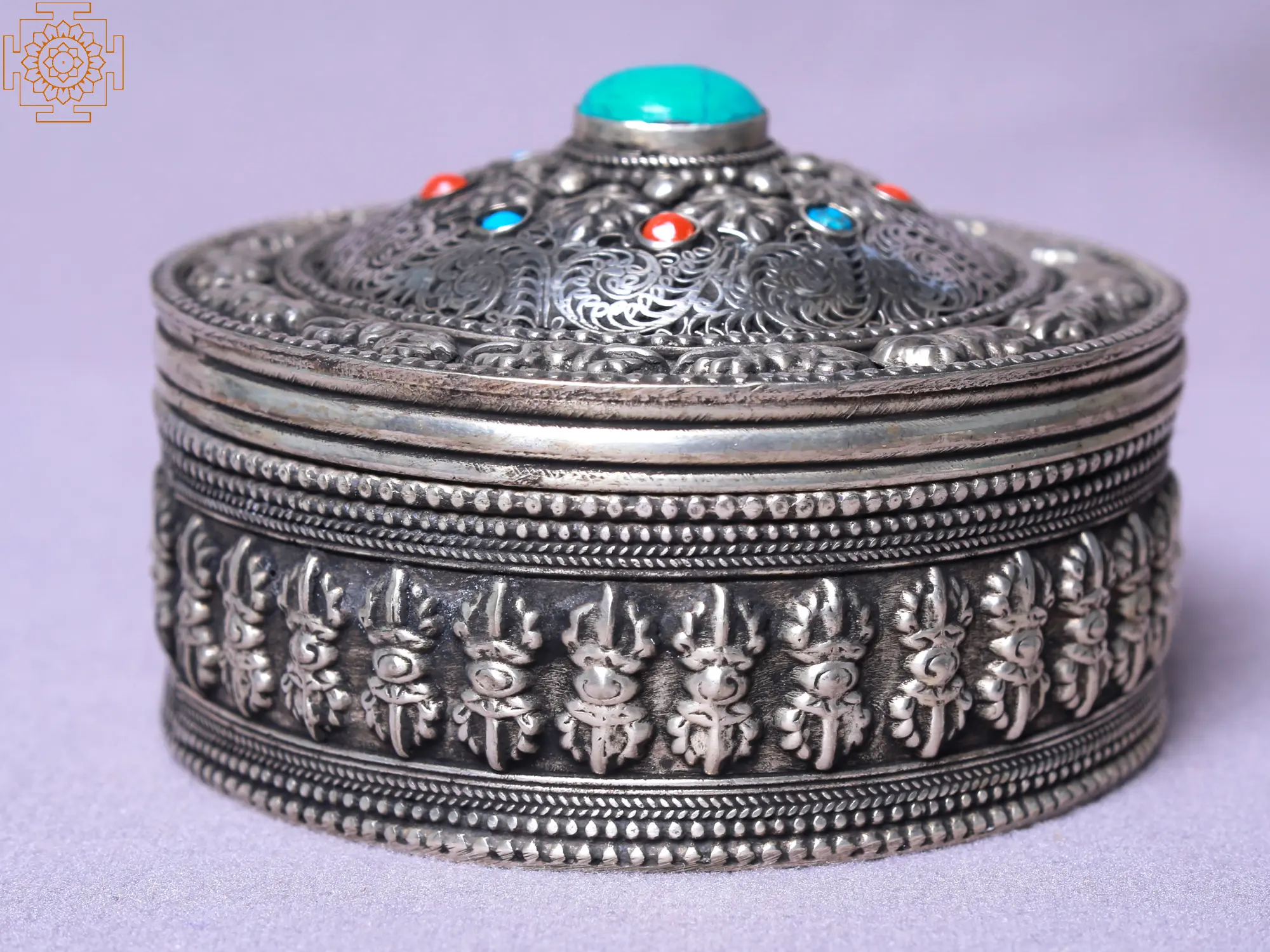 This stunning 9-inch jewellery box is a true testament to Nepalese craftsmanship. Handcrafted with meticulous detail, this piece seamlessly blends traditional artistry with modern elegance. The box features a captivating Vajra design, a symbol of strength and enlightenment in Buddhist culture, intricately etched into the white metal. Its circular shape and ornate detailing make it a captivating addition to any dresser or vanity. The rich textures and intricate carvings transform this functional piece into a statement decorative item, adding a touch of exotic charm to your space. The box's lid is adorned with a vibrant turquoise cabochon at its center, encircled by smaller turquoise and coral stones, creating a visually striking contrast against the silvery-grey metal.