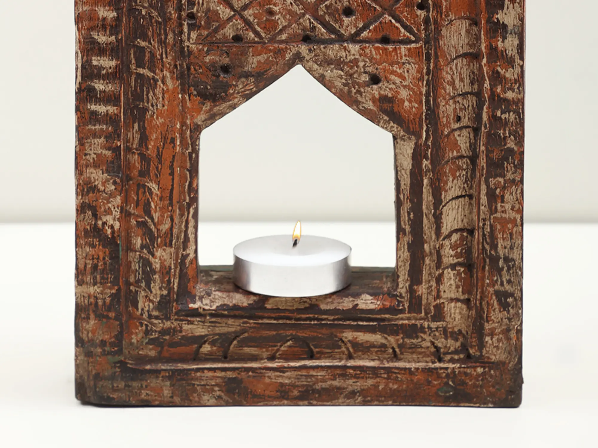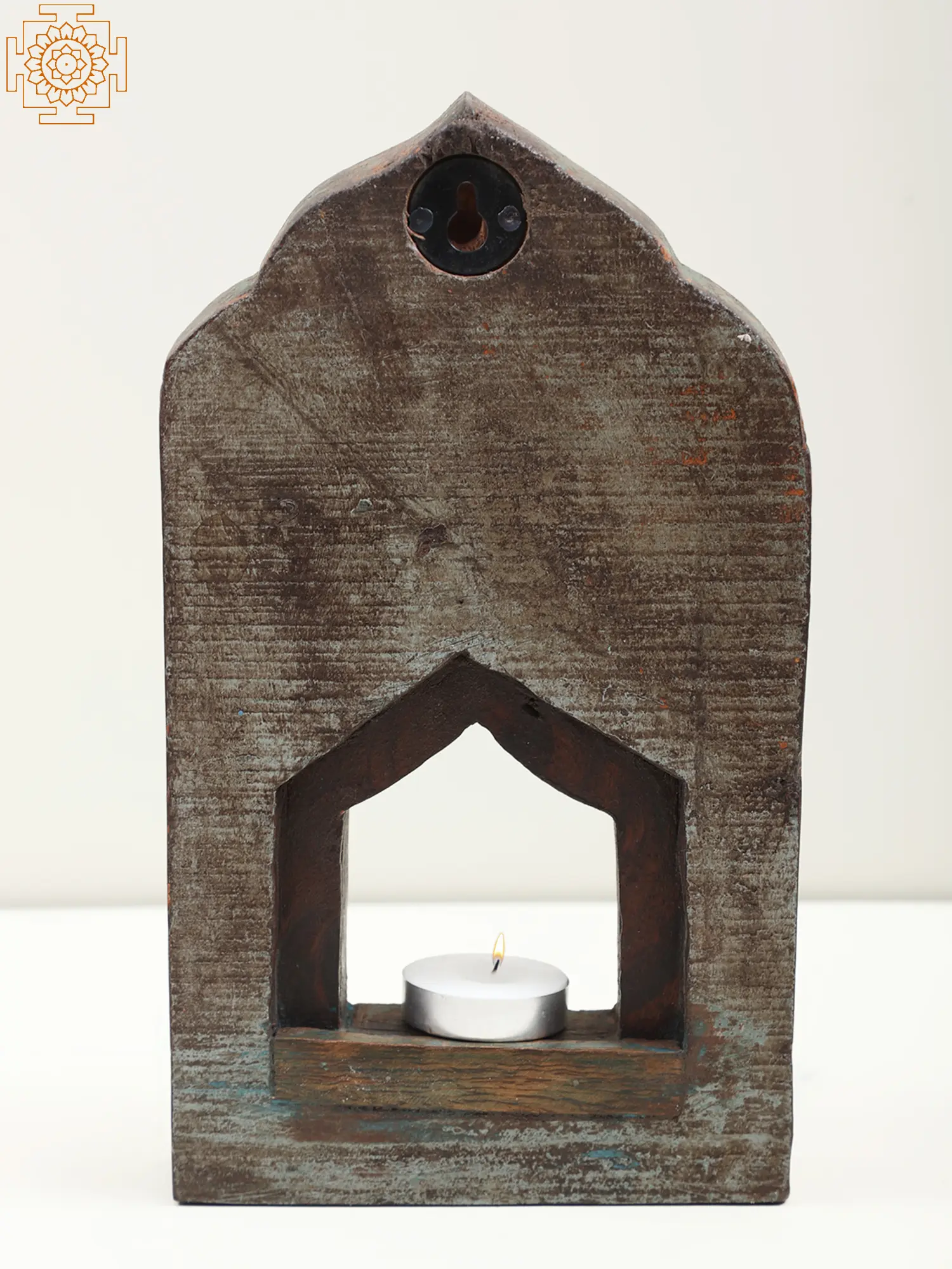 Adorned with beautiful carvings reminiscent of Indian temple art, this vintage wall hanging, a candle stand, symbolizes spirituality and tranquility. This work of art narrates a story of tradition and grace. This piece, beyond its vintage allure, serves as a beacon of serenity in any space. It casts a warm glow with its candlelit embrace.
