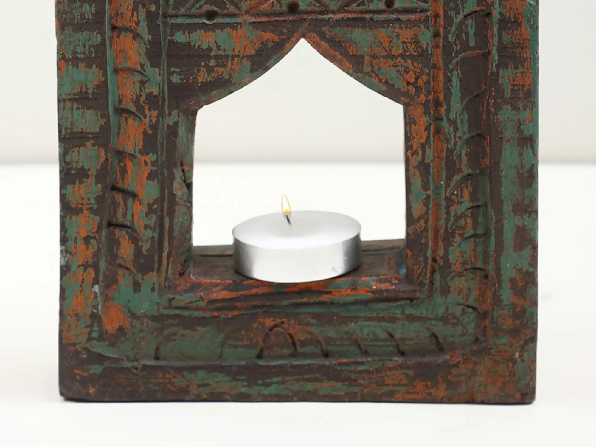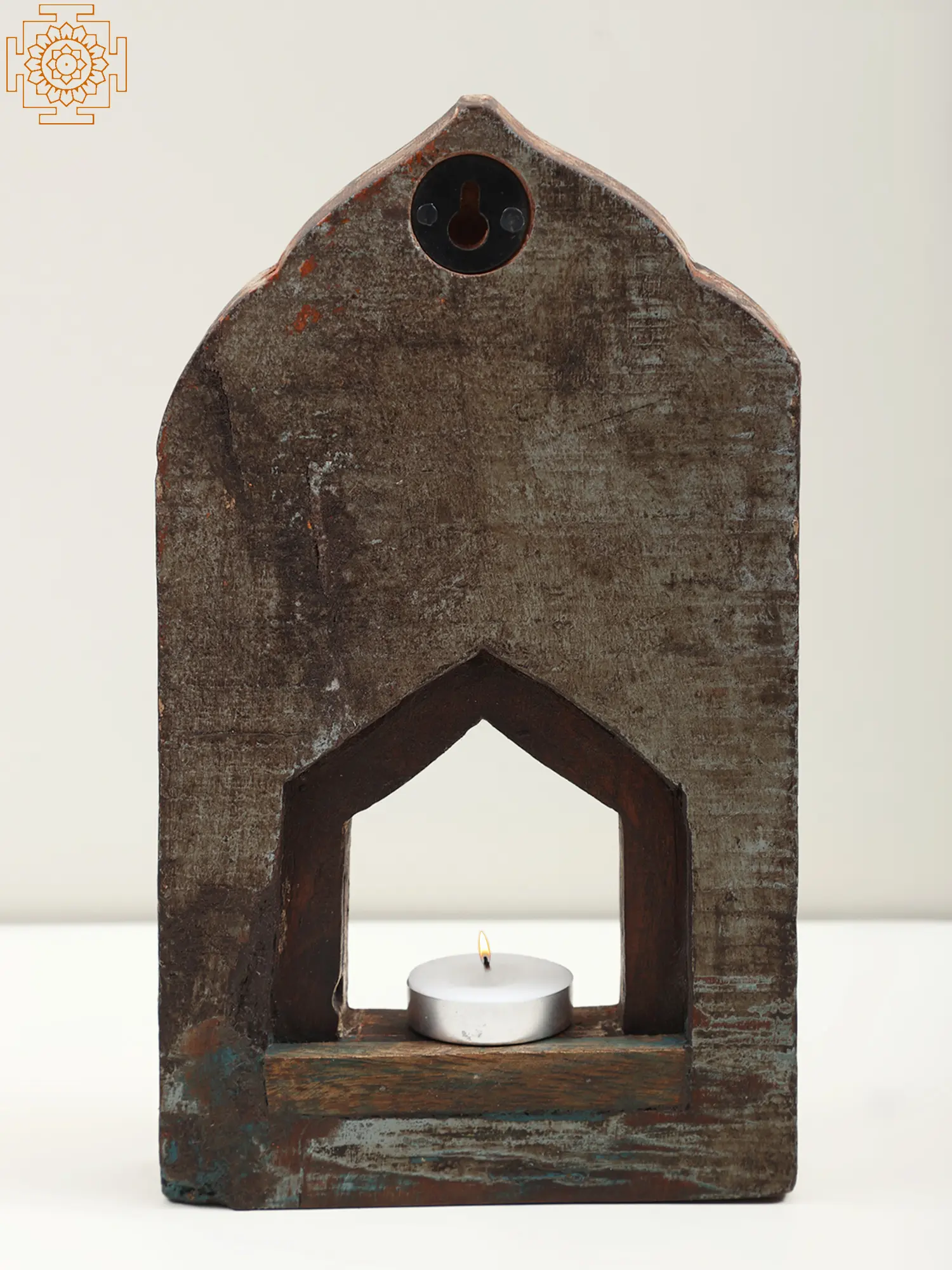Adorned with beautiful carvings reminiscent of Indian temple art, this vintage wall hanging, a candle stand, symbolizes spirituality and tranquility. This work of art narrates a story of tradition and grace. This piece, beyond its vintage allure, serves as a beacon of serenity in any space. It casts a warm glow with its candlelit embrace.