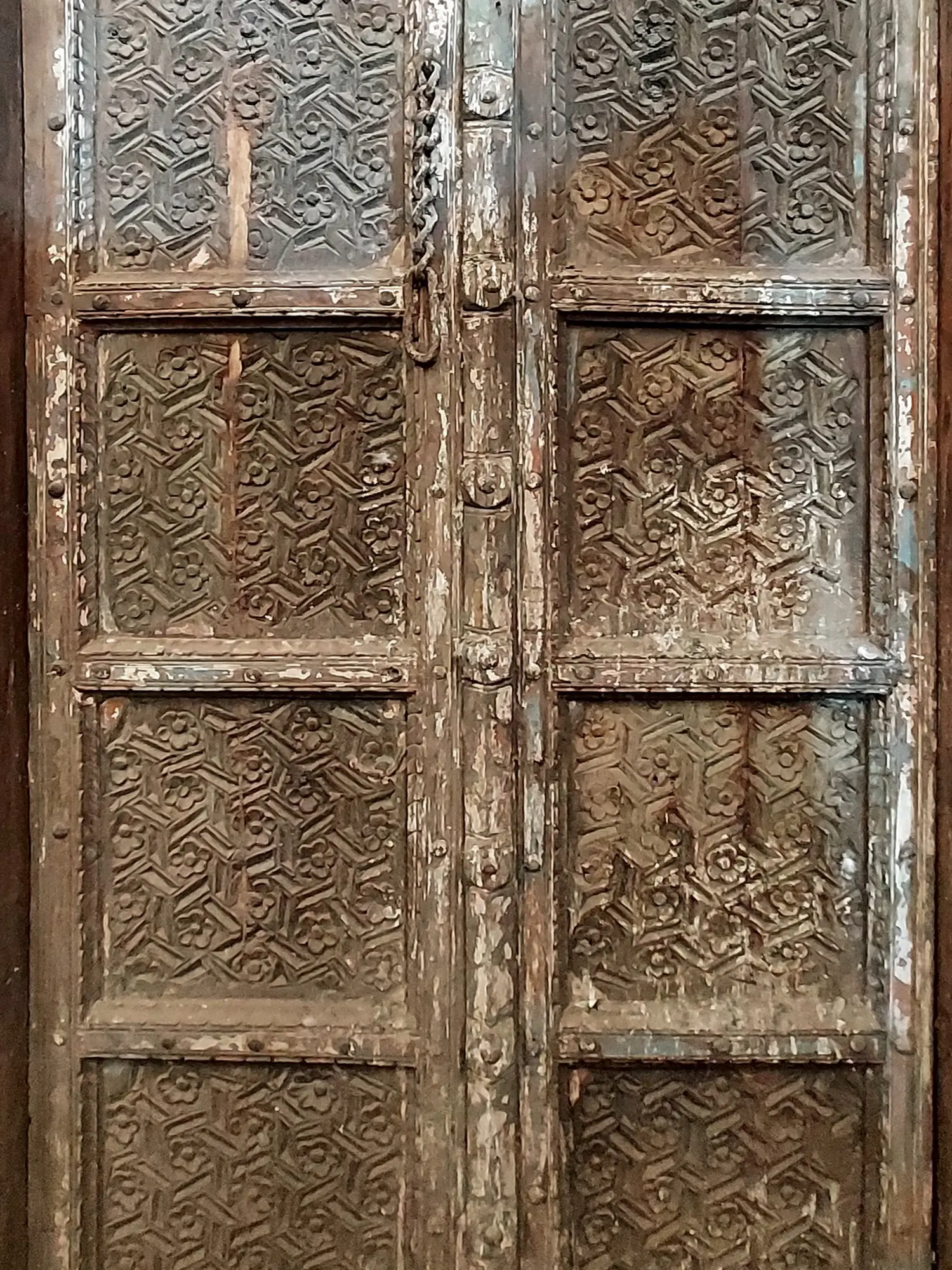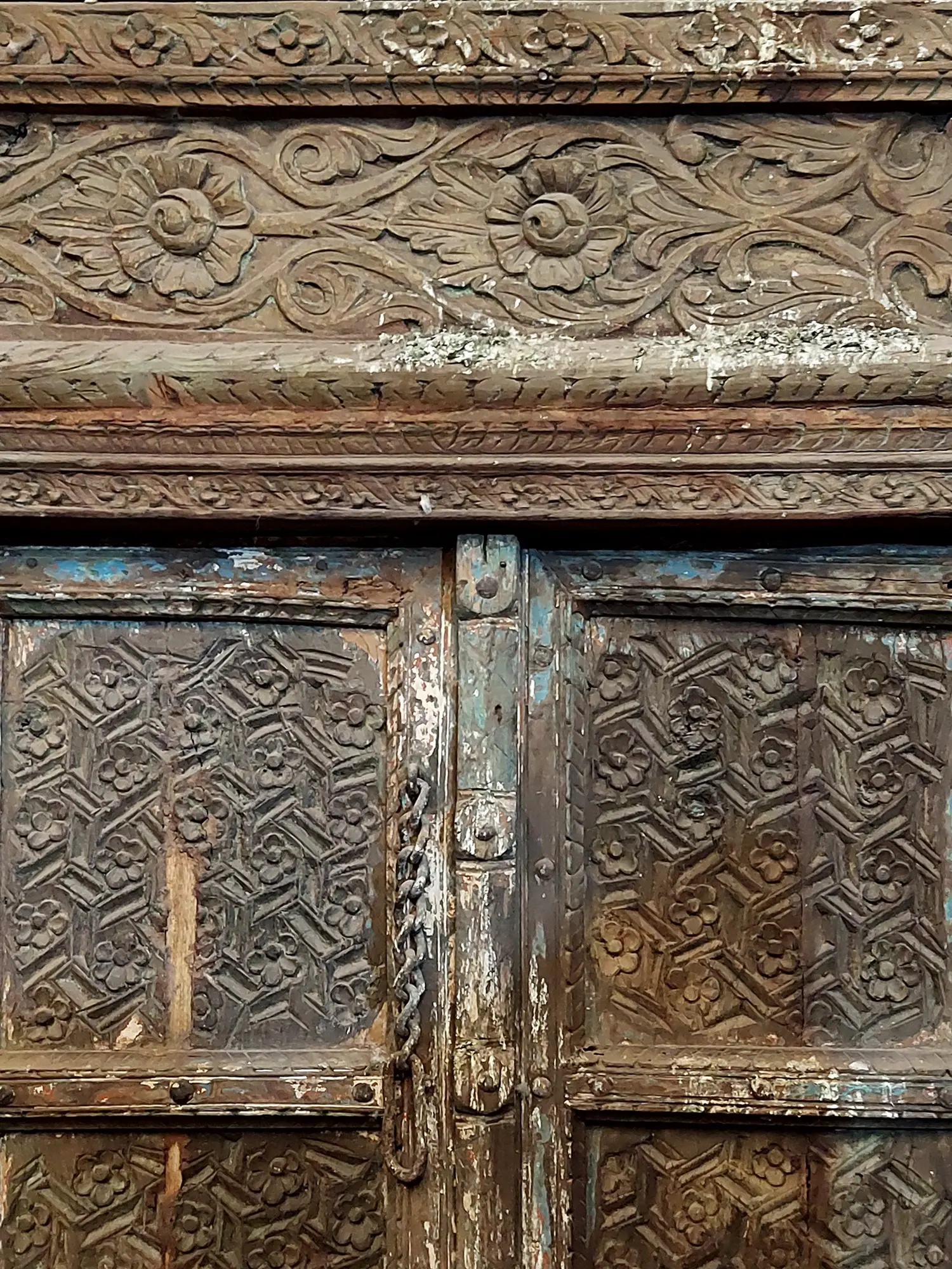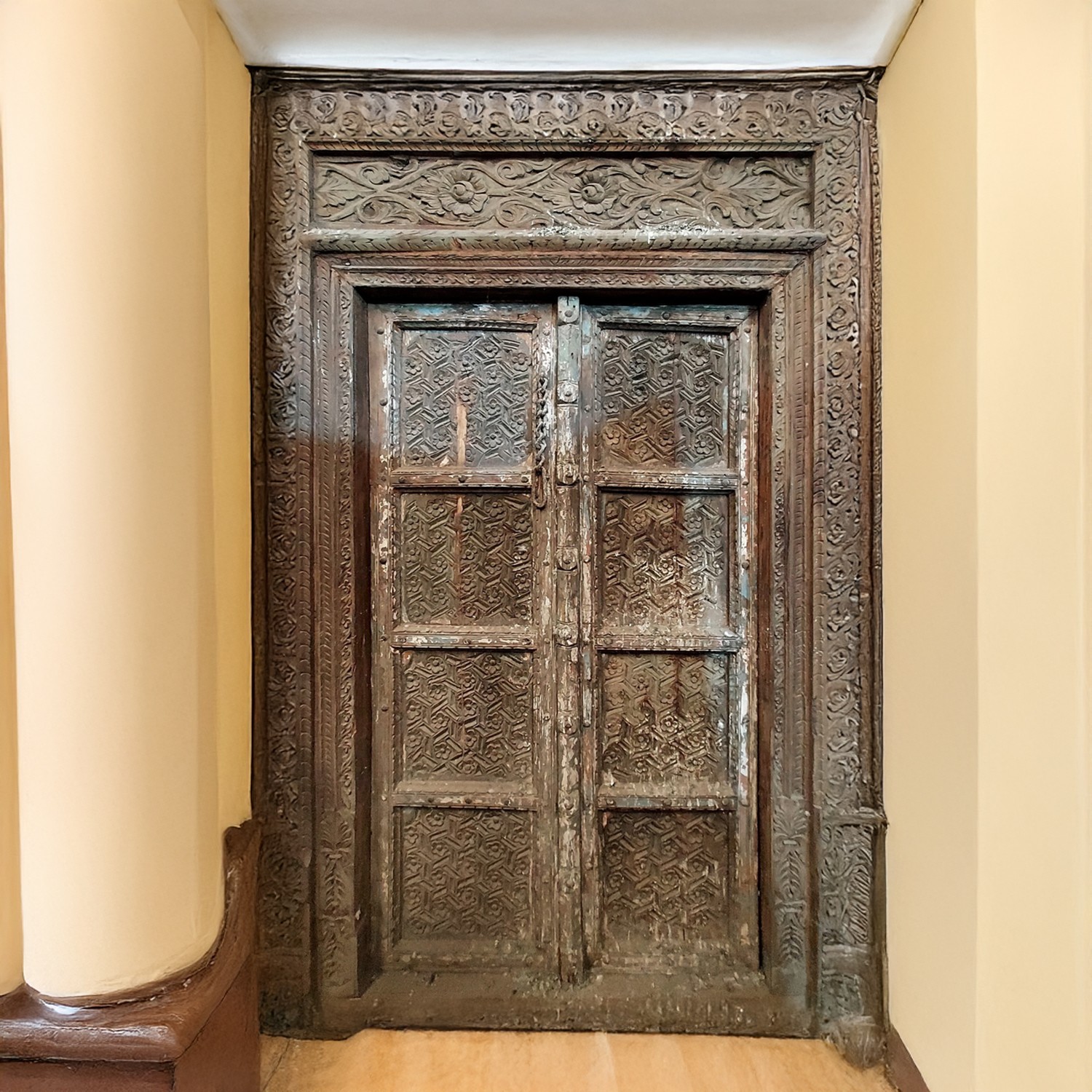 Every inch of this door tells a story. The meticulous carvings reveal skilled craftsmanship, with floral motifs adorning the frame and intricate patterns embellishing the panels. The wood exhibits a beautiful patina, evidence of its age and history. Subtle variations in color and texture enhance the authenticity and create a visual depth that cannot be replicated.