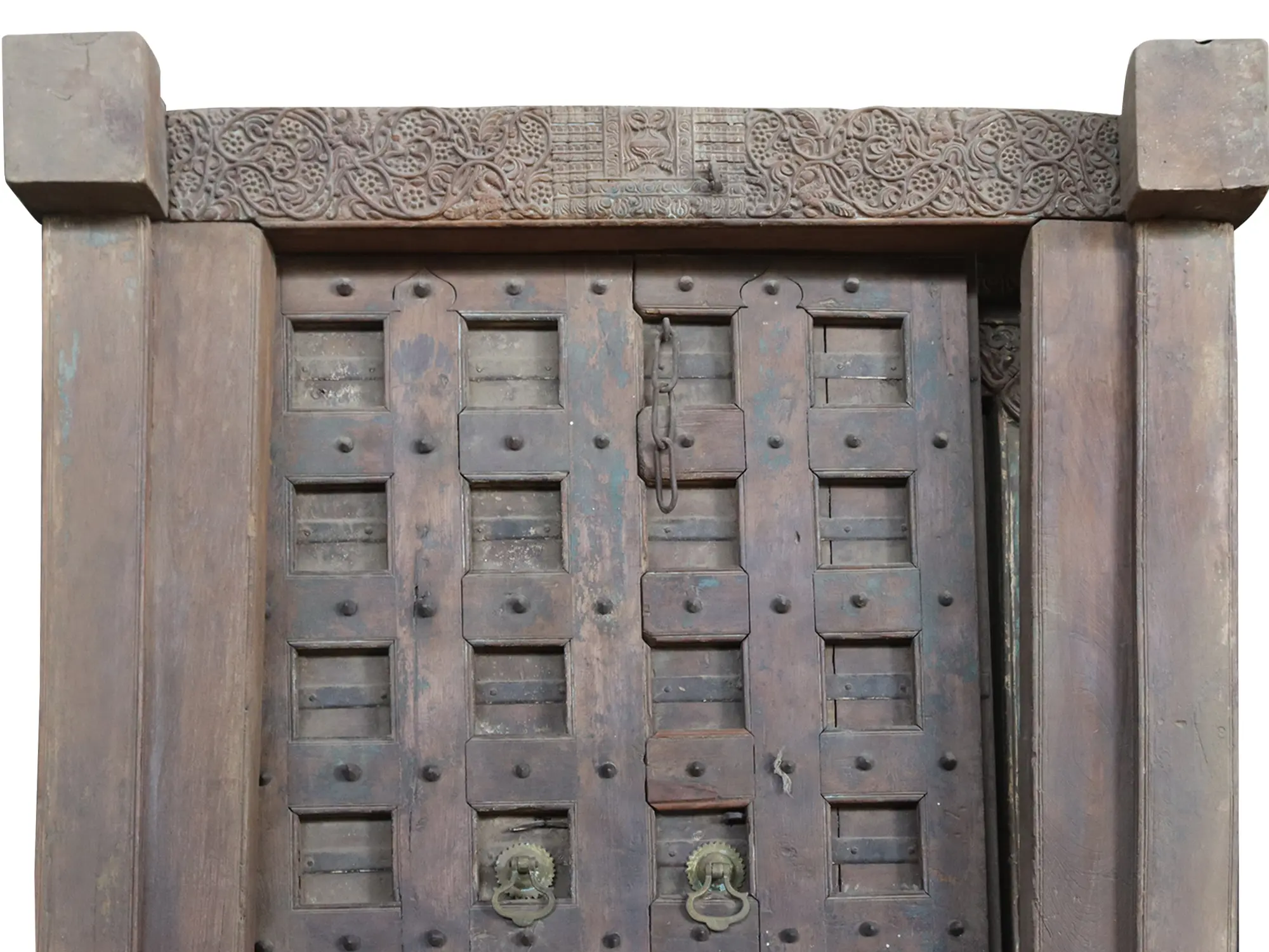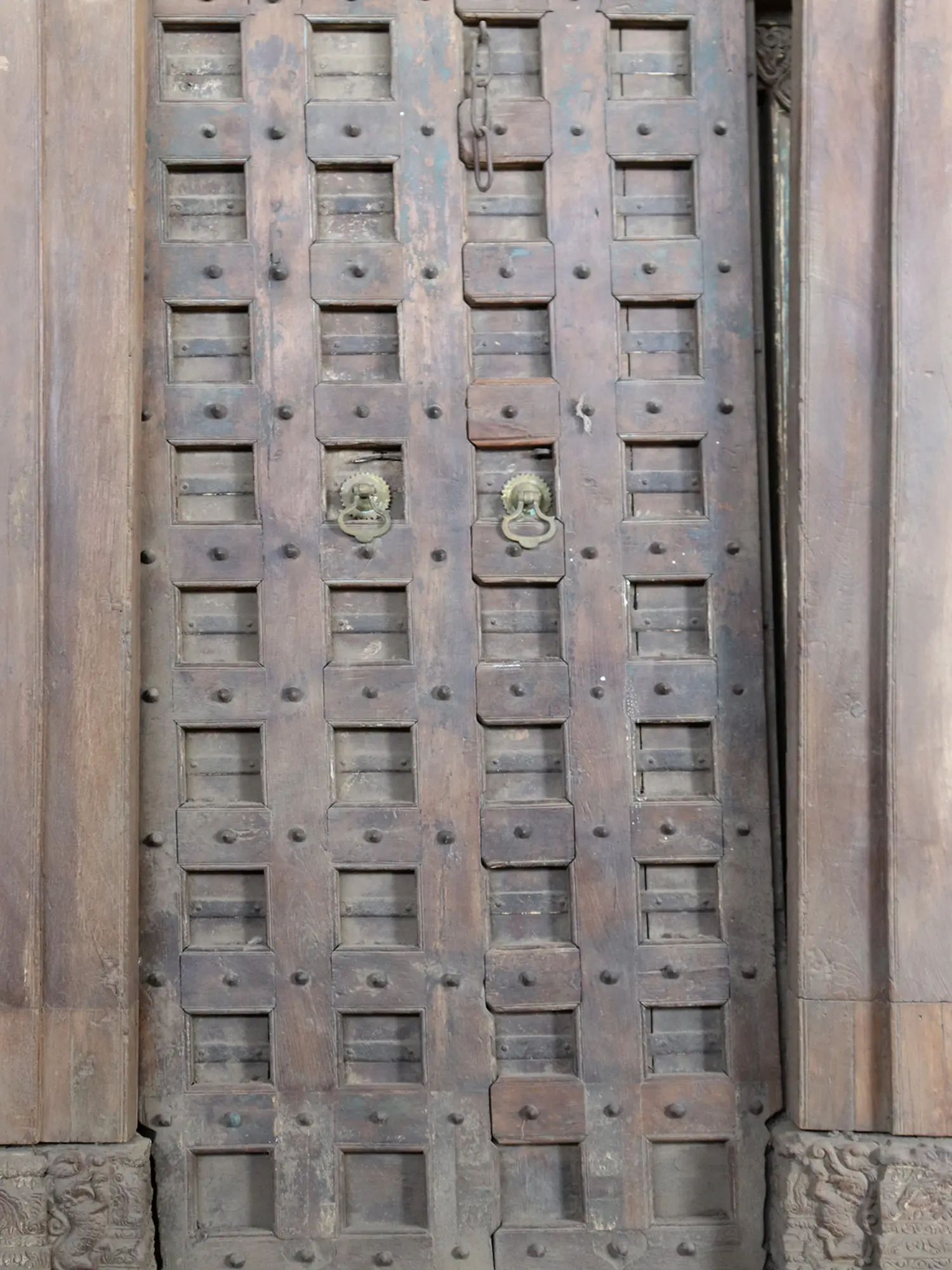 This stunning creation, created with careful skill, is unquestionably a portal to another realm. It is embellished with a mesmerising square design that gives depth and visual intrigue to its body and has a captivating brown finish that oozes warmth and elegance. A traditional Kundi with a delicate chain delicately graces the entrance at the top, symbolising protection and history. The door handles feature a beautiful Jyoti chakra pattern that reflects a balanced blend of spirituality and beauty. The upper portion of the door features elaborate Bael Buta motifs that are artistically carved in wood and represent divine favours and prosperity. At each corner of the lower panel, beautiful Gaja (elephant) and Makara (mythical creature) sculptures represent strength and grace. This door with an earthy vibe is ideal for your home and will stand guard for centuries.