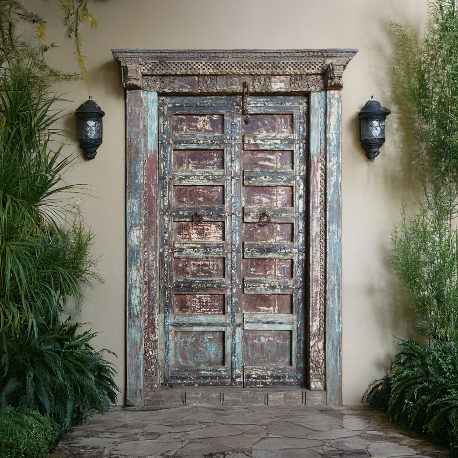 This door was handcrafted in Jodhpur, India by skilled craftsmen as a representation of the rich cultural legacy of the area. Solid wood planks have been carefully chosen and masterfully assembled to form a stunning pattern that captures the exquisite elegance of Indian design. The door’s authenticity and rustic attractiveness are enhanced by the aged wood, which shows the effects of time.