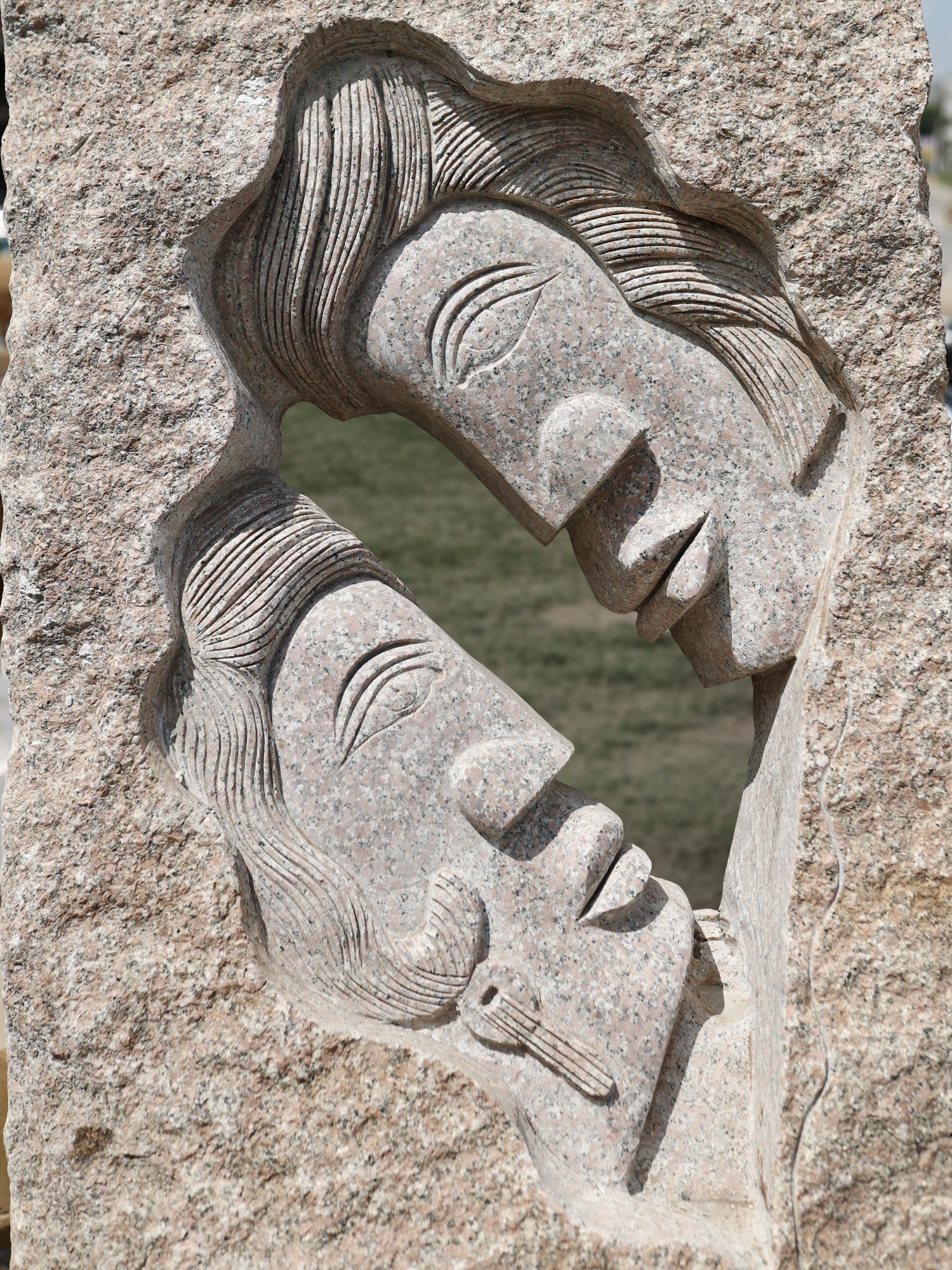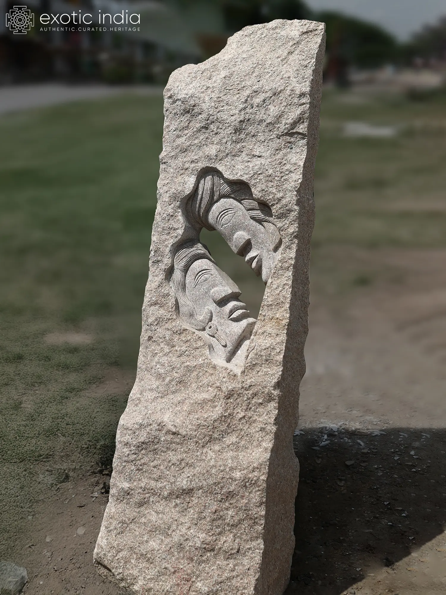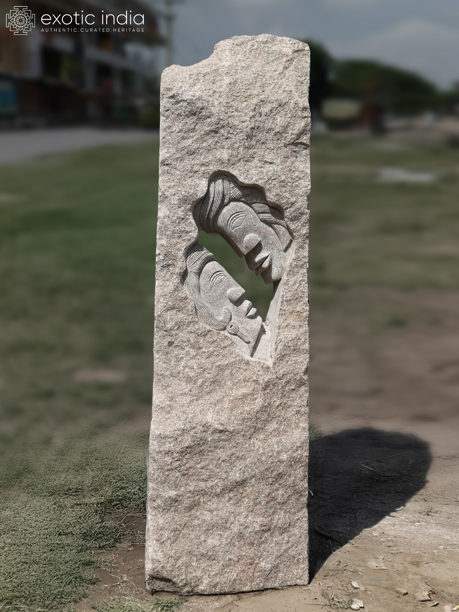 This magnificent stone sculpture embodies the profound and enduring connection between two souls. Standing at an impressive height, it commands attention with its raw, natural beauty and the exquisite artistry that has been meticulously chiseled into its form. The rough, unpolished texture of the stone provides a powerful contrast to the delicate rendering of the intertwined faces, highlighting the organic and elemental nature of love. It speaks of a bond that is as solid and lasting as the material from which it is carved, a testament to a love that weathers all storms and stands the test of time.