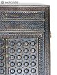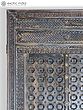 The entire surface of this magnificent door is adorned with a symphony of patterns and textures. The central panels are a breathtaking display of geometric precision, featuring a repeating motif of interlocking squares, each further embellished with smaller, central accents and subtly placed metal studs. These elements create a mesmerizing visual rhythm that draws the eye and invites closer inspection. Surrounding these central panels, the frame itself is a canvas of elaborate carvings. Delicate floral motifs and scrolling vine patterns weave their way along the edges, providing a beautiful contrast to the bolder geometric design of the door panels. The topmost section of the frame features a more robust, band-like carving, adding a further layer of visual interest and depth. The combination of these diverse patterns results in a piece that is both visually dynamic and elegantly composed. ––––––––––