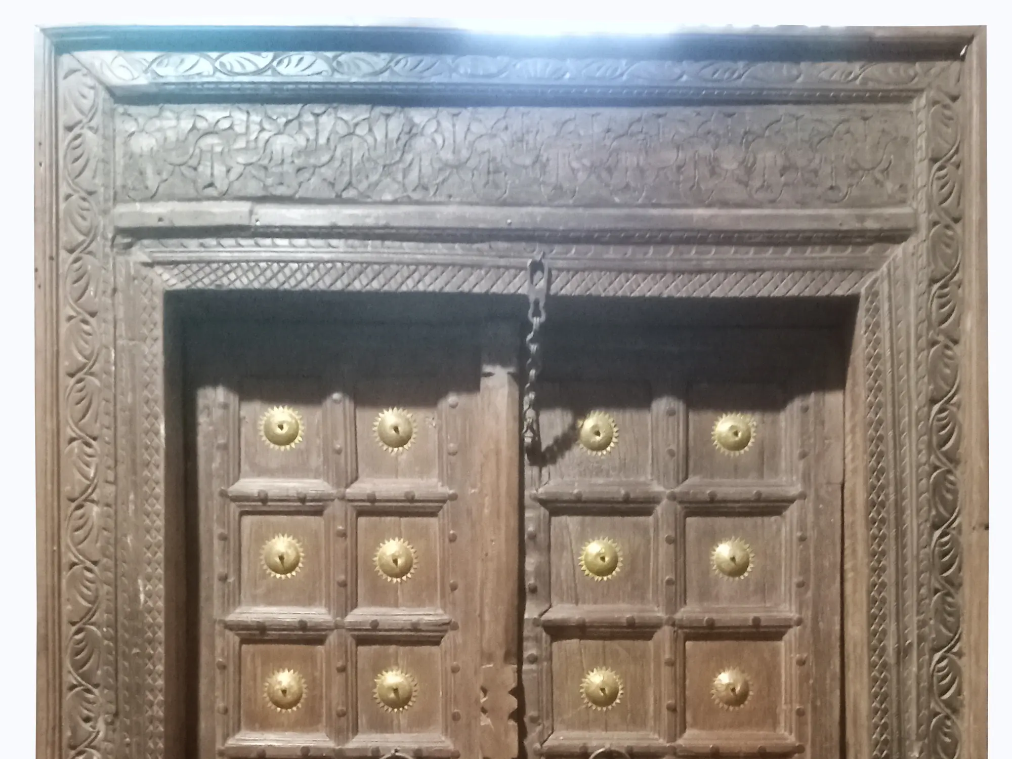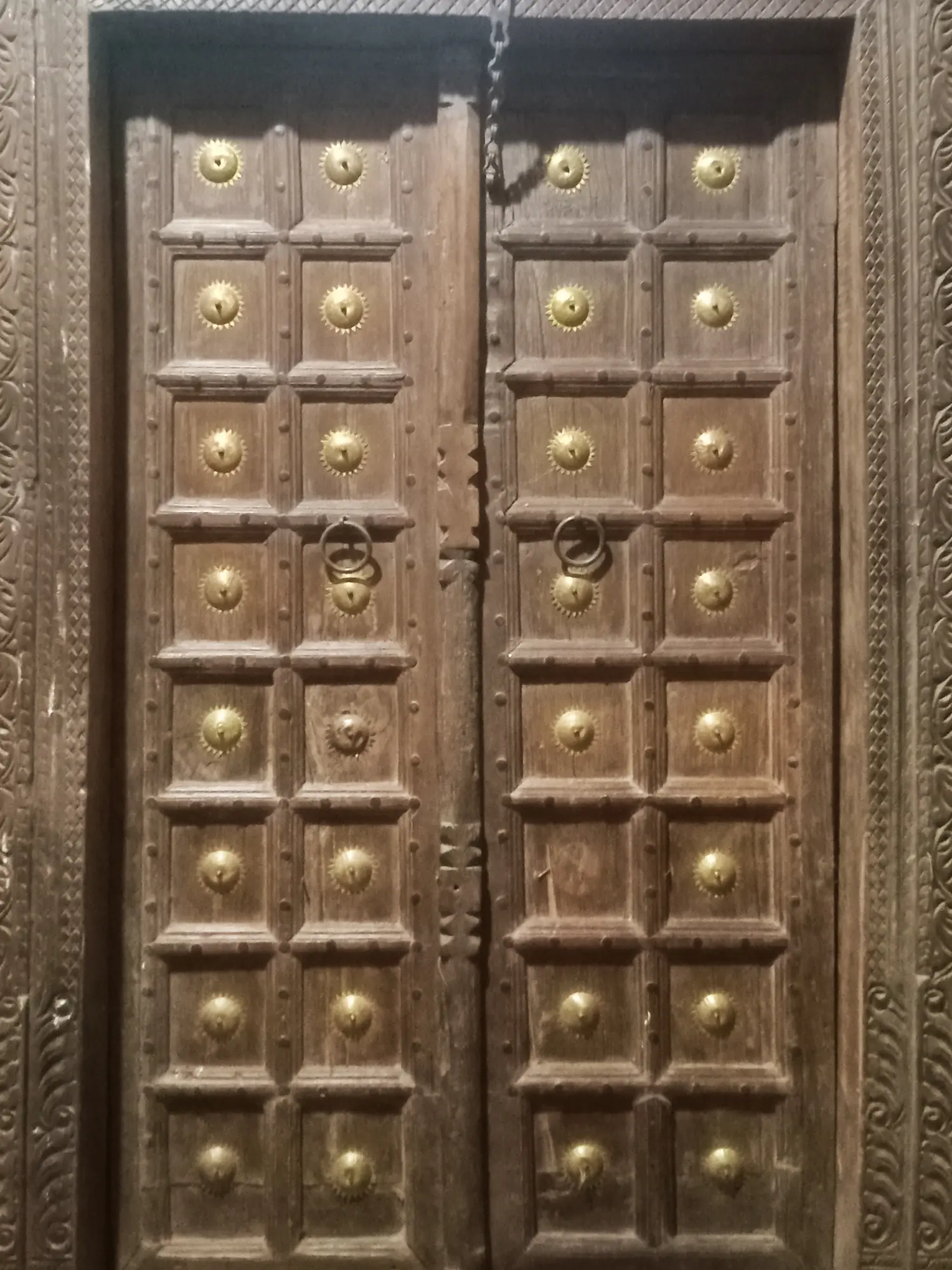 This beautiful vintage door is designed to be fixed as the entrance gate of your sweet home. If you closely observe the intricacy of the carvings done on this door by skilled carpenters, you will be intrigued by the clarity of each detail. The traditional motifs and patterns created on the wooden frame are fascinating. The main door has been given the design by forming squared panels. Each panel has a metallic embellishment in the center. The door also bears two metallic round-shaped handles to open or close it.