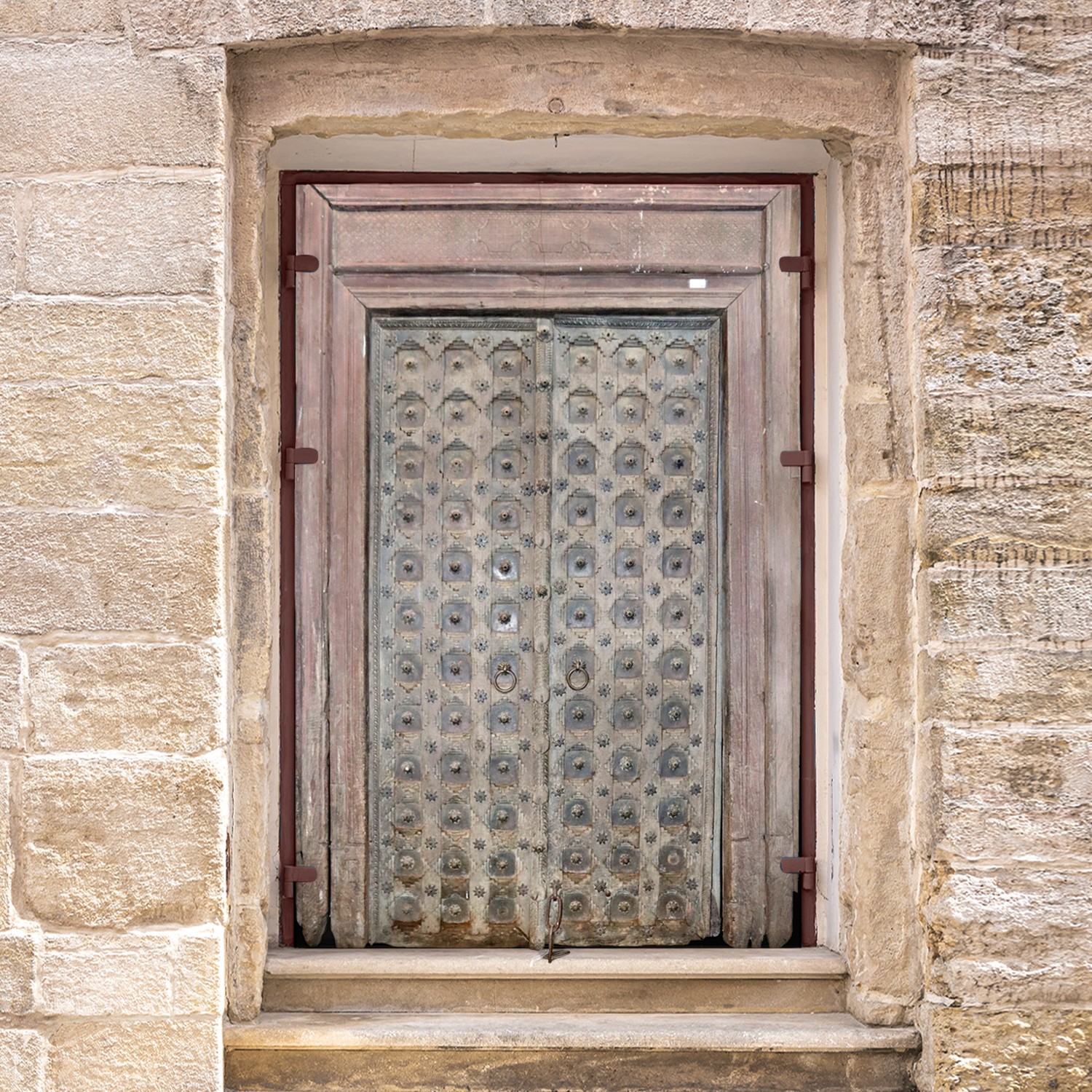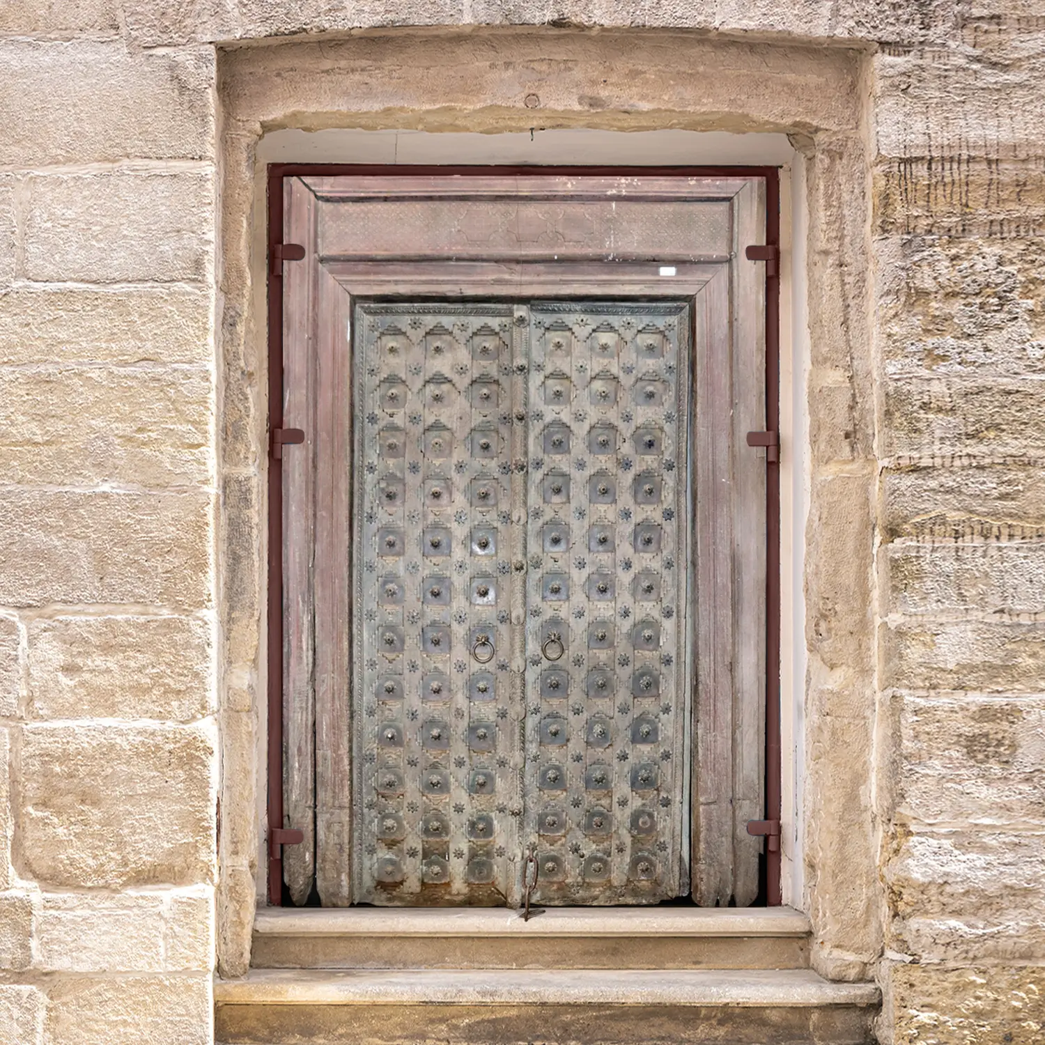 This double door antique door from Jodhpur, Rajasthan, is the perfect match for your palatial home. It will not only enhance the doorway of your home but will also uplift the interior. It comes with a broad wooden frame made of sturdy wood that lasts many decades without getting decayed or destroyed. The main door is decorated with a block pattern which is further embellished with metal dotted stars giving it a unique and gorgeous look.