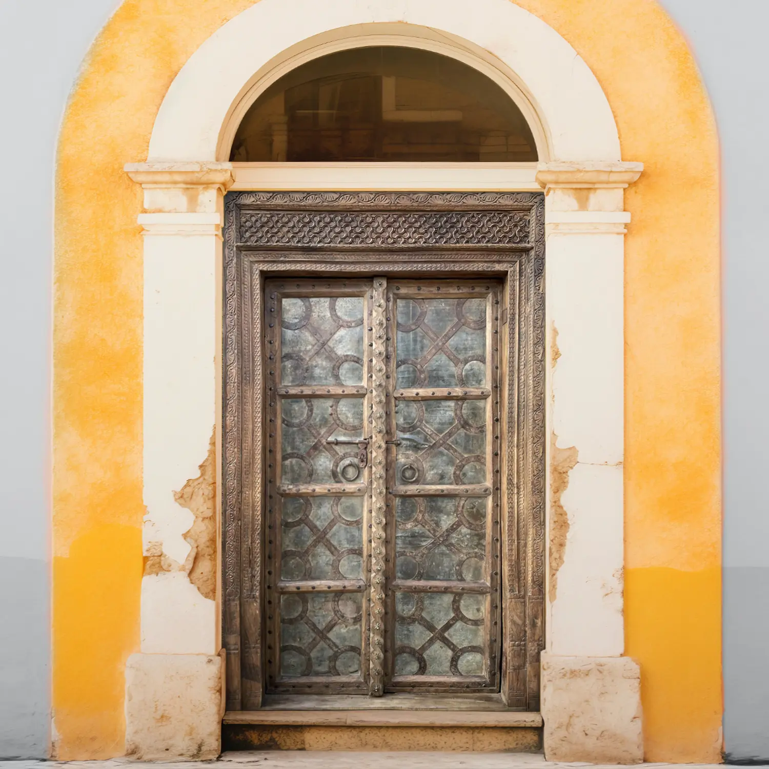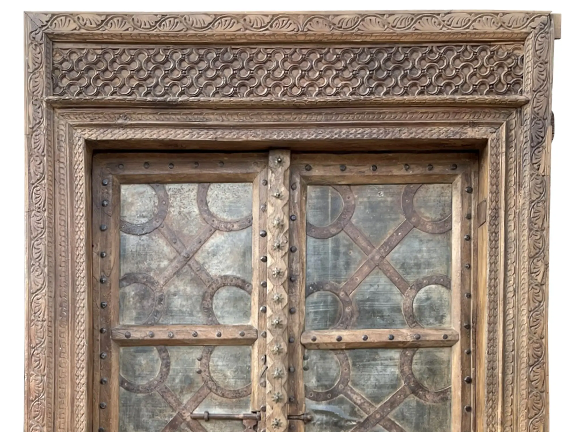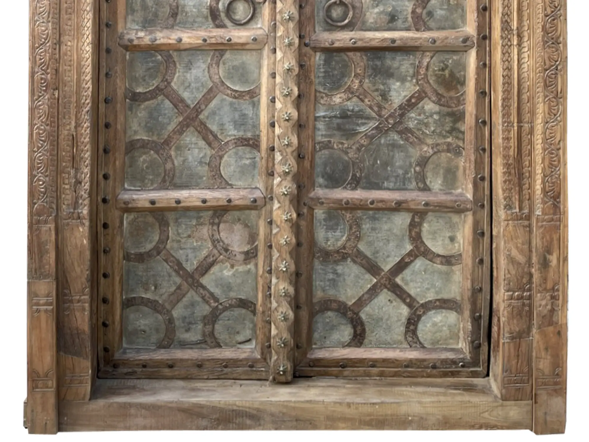 Immerse yourself in a vintage affair with the majesty of a grand entrance made of meticulously carved wood with antique hardwood floors. His hair is a wonderful display of a wonderful grid system, a beautiful grid connected to history. The ornate headboard beckons with a melody of decoration, each stroke telling a forgotten tale of greatness. The solid sections are still solid, with distinctive details of decoration. Lotus-shaped butas cleanse the spine and create a sense of timeless purity. As a double door, it welcomes you with open arms. An ancient blue tint polish hugs her back, whispering ancient words. The rectangular frames have a unique design, an artistic dance of individuality and artistry, reflecting the legacy of the timeless majesty of the door.
