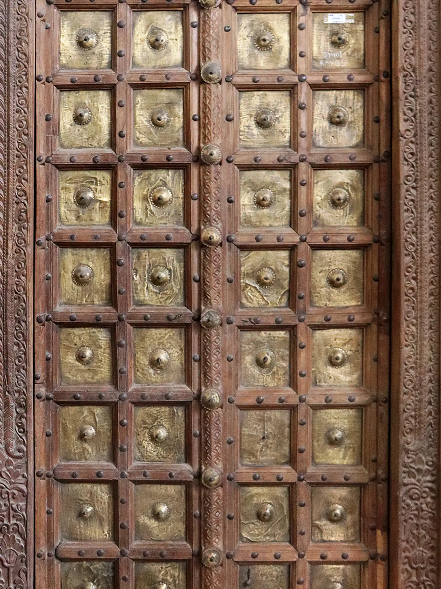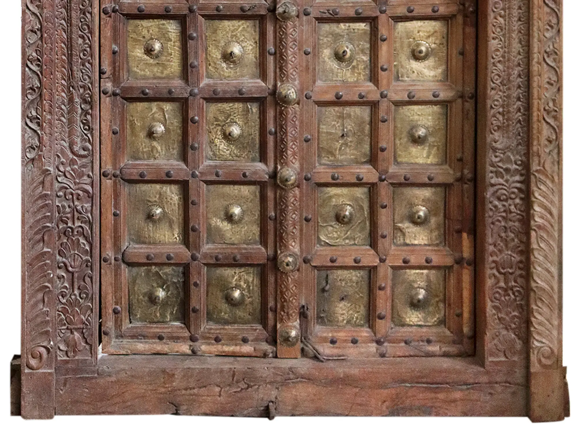 The Large Wooden Carved Square Design Door with Brass Work is a magnificent piece that embodies the timeless beauty of vintage Indian craftsmanship. Crafted from rich and sturdy wood, this door features intricate carvings in a square design, showcasing the artistry and attention to detail of skilled artisans. Enhancing its allure, the door boasts exquisite brass work, adding a touch of elegance and opulence. The brass accents beautifully complement the wooden backdrop, creating a harmonious fusion of materials. This vintage Indian door serves as a captivating entryway, exuding a sense of grandeur and cultural heritage. With its intricate carvings and brass embellishments, this door becomes a focal point, inviting admiration and appreciation for the artistic traditions of India's rich architectural history.