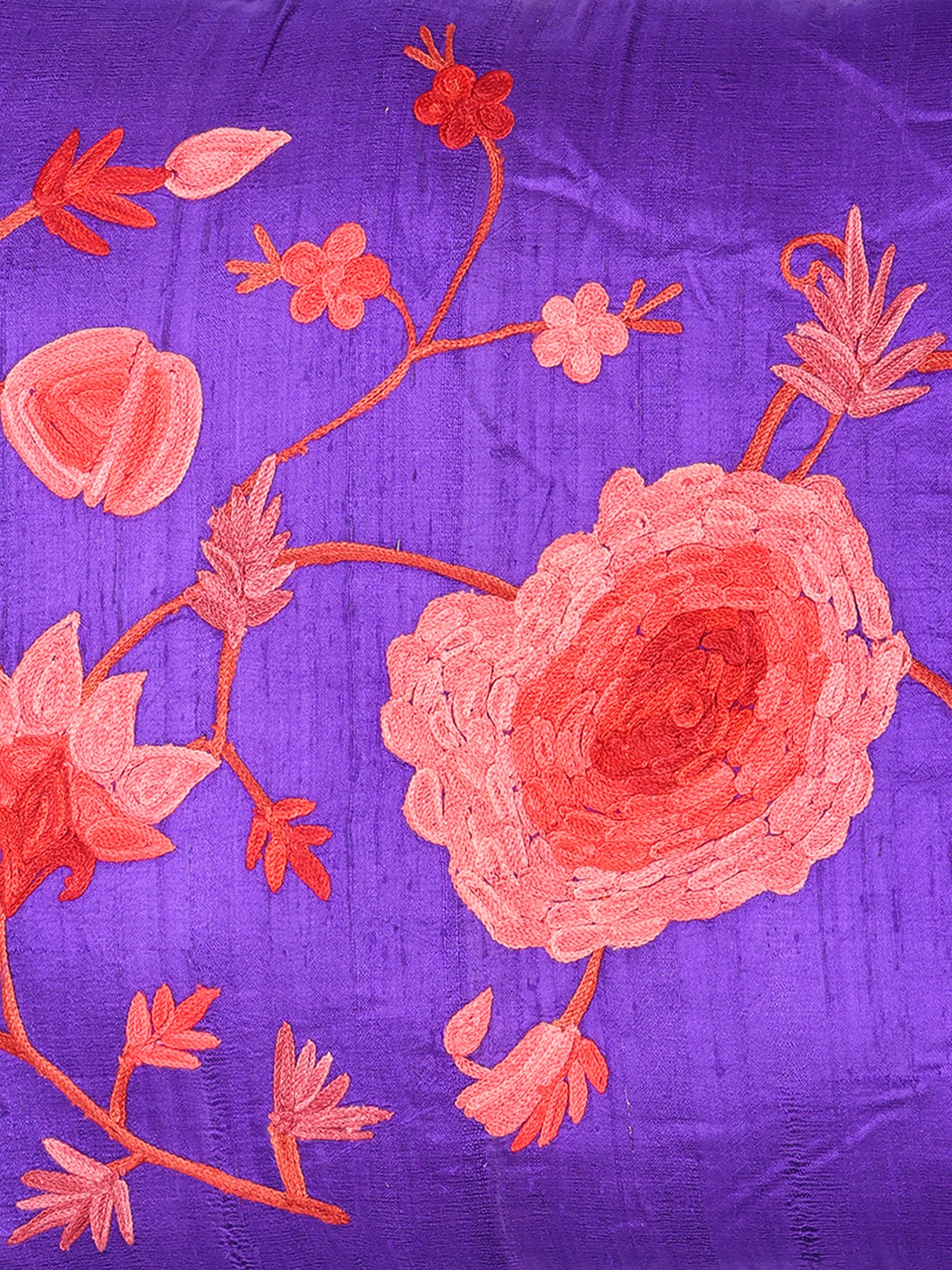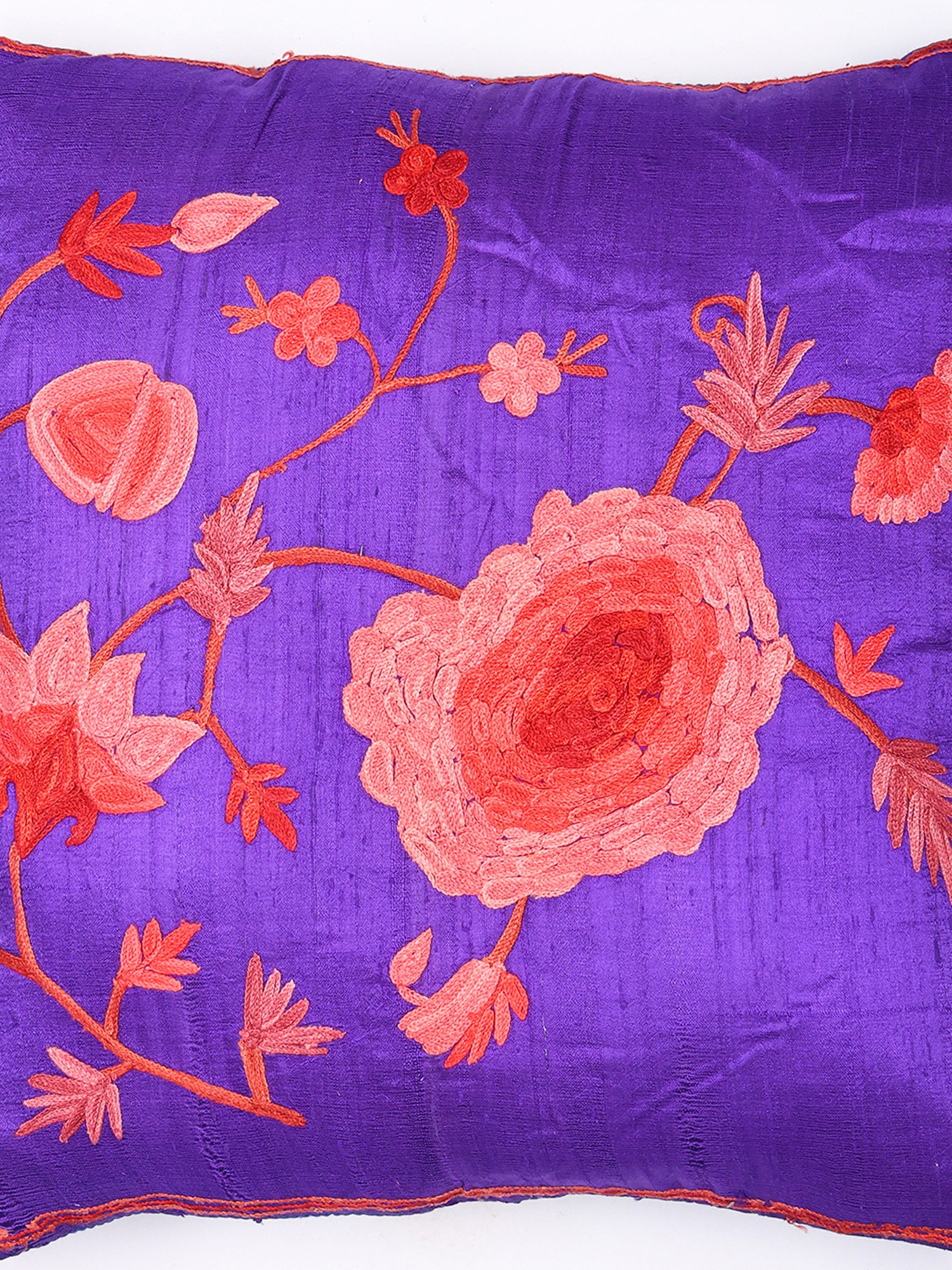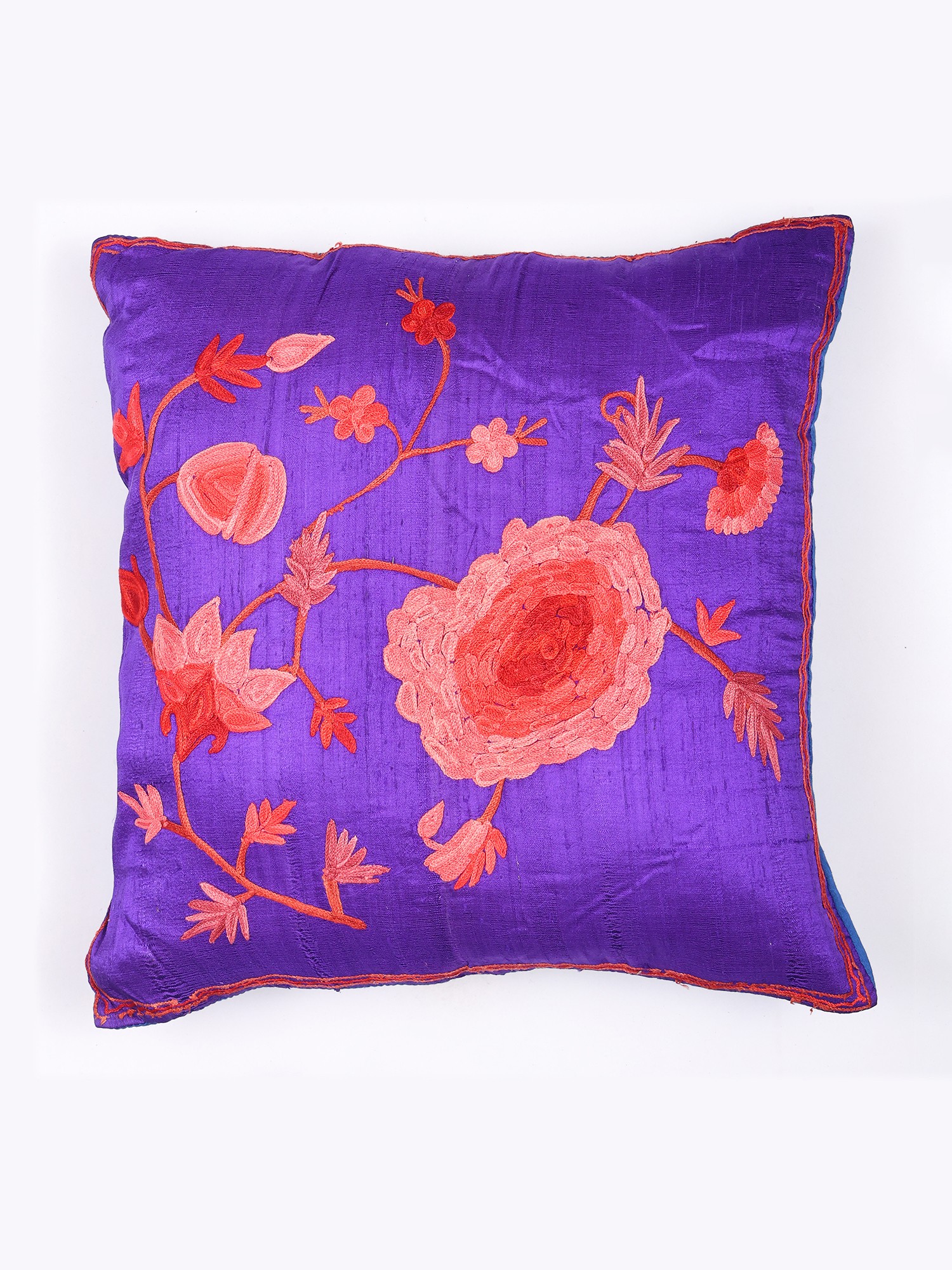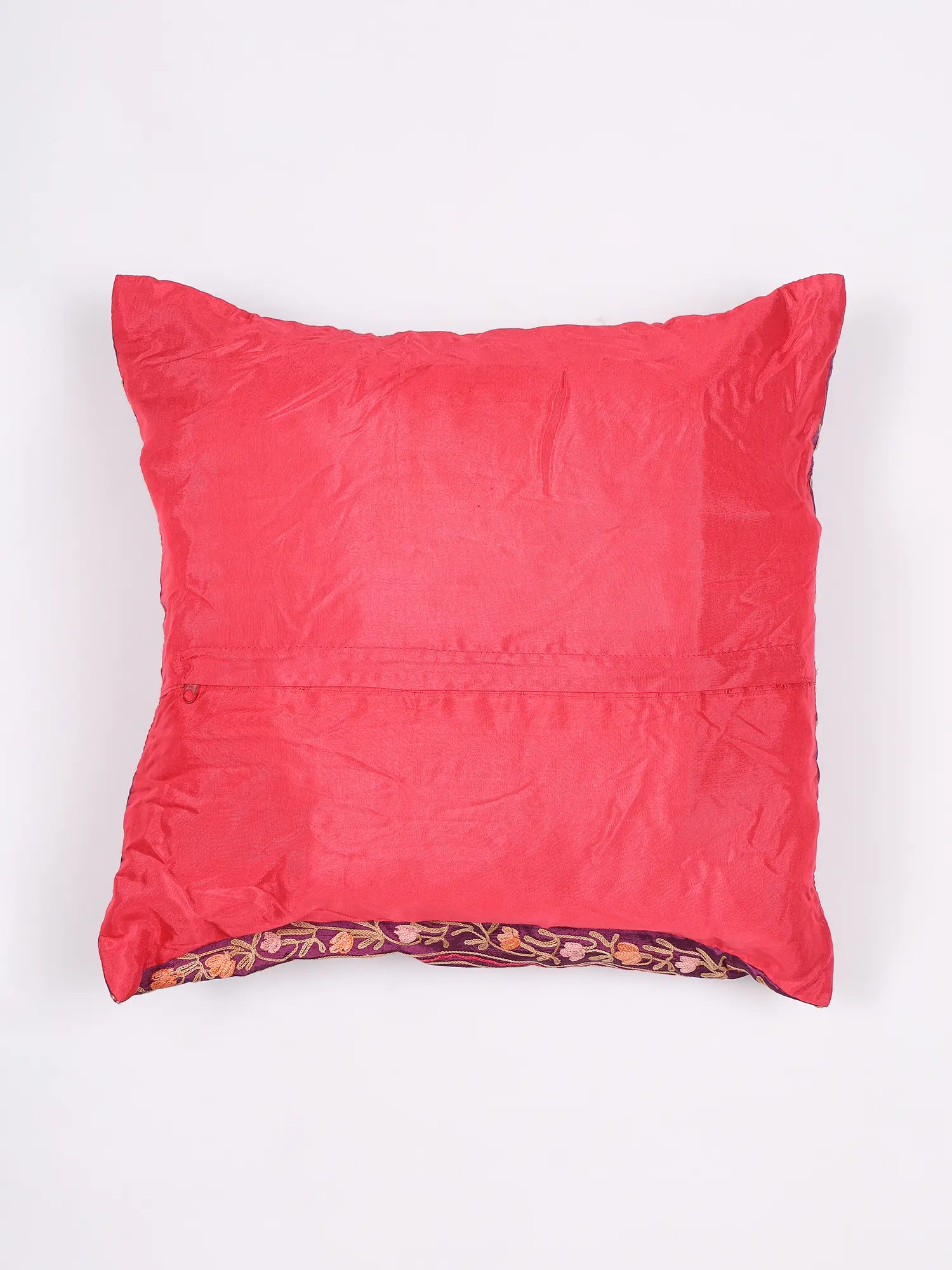 The rich, jewel-toned art silk serves as a stunning backdrop for a symphony of delicate floral motifs and swirling vines, rendered in contrasting threads. Subtle variations in color and the gentle shimmer of the silk create a dynamic visual interest that captures the light beautifully. The 16-inch square dimensions make it a versatile accent, perfectly proportioned to add a touch of artistry to your furnishings.
