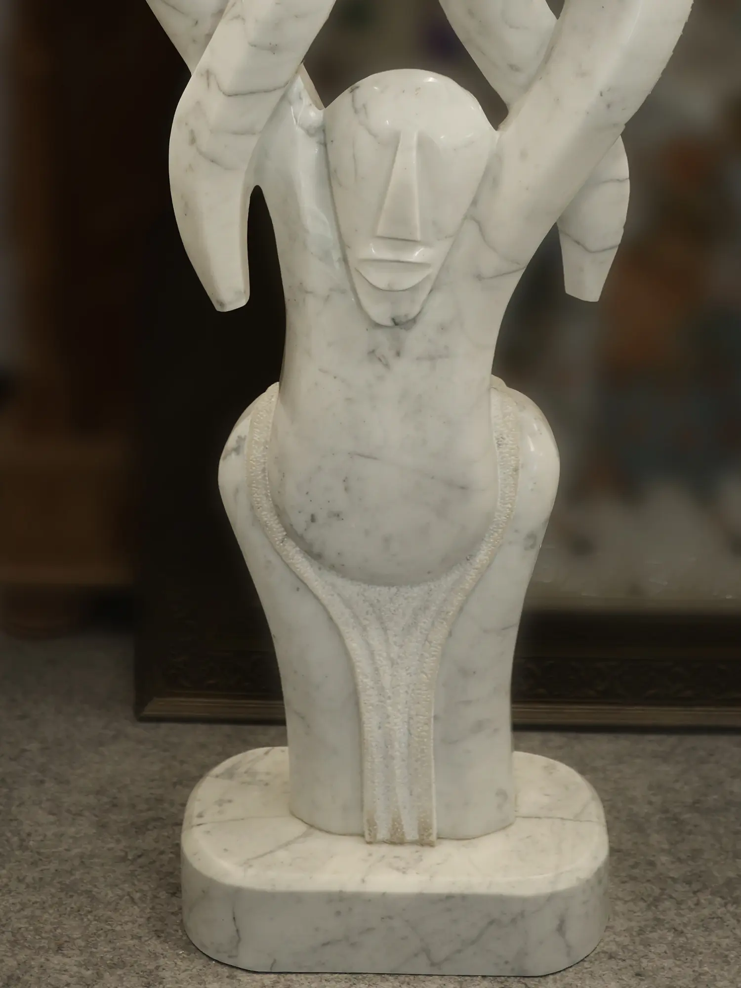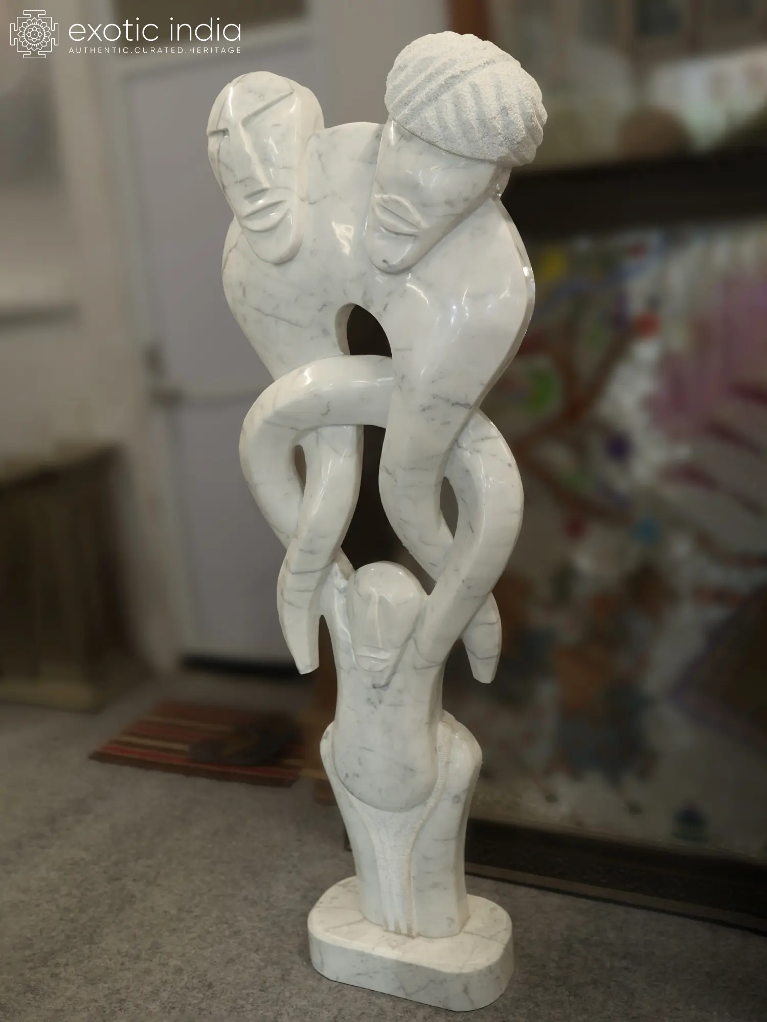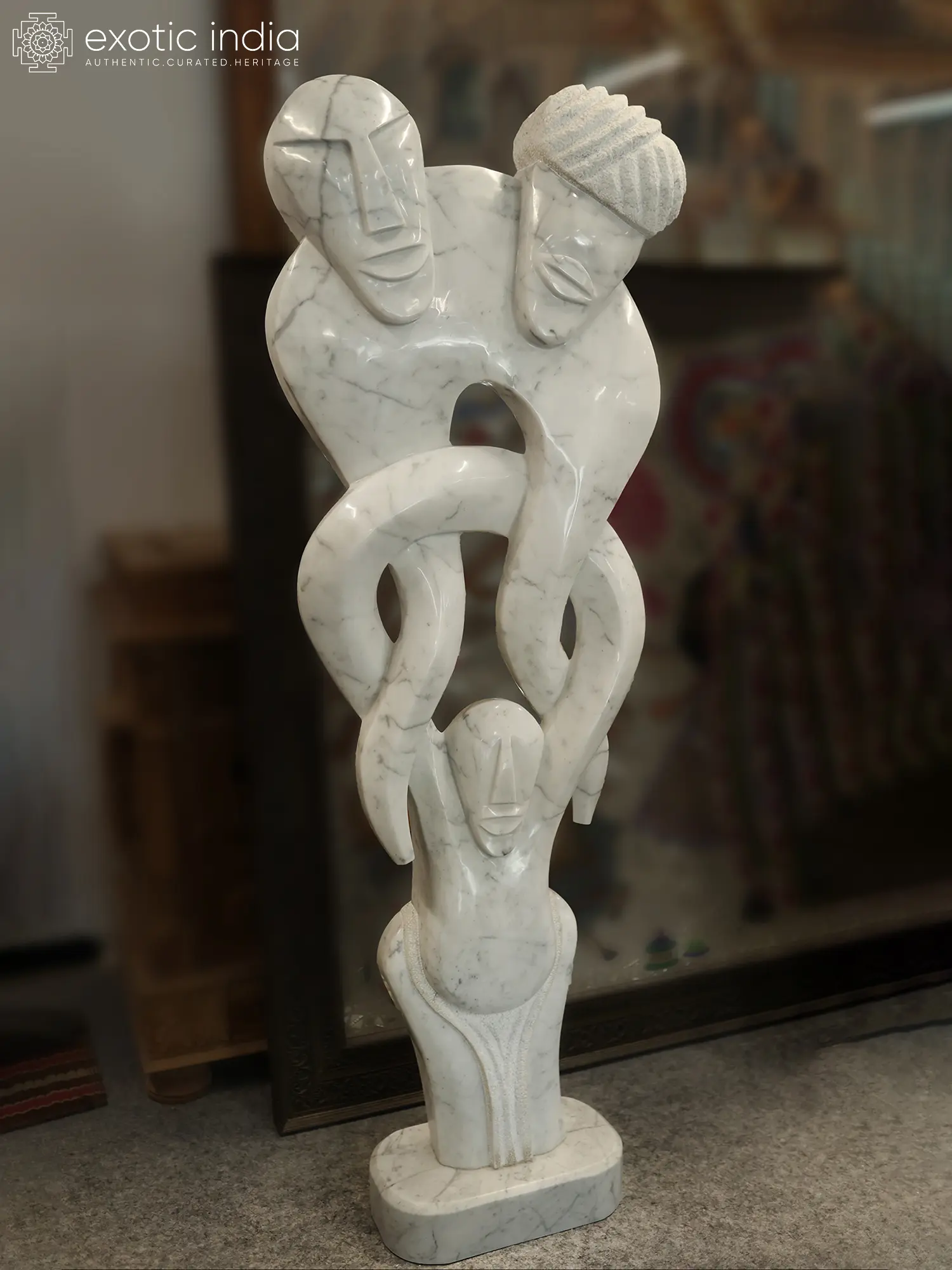 Carved in marble, the smooth planes and open space allow light to travel through the work, softening its solidity and giving breath to the interwoven silhouettes. The upward thrust of the composition conveys growth, aspiration, and generational flow.