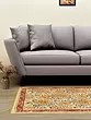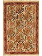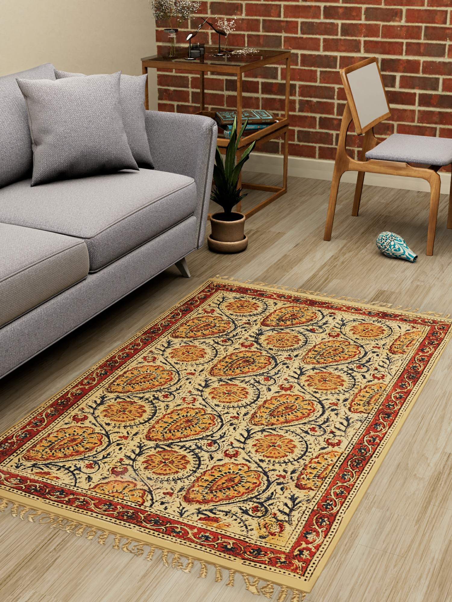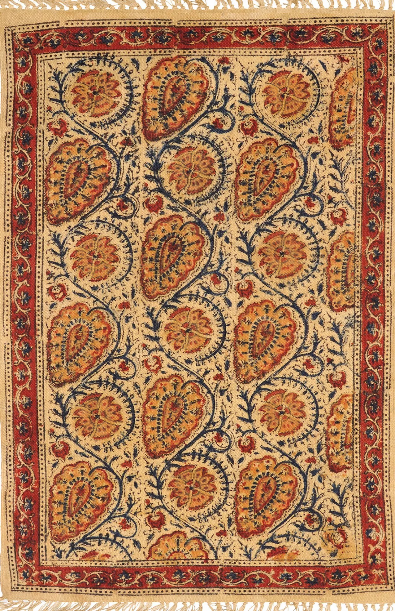 Large pastel-coloured flowers of an unusual, fruit-like shape fill up the entire surface area of this carpet, hemmed in by a distinct red printed border. Long-winded, curvaceous lengths of foliage and flowers occupy the pale cream spaces amidst them. This one-of-a-kind aasana has been fashioned from thick, smooth jute to provide maximum functionality.