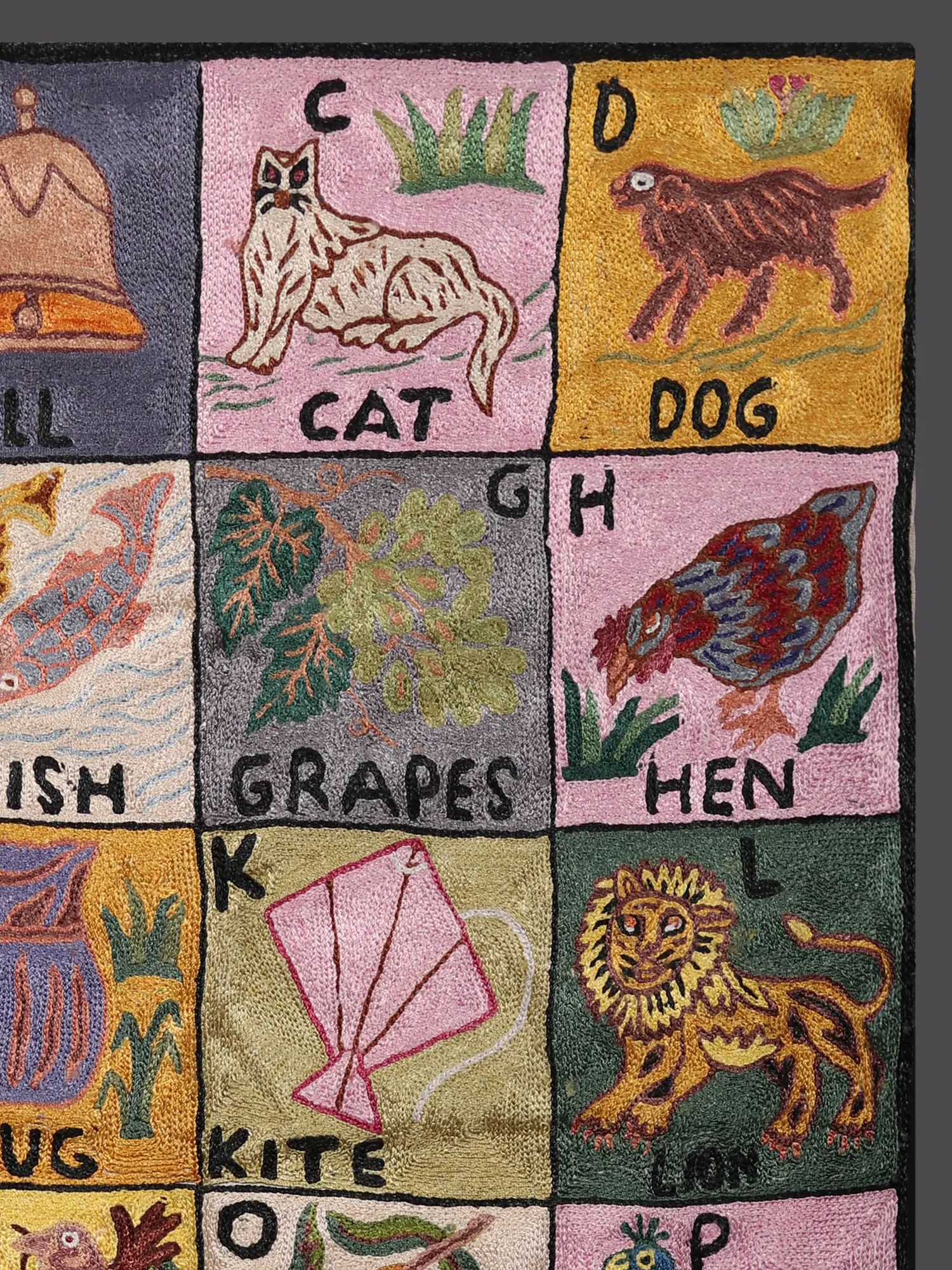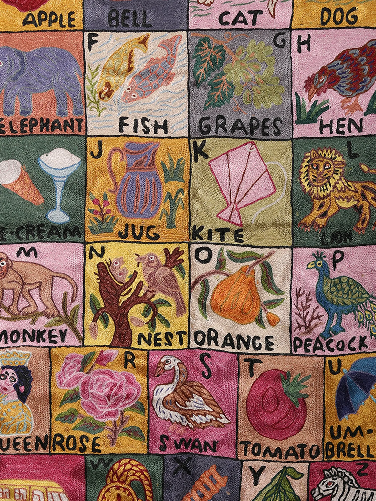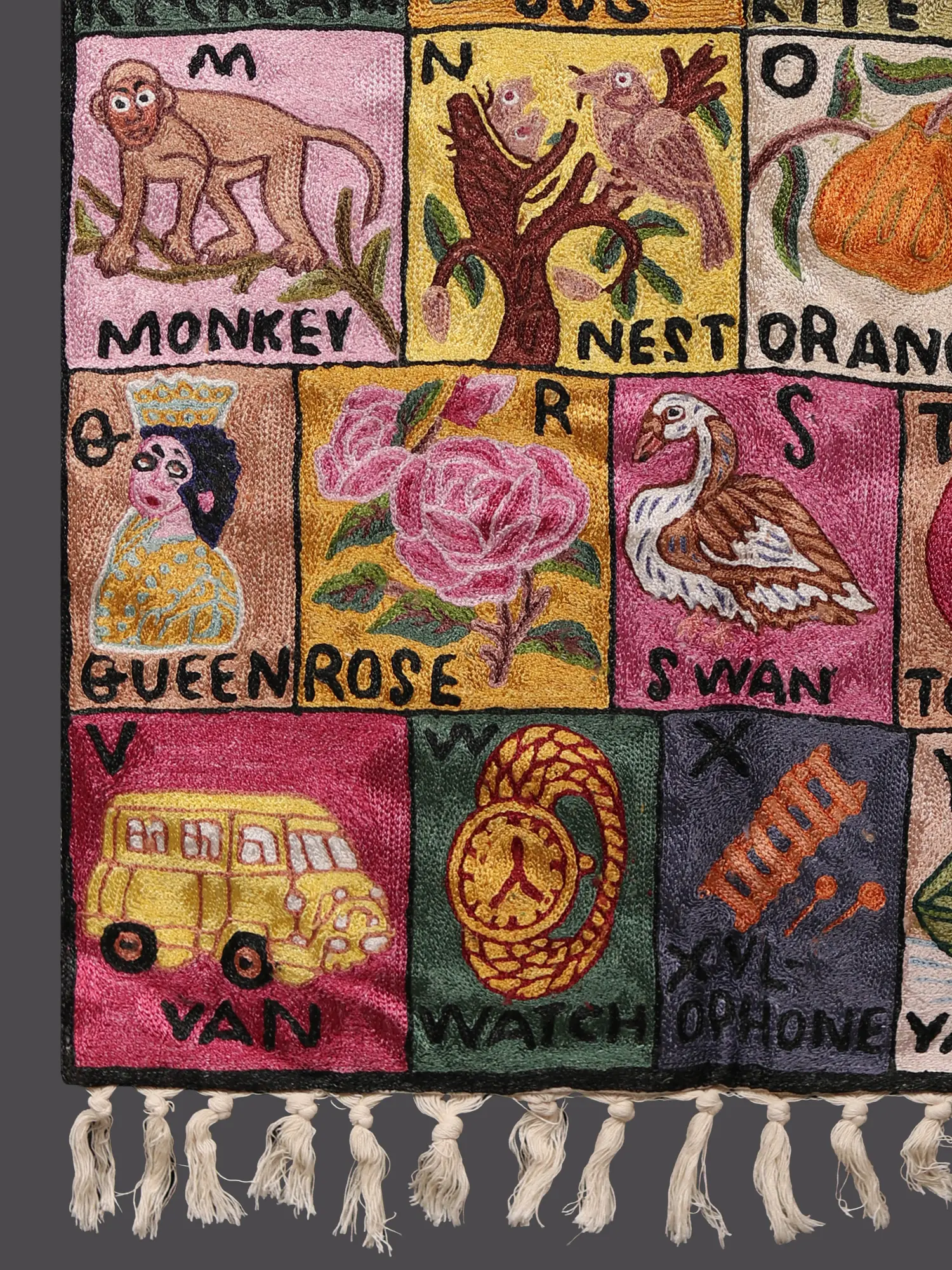 This Alphabetical Nursery Wall Hanging with Multicolor Chainstitched Threadwork serves as a practical and educational accessory for a child's space. It is made by embroidering the silk threads on canvas. Each letter, adorned with vibrant chain-stitched threadwork, not only adds a splash of color to the nursery but also aids in early learning. The alphabetical layout promotes visual recognition and cognitive development, making it an interactive tool for young minds.