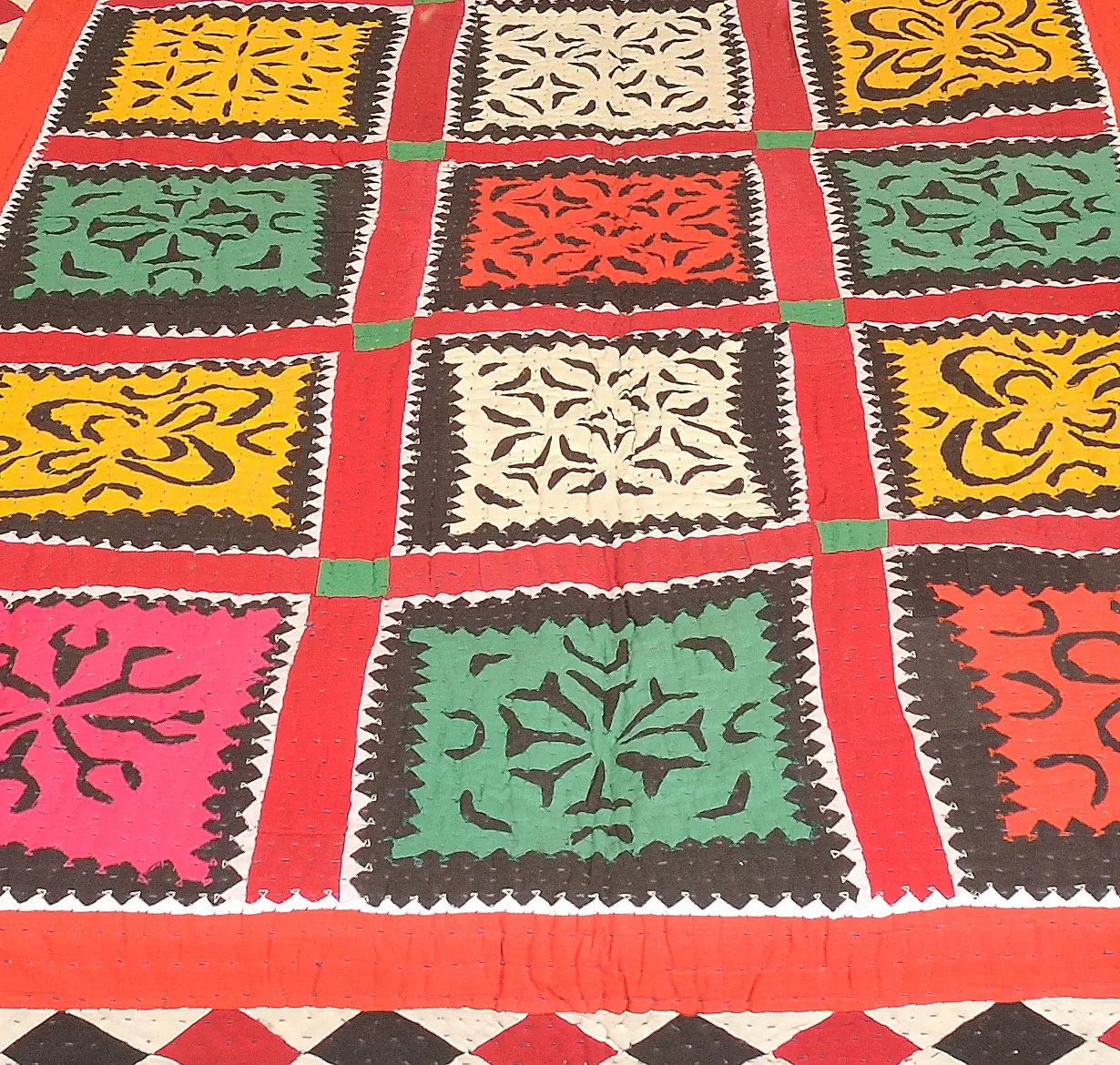 Floral Multicolor Printed Twin Size Bedcover with Kantha Straight Stitch