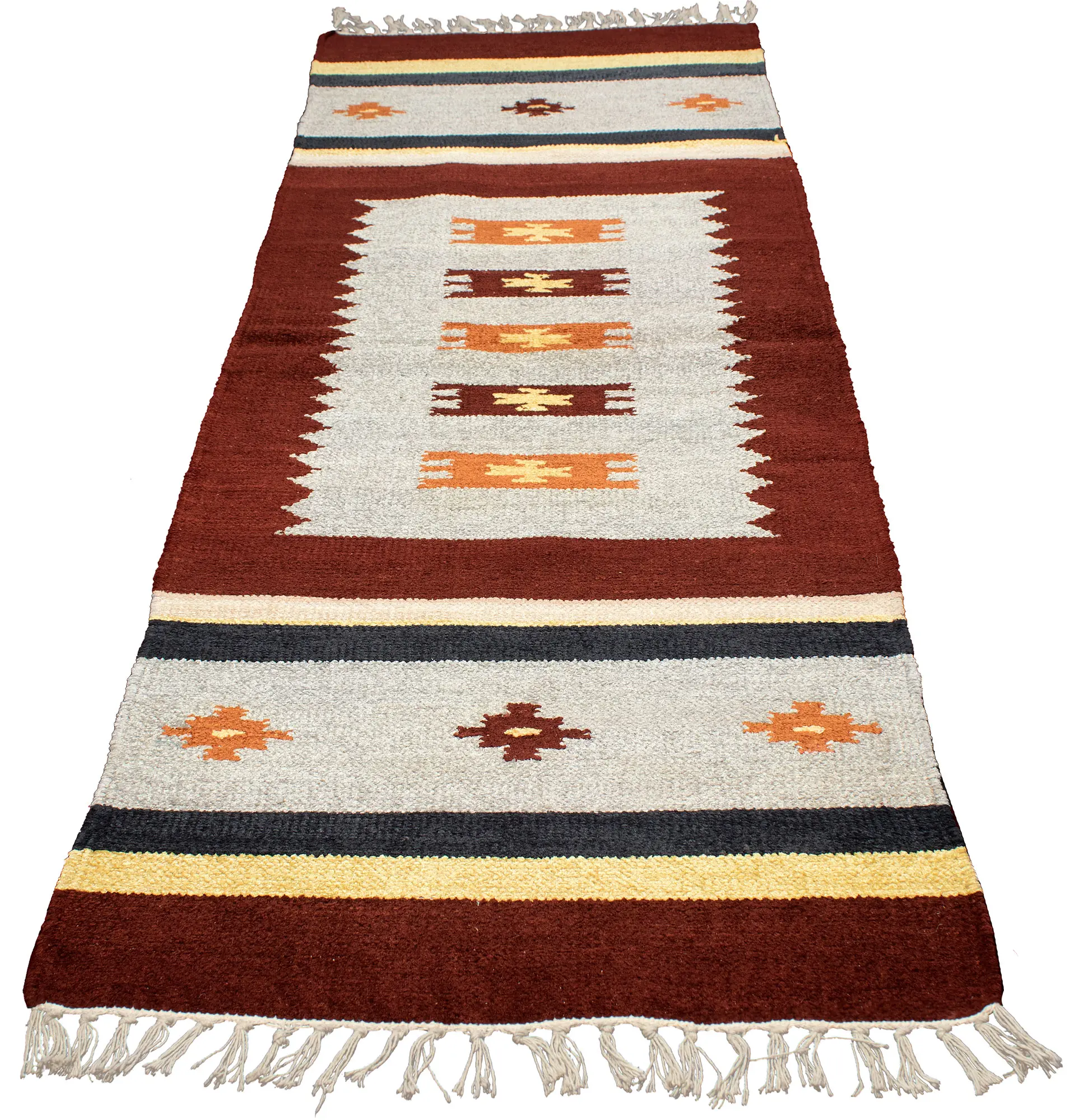 This runner that has emerged from the endemic handlooms of Sitapur is bound to add a hint of the regal and the sophisticated to your home. The pearly grey and loamy brown colour combination, dotted with interesting, geometric motifs, make for a one-of-a-kind piece of home decor. Its perfect symmetry, understated yet dense silvery tassels along the edges, and sheer exquisiteness make this a buy no homeowner could go wrong with.