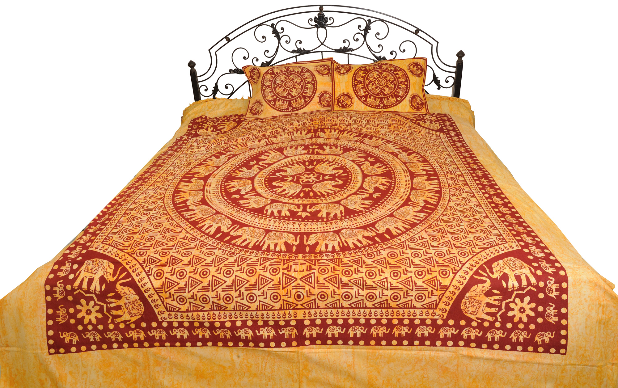 Honey-Yellow Batik-Dyed Bedspread from Pilkhuwa with Printed Flowers