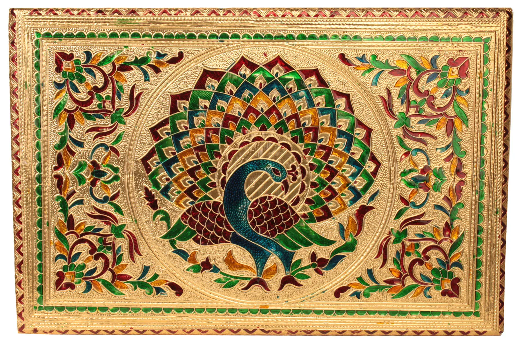 Chowkis, or pedestals, are commonly used for sitting. Deities are given more elaborate chowkis. This brass Chowki, embellished with an exquisite Meenakari work showing a dancing peacock, is a work of art created specifically for the graceful placement of Gods and Goddesses. Bael Buta's equally lovely Meenakari work adorns both sides of the dancing peacock. The dancing peacock is traditionally used to depict growth and happiness. It is a graceful figure often used as a sacred image for objects designed for deities. The royal colors of blue, green, and red Meenakari emphasize the chowki's regality. This Chowki is a one-of-a-kind ritual object that may attract both celestial and human attention.