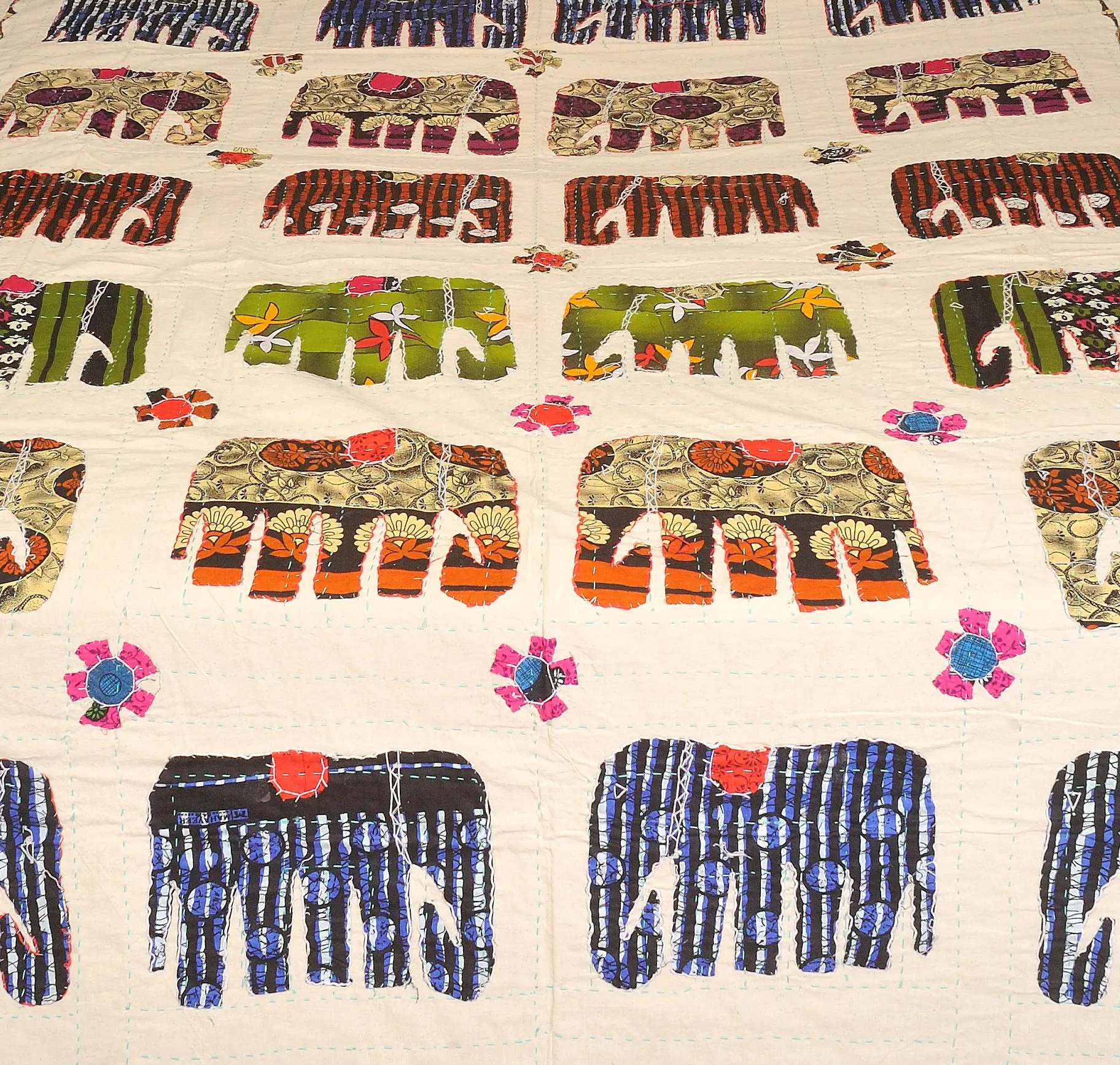 This piece of home decor is a cross-cultural collaboration of two fine arts of Applique with Kantha Stitch Embroidery made into Jodhpur Bedcover. Applique consists of carefully chosen pieces of colorful fabric skillfully sewn onto the backdrop of darker material. There are regal elephants as well as blooming flowers appliqued that will add splashes of colors and culture to the bedroom decor. The spaces between these complex forms are elegantly filled by the Kantha Stitch, comprised of straight lines. Bordering the masterpiece is the double border of the bed cover that emphasizes its beauty. This piece will elevate any decor with a contemporary take on traditional art.