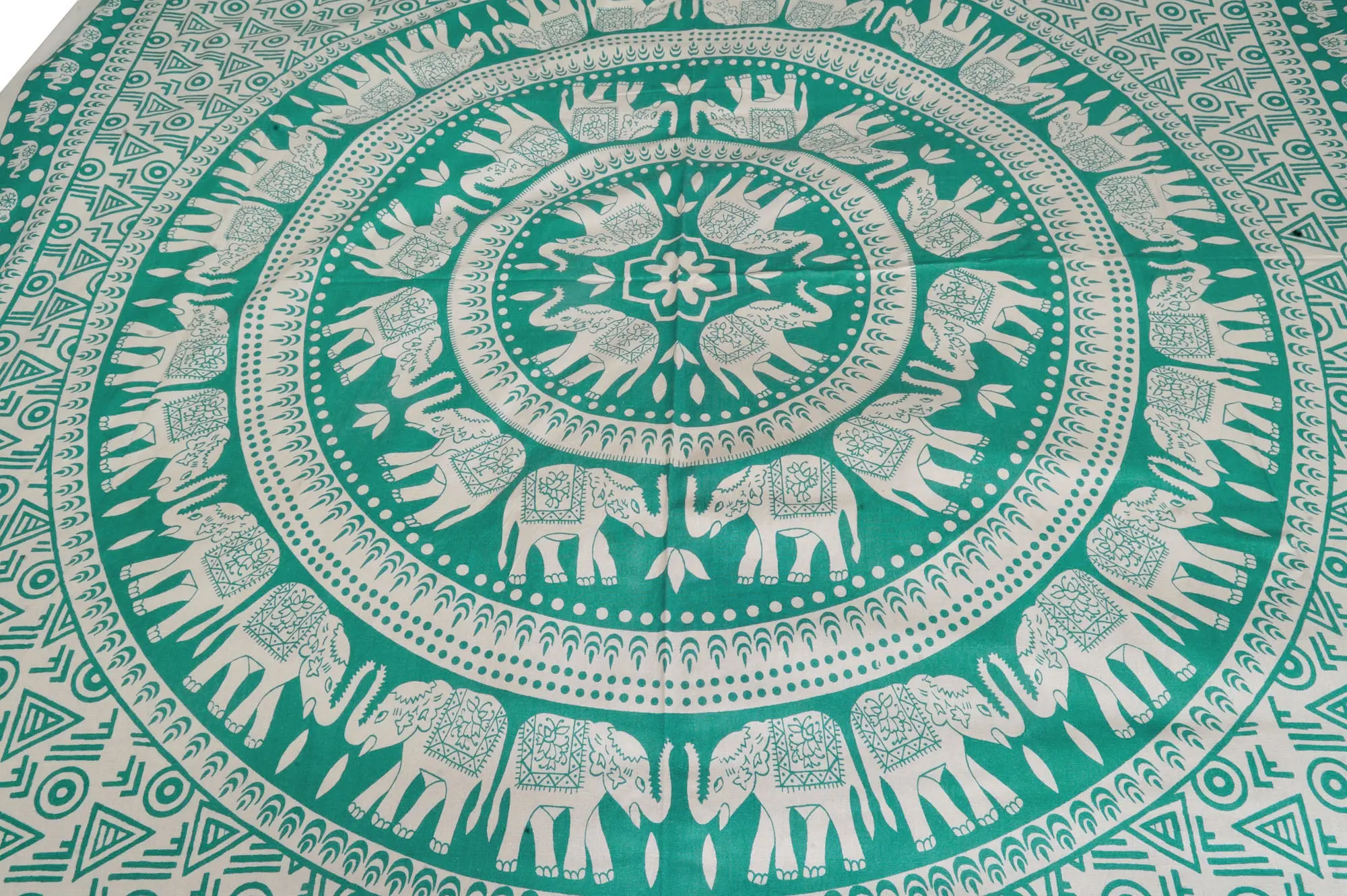 The bedsheet features a striking, printed "Chakravhuh" design composed of elephants. This detailed pattern adds an immediate visual interest and a touch of exotic charm. The elephants, arranged in a mandala-like formation, create a sense of balance and harmony, turning your bed into a focal point of serenity and style. The carefully chosen color palette, combines with the intricate details of the print, making it a versatile addition to a variety of bedroom styles, from bohemian to minimalist.