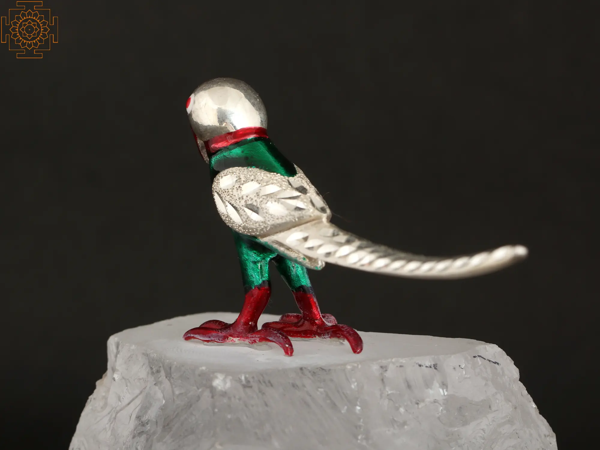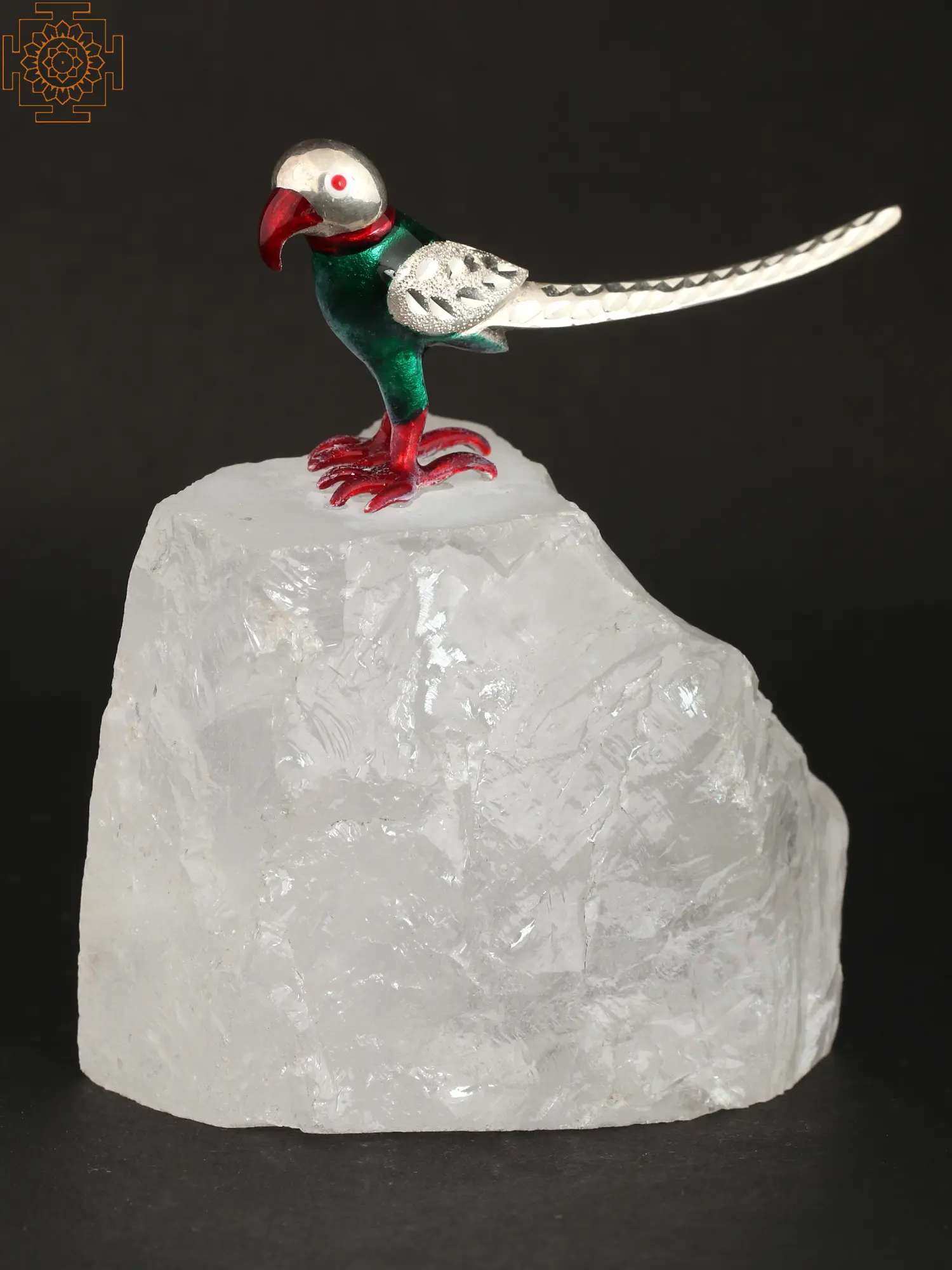 The Bird statues especially of Parrots and Peacocks, hold immense significance in Indian culture. These birds are vehicles of Gods and Goddesses and carry sacred symbolism. This enchanting Bird on a Crystal Mountain is a masterpiece merging Sterling Silver with Crystal and is a tribute to the vehicle of Meenakshi Amman, the Parrot. Crafted precisely, the sterling silver parrot gracefully perches upon a crystal summit. Its vivid green body exudes elegance, while intricate chiseling and delicate lines embellish its tail and wings, adding an extra layer of artistry.