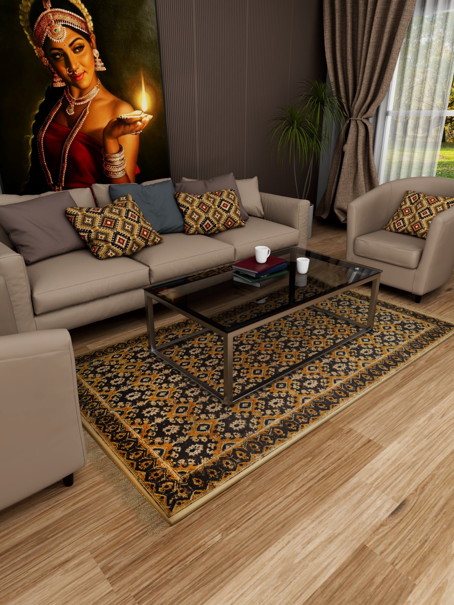 The color palette of this dhurrie is both striking and versatile. The interplay of black and yellow creates a sense of warmth and sophistication, making it a perfect match for a wide range of interior design styles, from modern minimalist to rustic bohemian. Its neutral tones ensure it will blend seamlessly into your existing decor. Whether you're looking to add a pop of color to a neutral room or complement a vibrant space, this dhurrie is sure to impress.