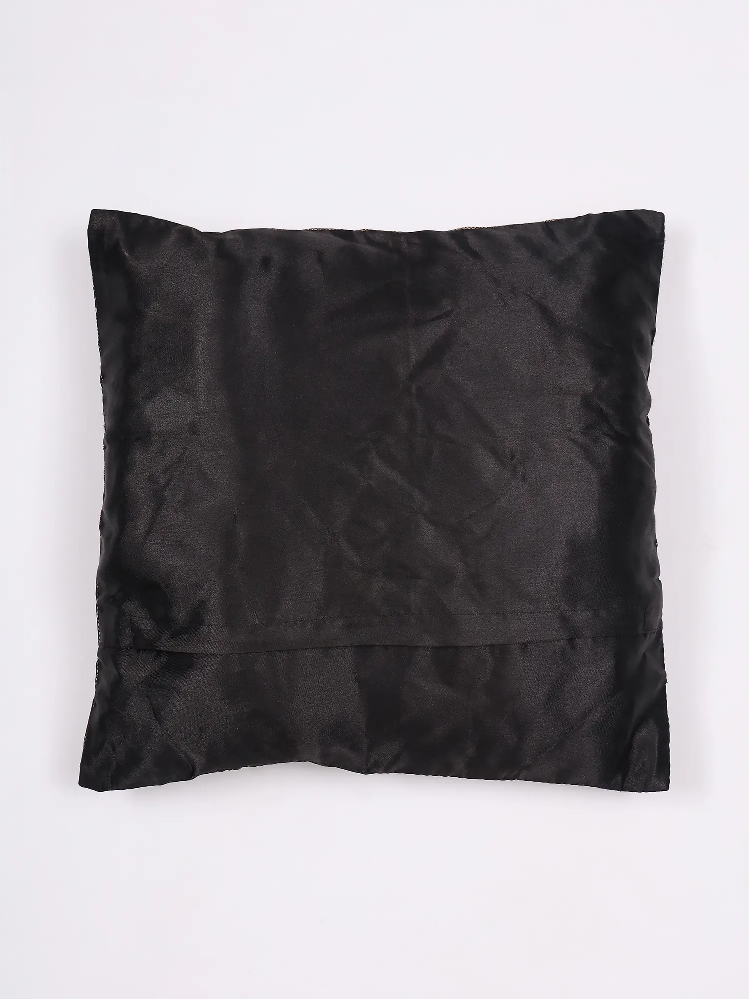 The design features a striking composition of bold, stylized floral blooms set against a deep, enigmatic black backdrop. A decorative border, reminiscent of antique tapestries, frames the central tableau with a rich interplay of earthy tones and floral accents. The 16-inch square dimensions offer a substantial yet refined presence, perfect for adding a splash of refined elegance to your décor.