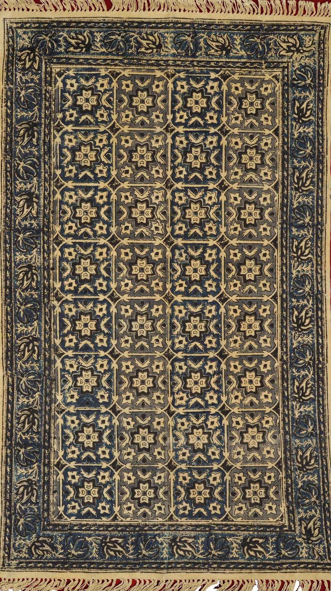 Blue and Gray Kalamkari Dhurrie from Telangana with Floral Print