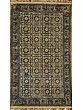 The rug features a captivating floral print in a sophisticated combination of blue and gray hues. The design elements are presented within defined square partitions, creating a mosaic effect that is visually arresting. This intricate design is framed by a decorative border, adding to the rug’s overall elegance. The muted color palette lends itself beautifully to both modern and traditional settings, adding a touch of understated sophistication to any room. The rug also has tassles at the short edges of it. Whether you place it in your living room, bedroom, or study, this Dhurrie is sure to become a focal point, sparking conversation and admiration.