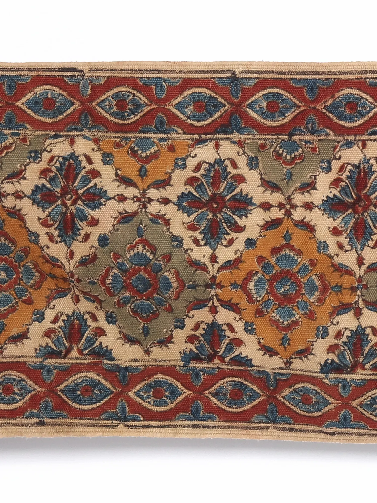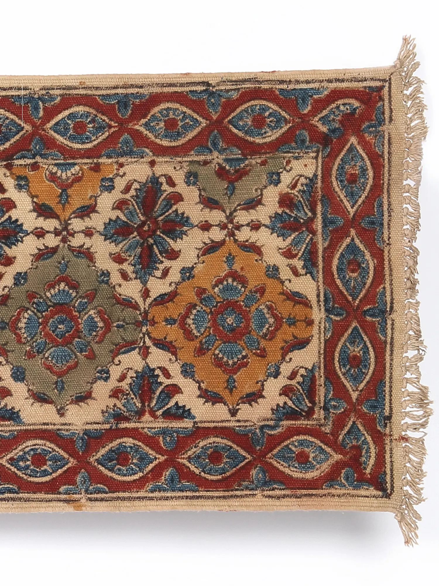 This Blue and Green Kalamkari with Tile Pattern Yoga Carpet from Telangana is a piece of traditional art that you can walk on. Every stroke is infused with the classic art of Kalamkari, telling a tale about legacy and culture. The serene shades of blue and green mingle, creating a feeling of calm and equilibrium. Each theme is adorned with elaborate tile patterns, symbolising harmony and oneness.