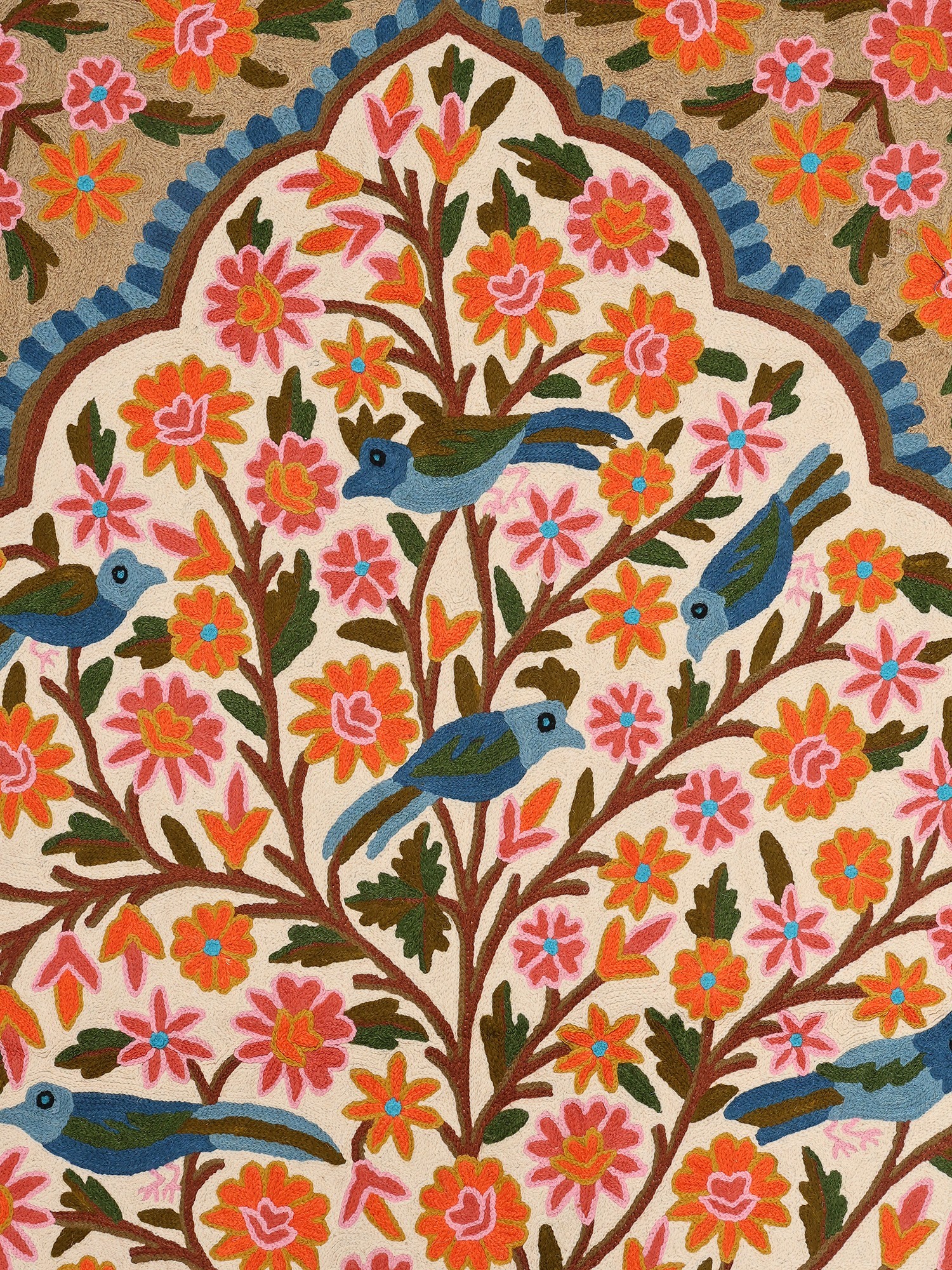 Tri-Color Floral Chain Stitched Aari Embroidered Carpet with Tassels from Kashmir