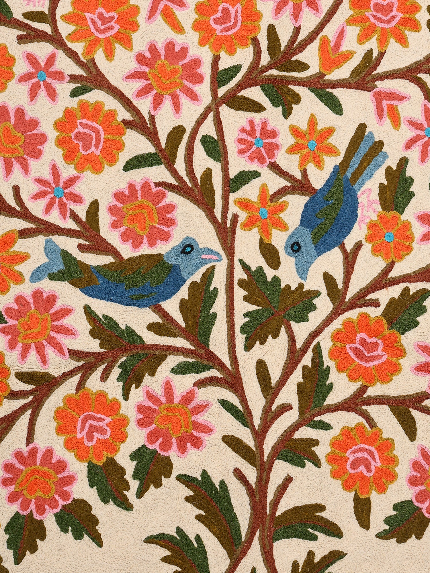 Lucent-White Kashmiri Wall Hanging cum Carpet with Embroidered Tree of Life with Perched Birds