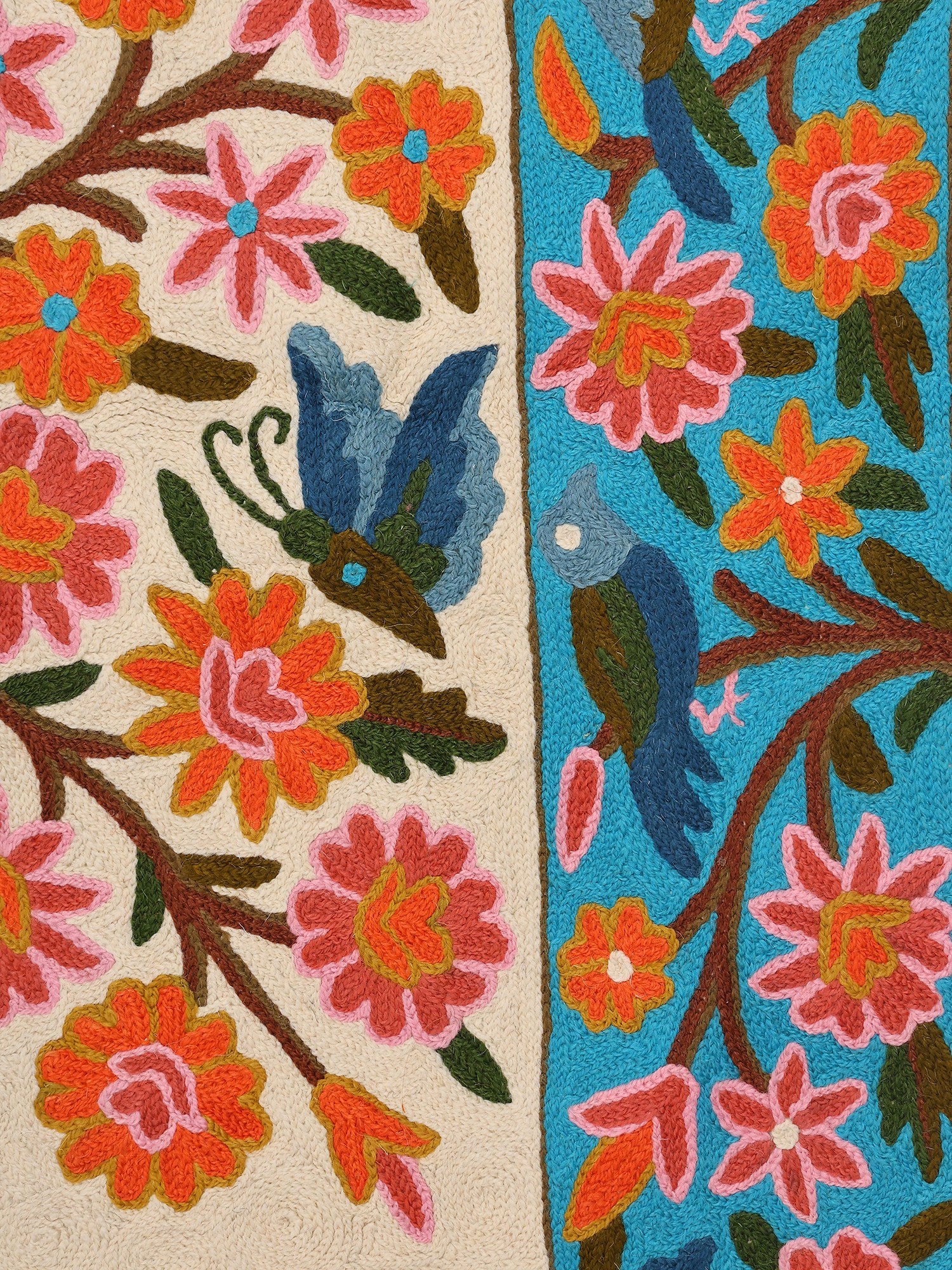 Cream and Blue Kashmiri Carpet with Floral Intricate Chain Stitched Aari Embroidery on All-Over