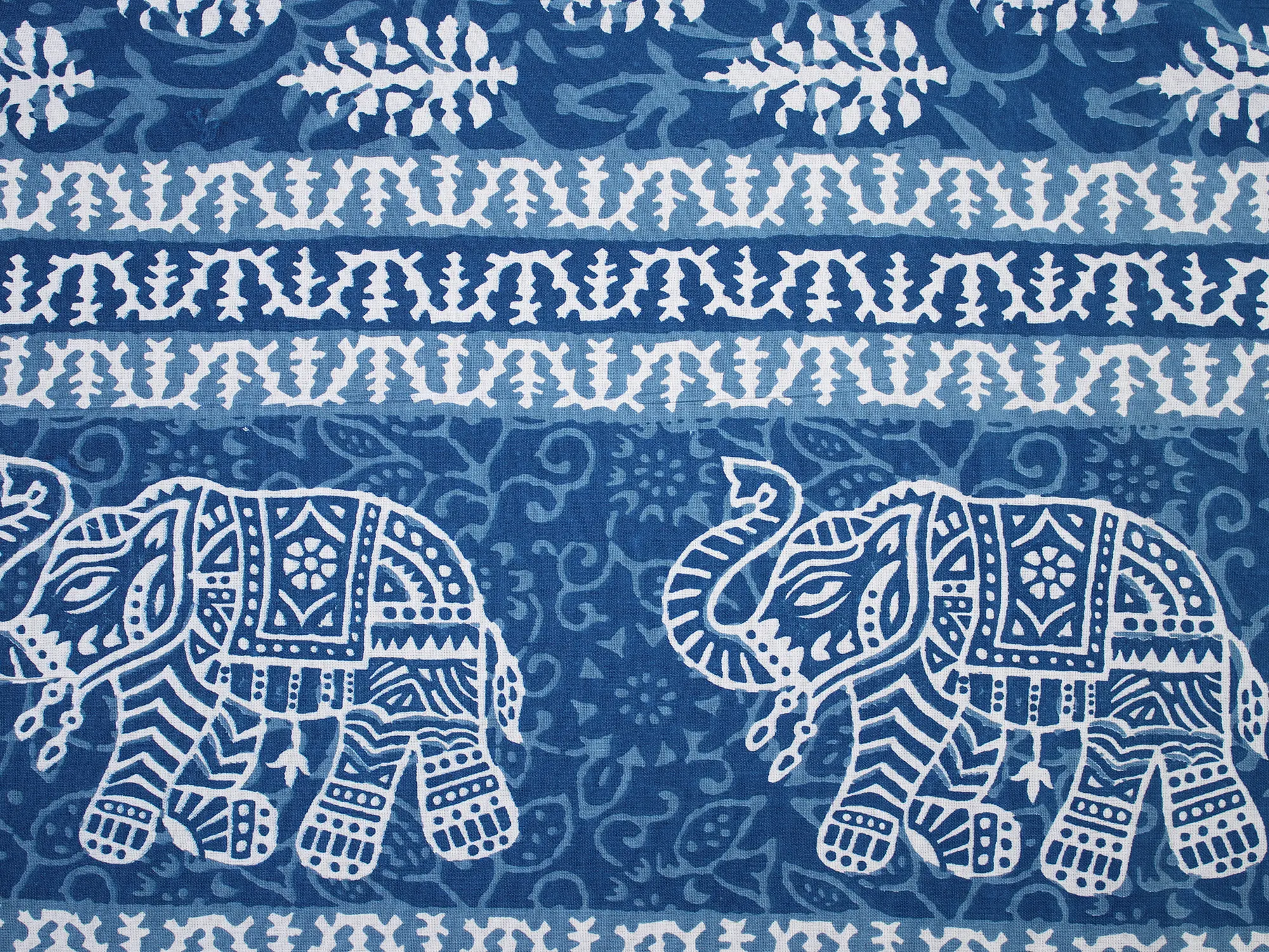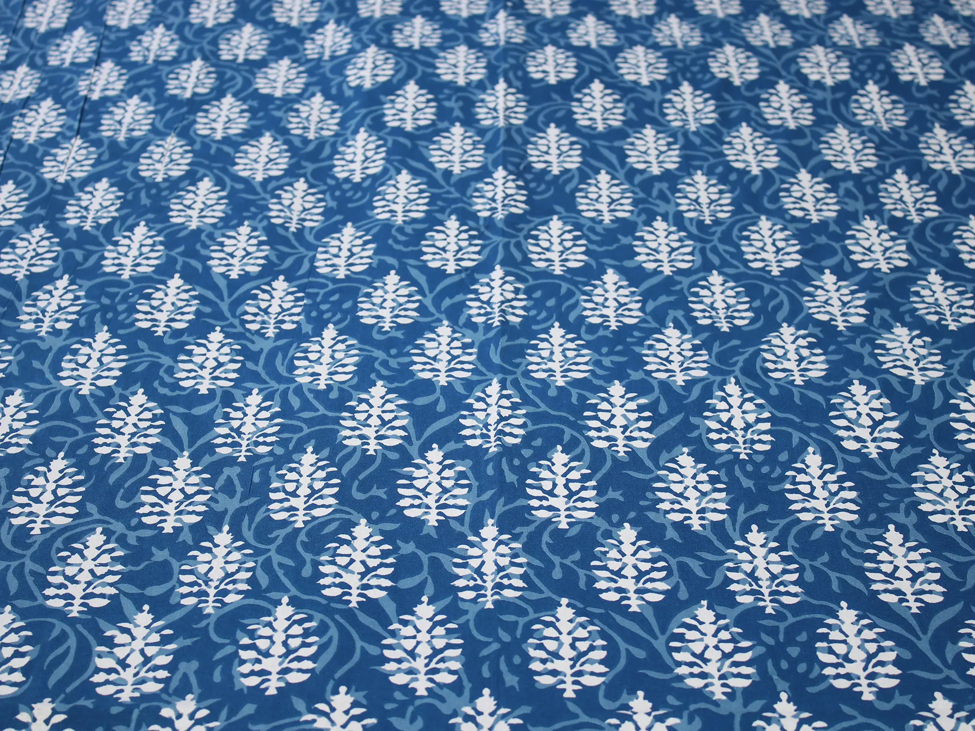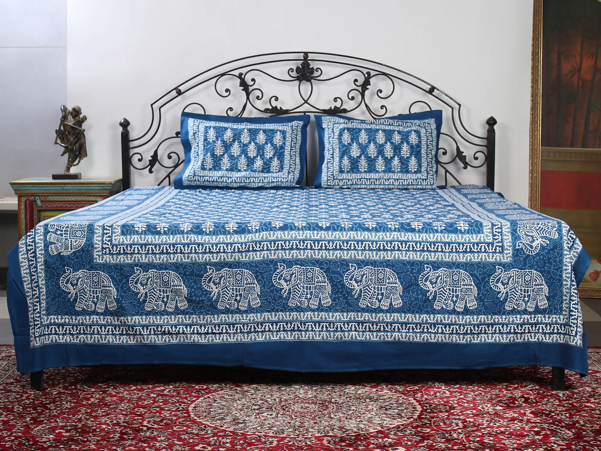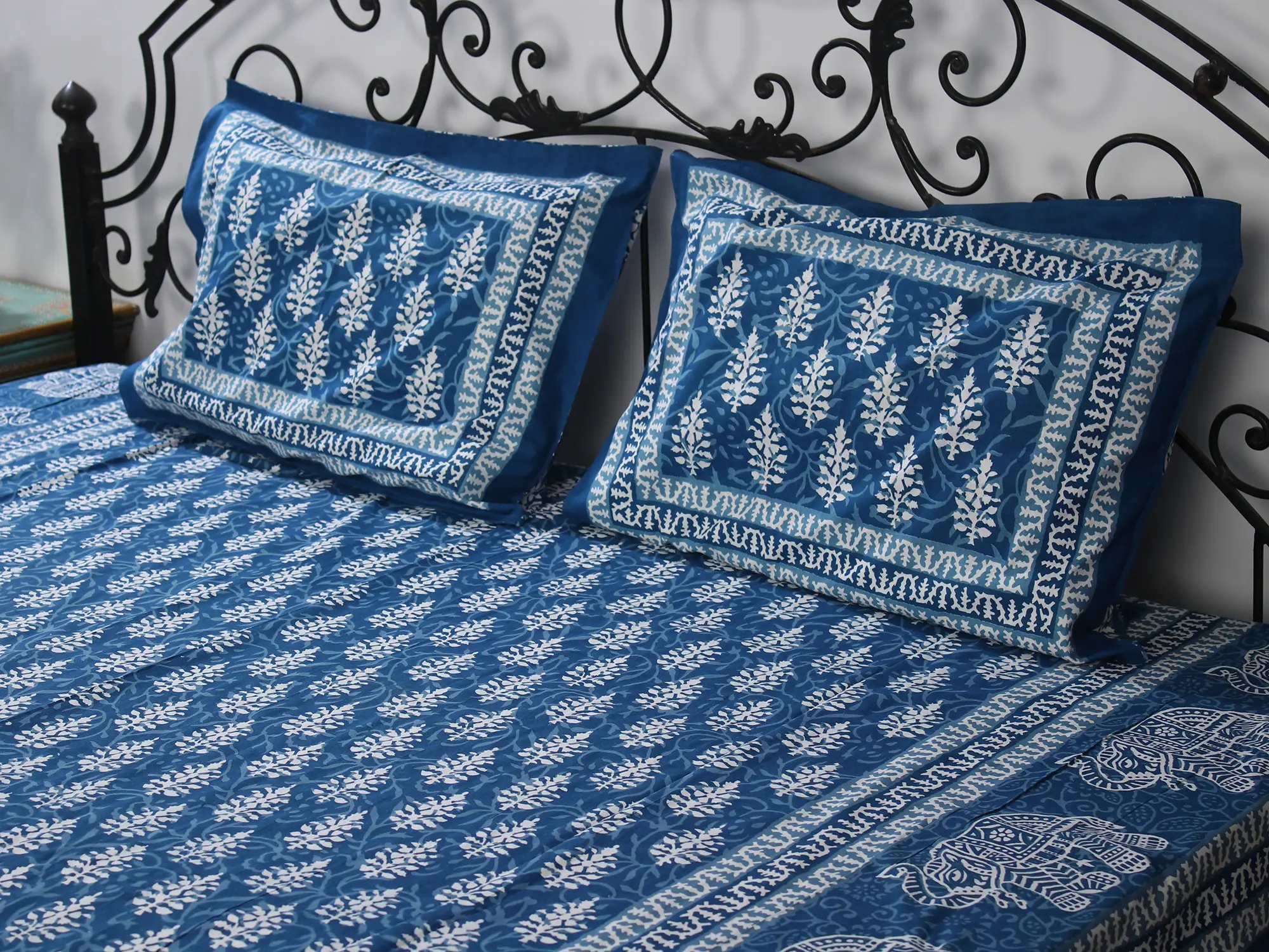 This Blue Cotton Bedsheet with Handblock-Bagru Printed Elephant-Floral Motif in Queen Size, along with Two Pillow Covers, showcases the typical Jaipur style known for its beauty and comfort. These bedcovers are always in high demand because they're both elegant and comfortable to sleep on.