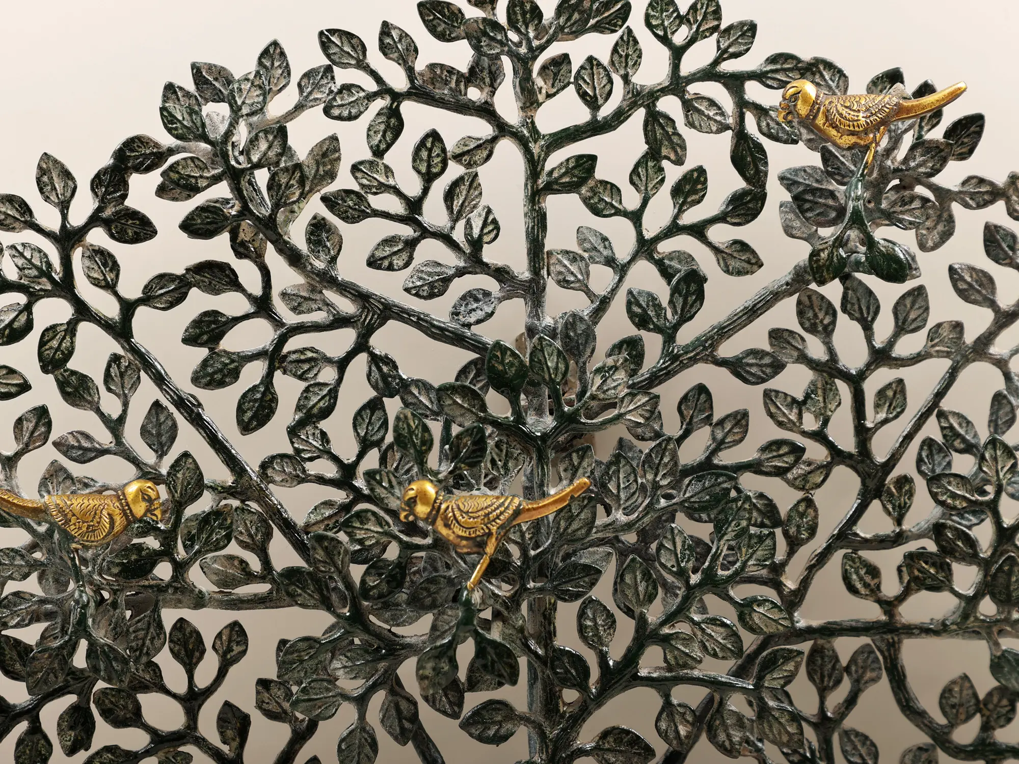 This quotation describes the characteristics of an Aswatha tree. It is said that Aswatha leaf can treat eye pain, hand pain, terrible dreams, and evil thoughts. This wonderful work is dedicated to the majesty of the Aswatha tree or the Bodhi tree, and oozes regal magnificence. Many ancient manuscripts regard Aswatha Vruksha, or the Peepal Tree, as a holy tree and the king of trees. It is stated that its roots grow vertically, while its branches grow downwards. This brass tree was expertly crafted and displays a harmonious combination of brass, a long-lasting material, and natural beauty. Brass-colored birds perch gracefully on the branches, adding to the majesty of the scene.