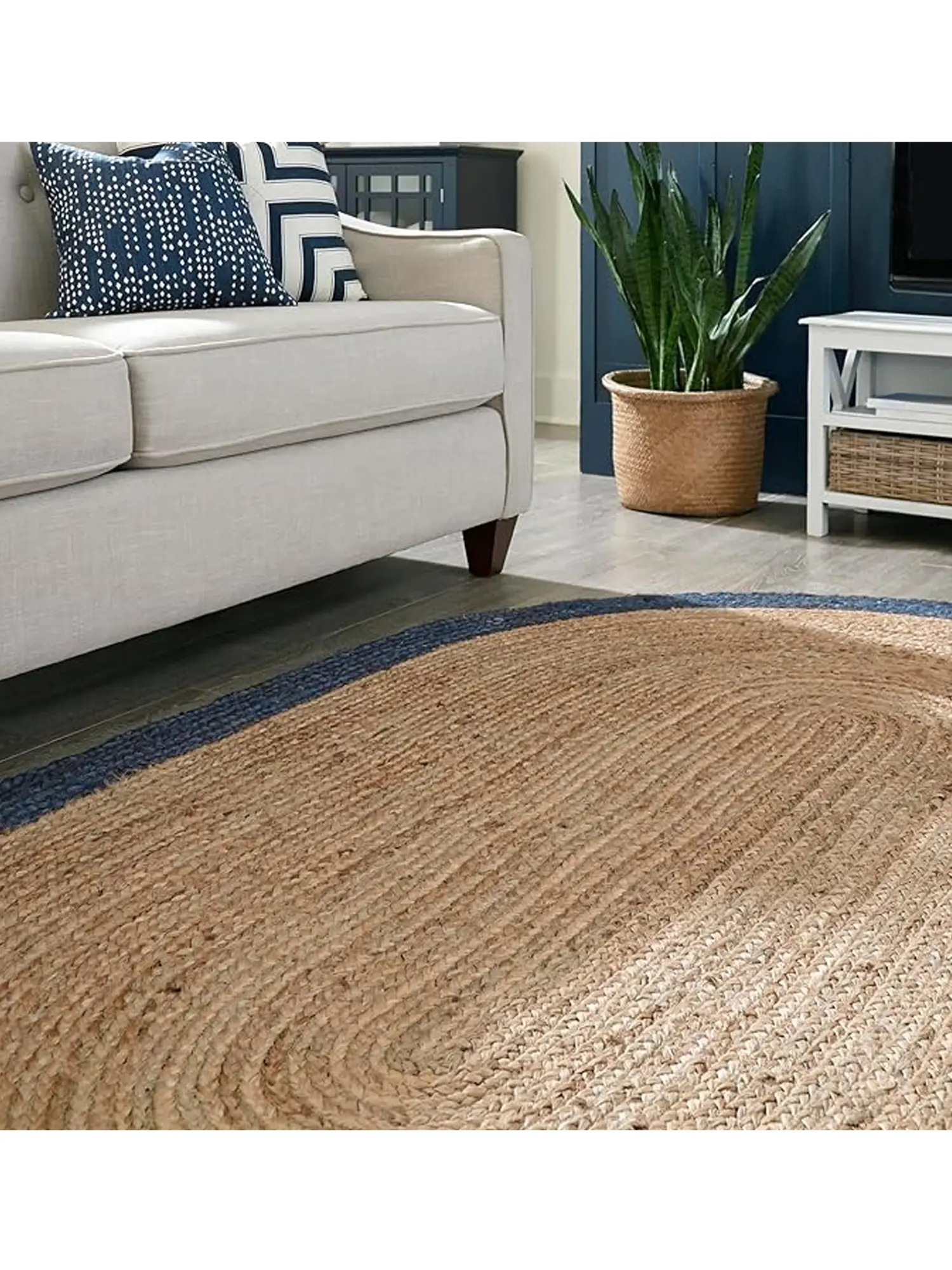 The combination of deep blue and natural jute creates a versatile design that effortlessly blends with a wide array of décor styles. Whether you have a contemporary, bohemian, farmhouse, or transitional interior, this rug will seamlessly integrate into your existing aesthetic. Place it in your living room to anchor your seating area, or use it in a bedroom to add warmth and texture under your bed. Its oval shape adds a touch of unique elegance to any space.