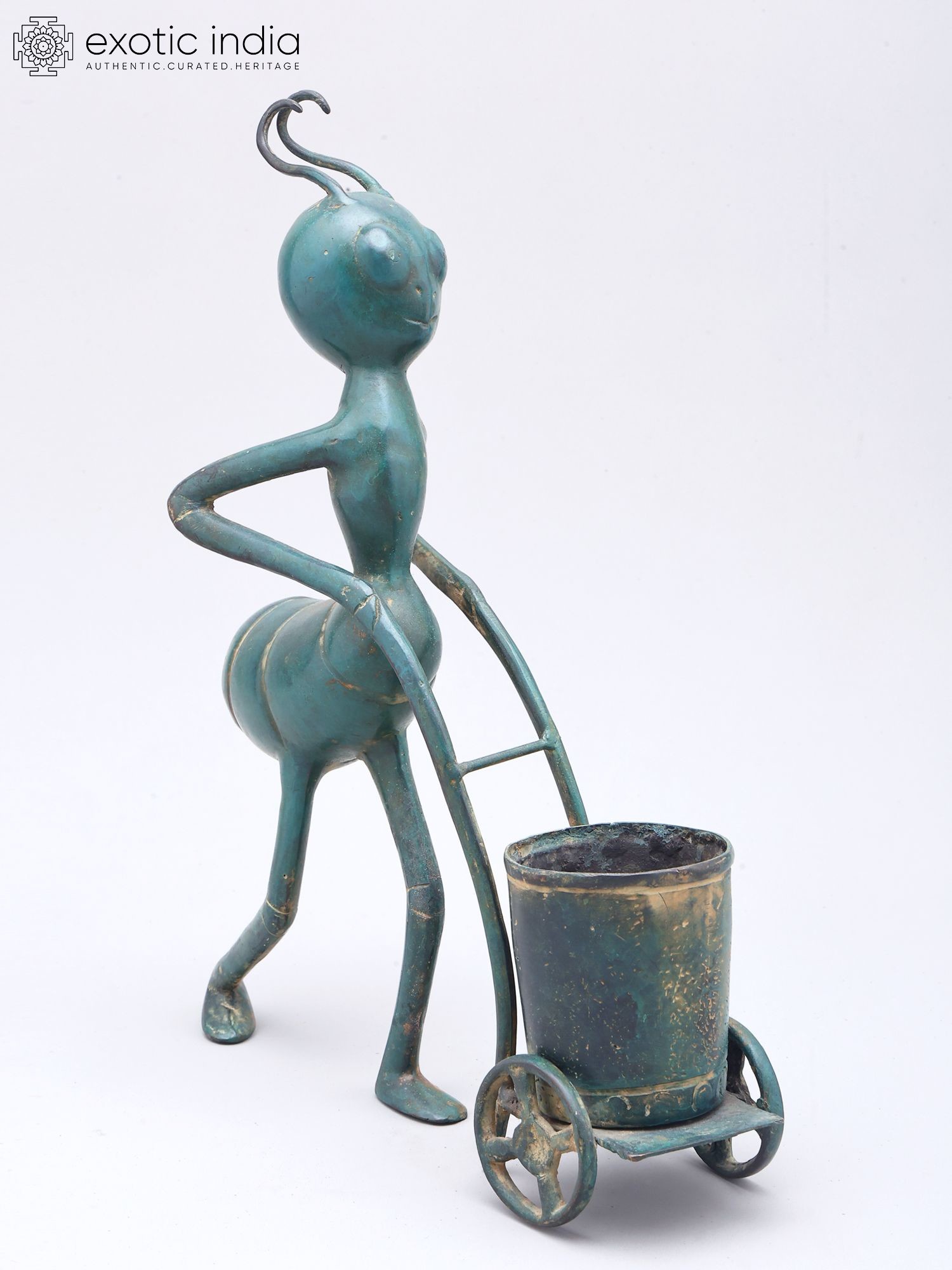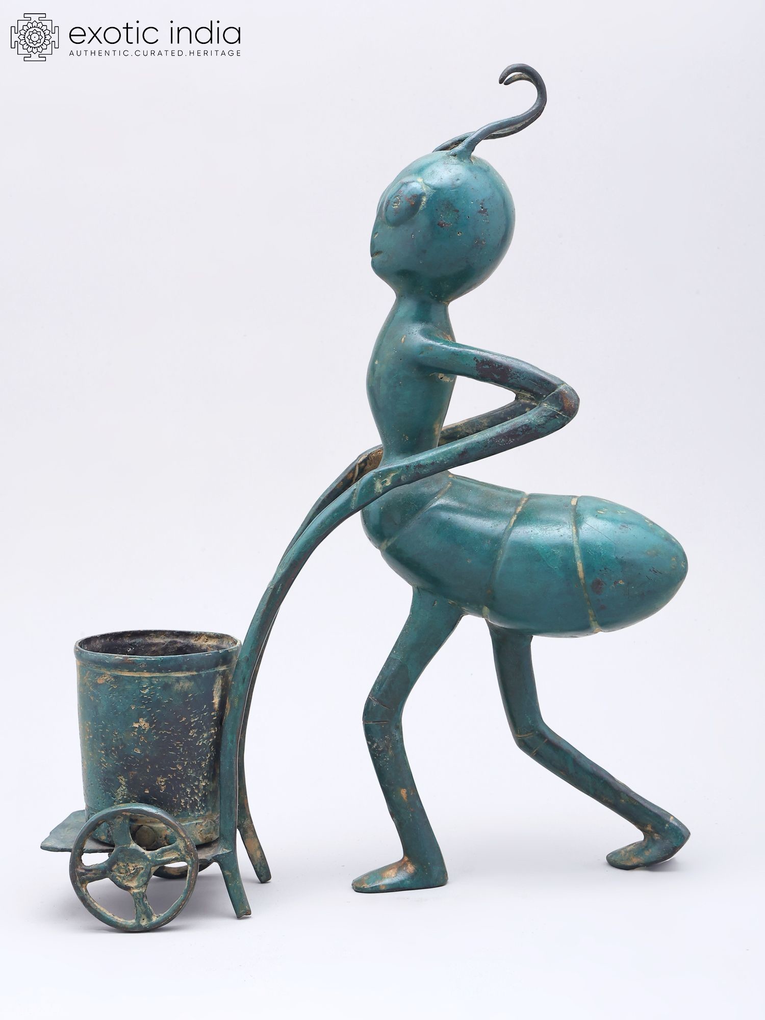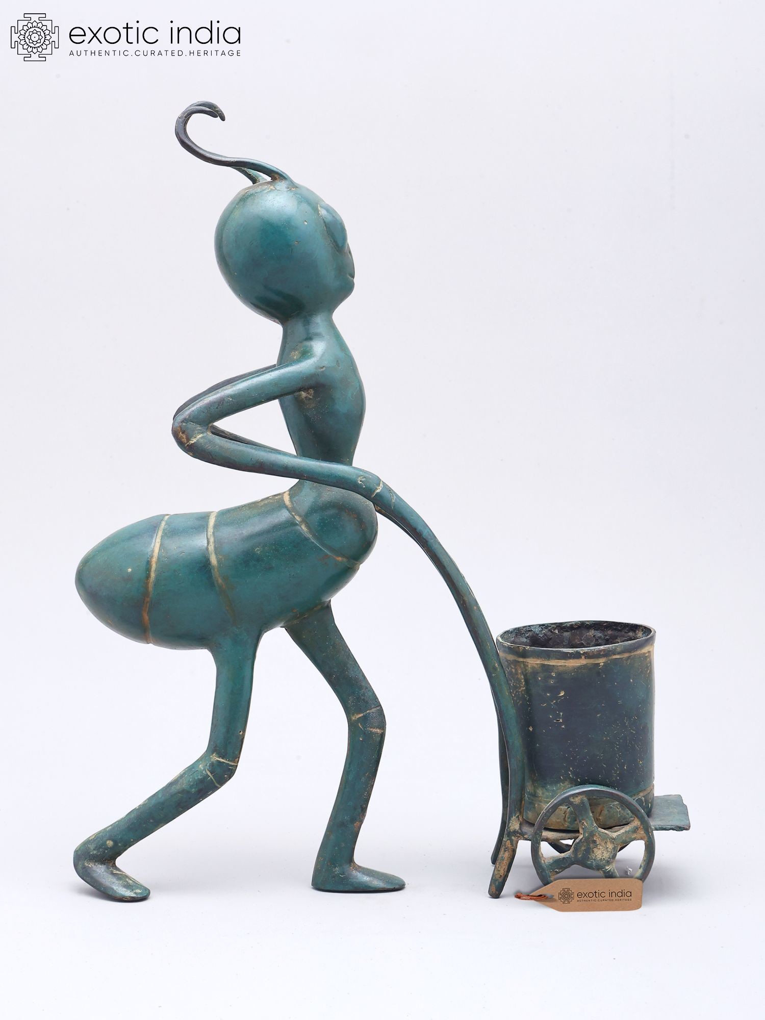 Intricate 12-inch brass statue depicting an industrious ant with a wheelbarrow.