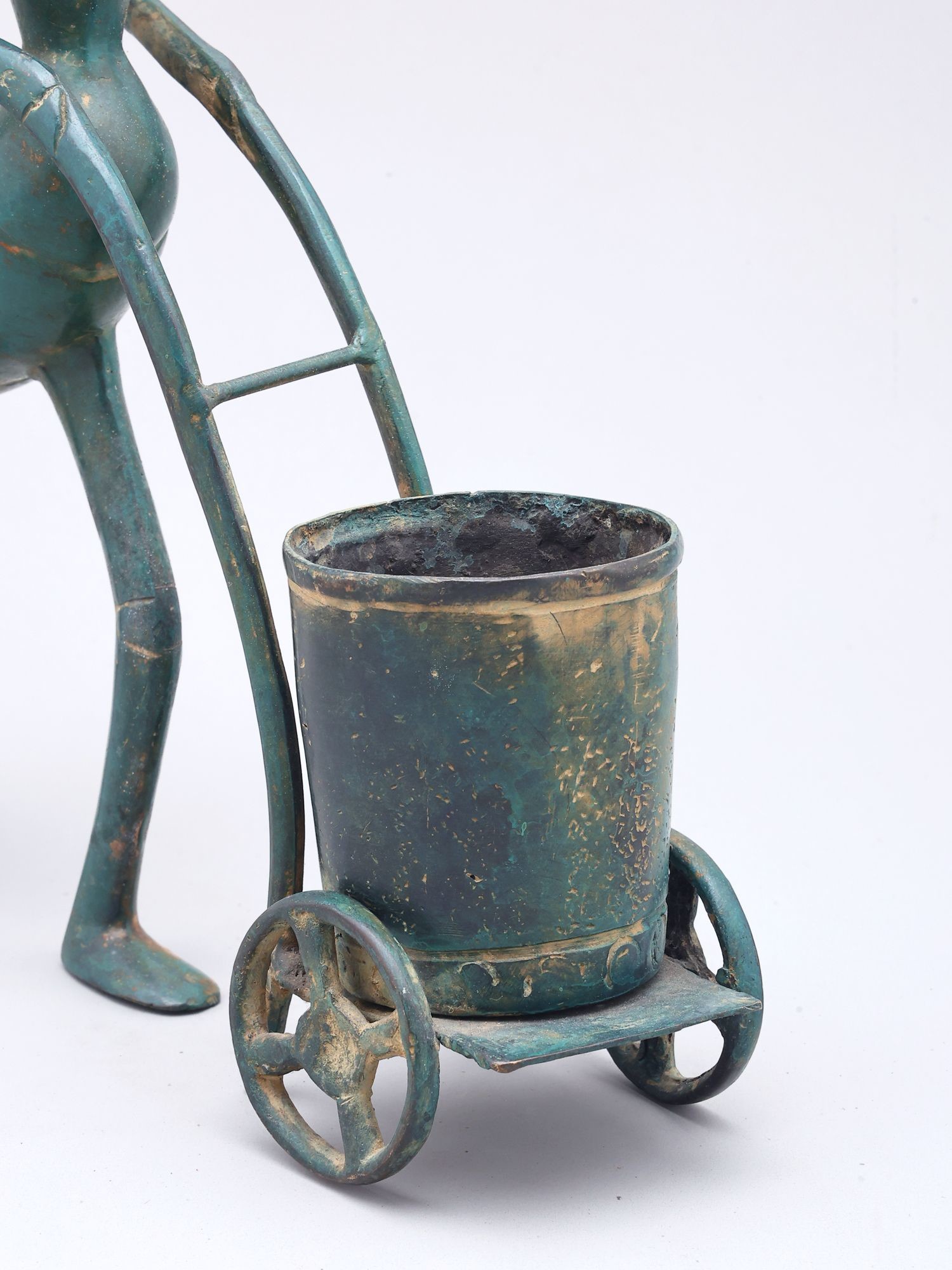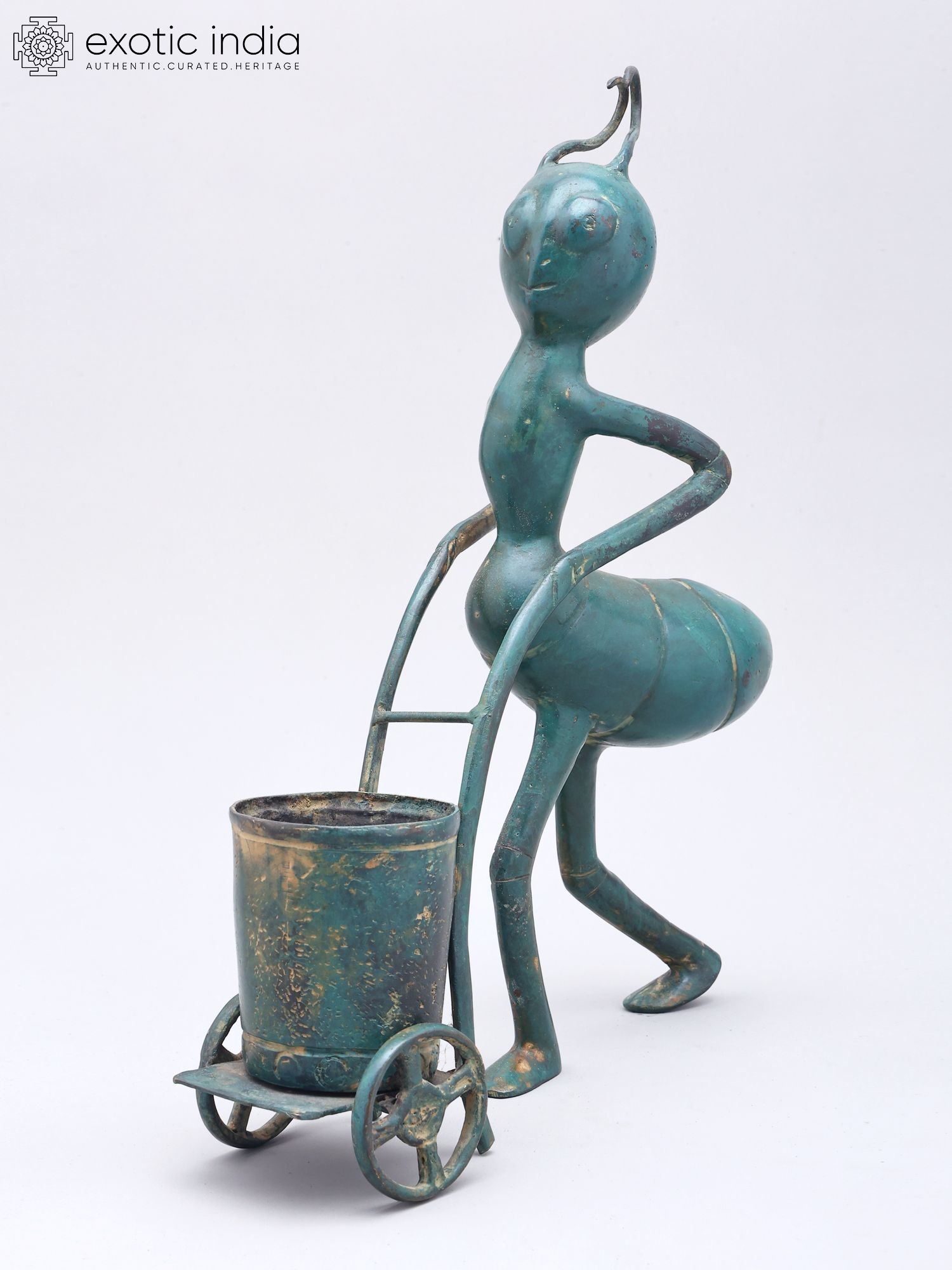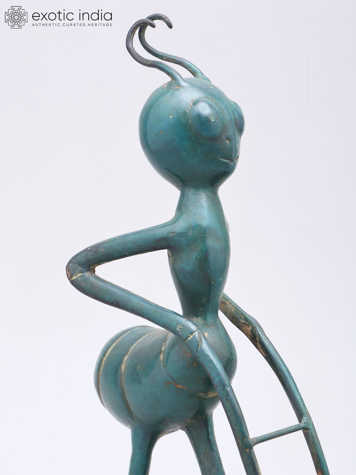 Intricate 12-inch brass statue depicting an industrious ant with a wheelbarrow.