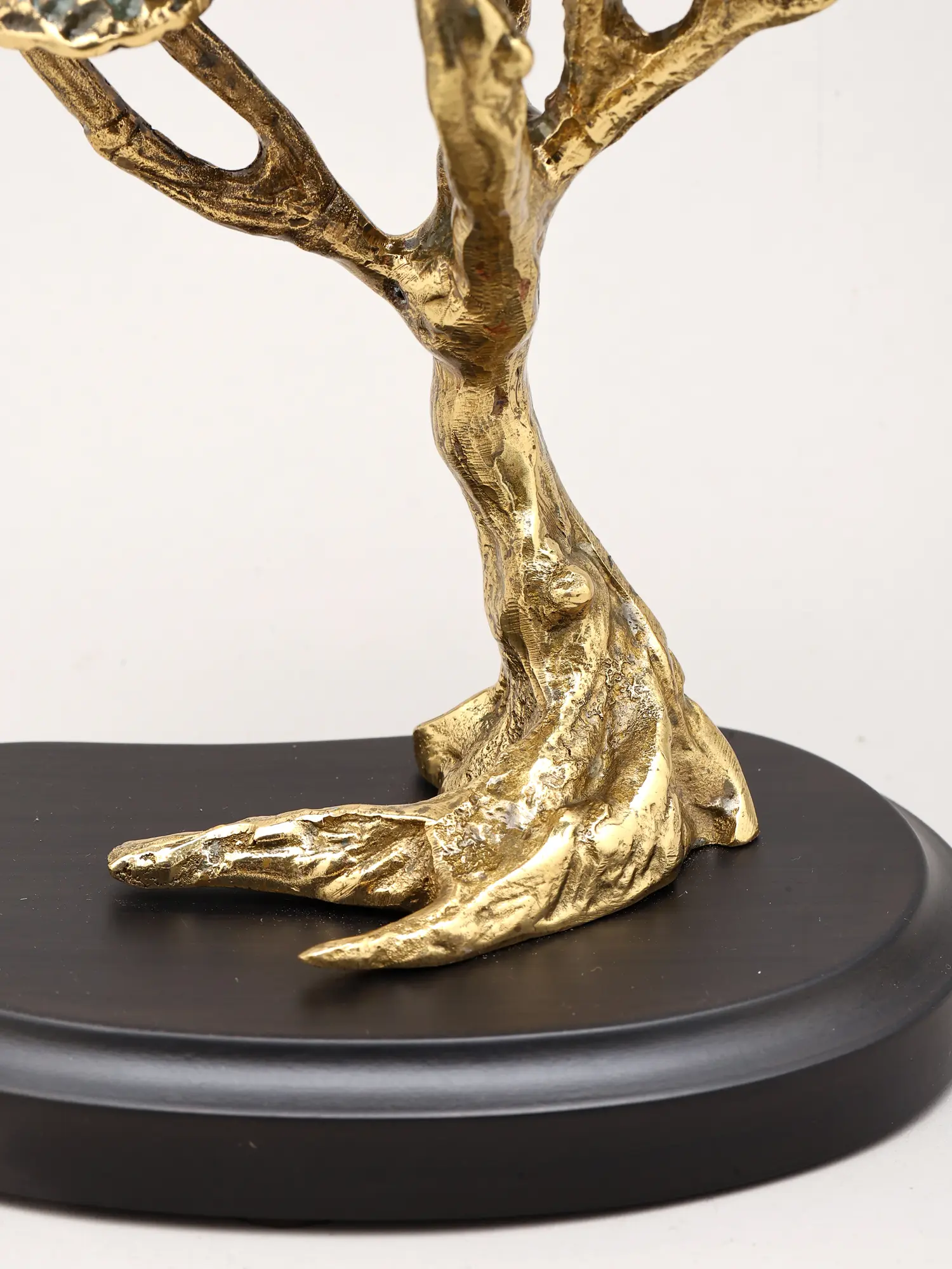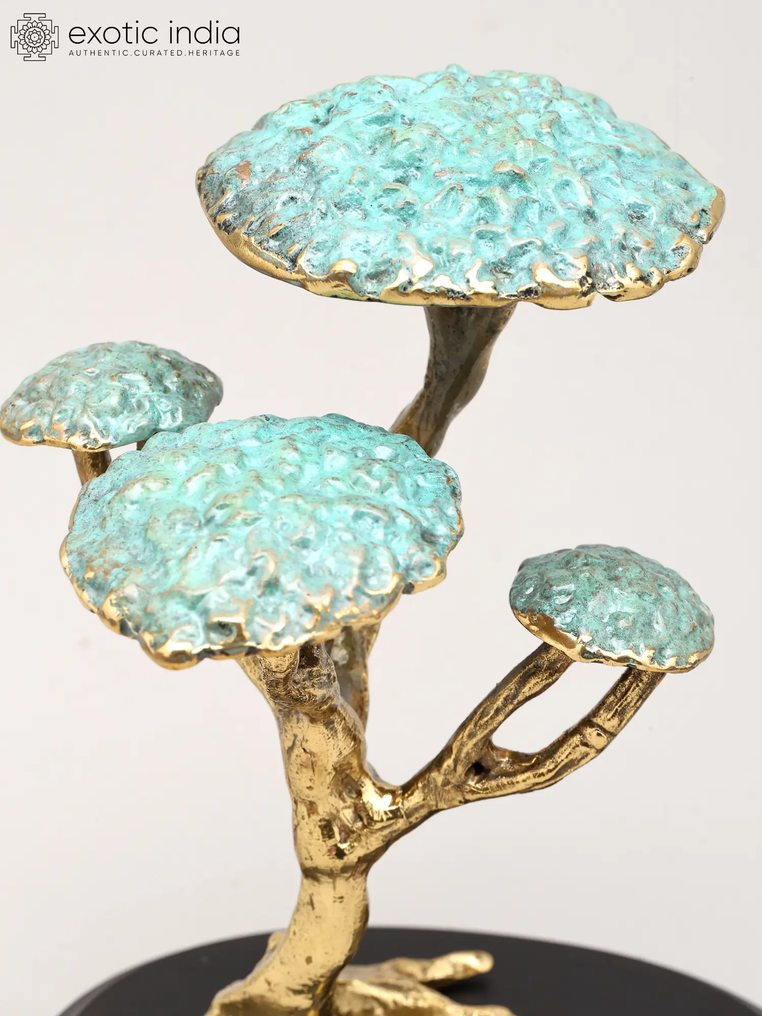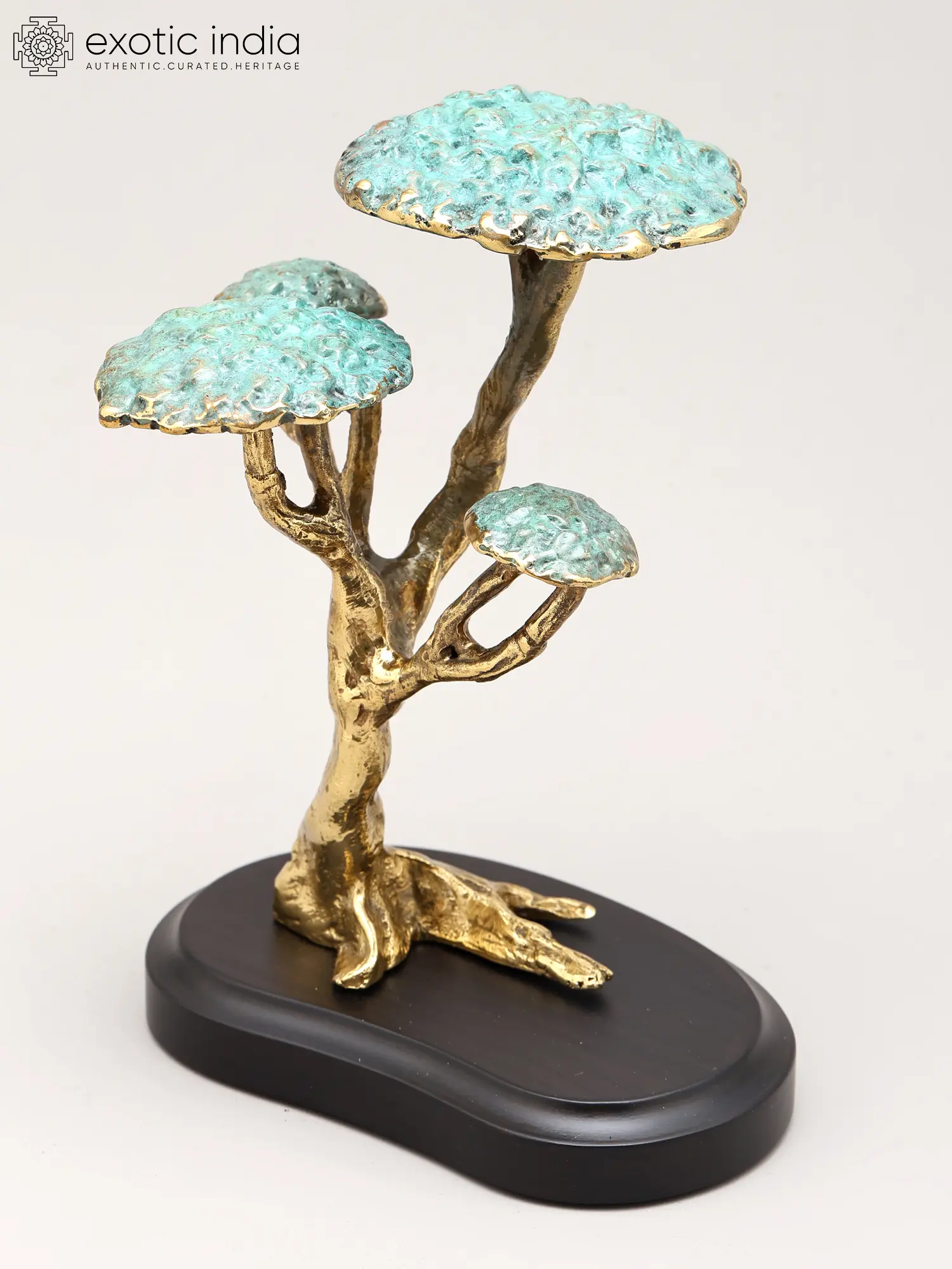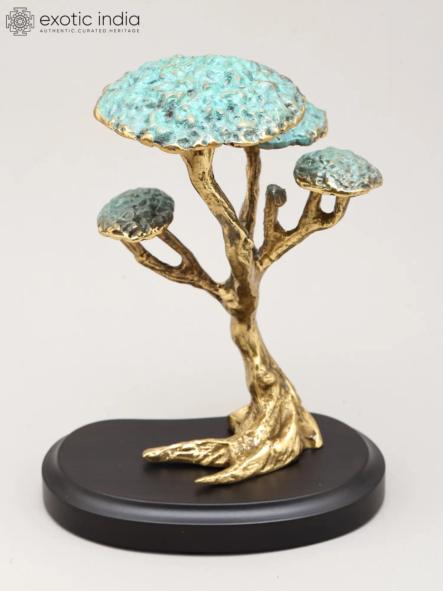 The delicate branches rise with an organic fluidity, culminating in textured, cloud-like canopies that invite contemplation. The vibrant blue patina, reminiscent of aged verdigris, contrasts beautifully with the warm, golden hue of the brass, highlighting every nuance of its sculpted surface. Standing approximately seven inches tall and spanning five inches in width, its compact yet impactful presence ensures it commands attention without overwhelming its surroundings.