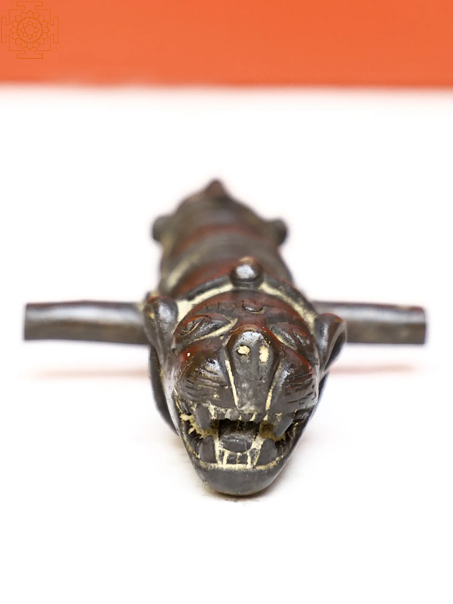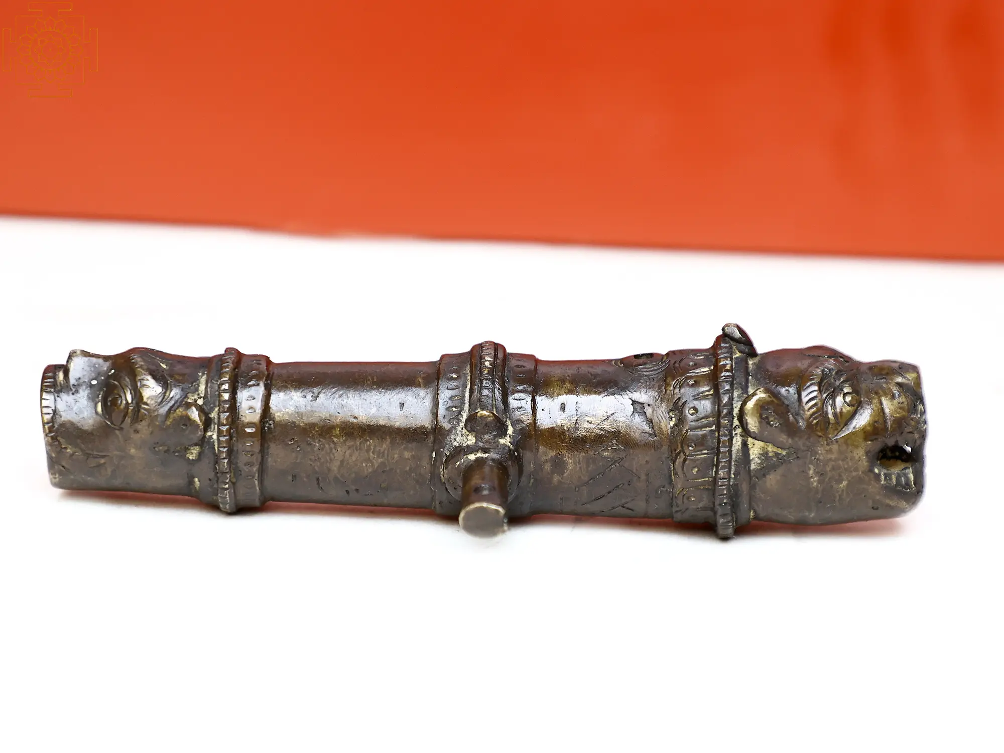 The striking feature of this brass cannon is its dual-headed design, each end adorned with a remarkably detailed animal head. These formidable visages, possibly representing mythical creatures or powerful beasts of lore, are rendered with striking realism. Their open mouths and piercing eyes seem to convey a fierce spirit, adding a dramatic flair to the piece. The central barrel is further embellished with a textured grid pattern, suggesting the ruggedness of a functional weapon, while decorative bands encircle the heads, adding a refined contrast to the overall robust aesthetic. The protruding rod, likely representing a ramrod or a similar functional element, adds to the authentic representation of a miniature cannon.
