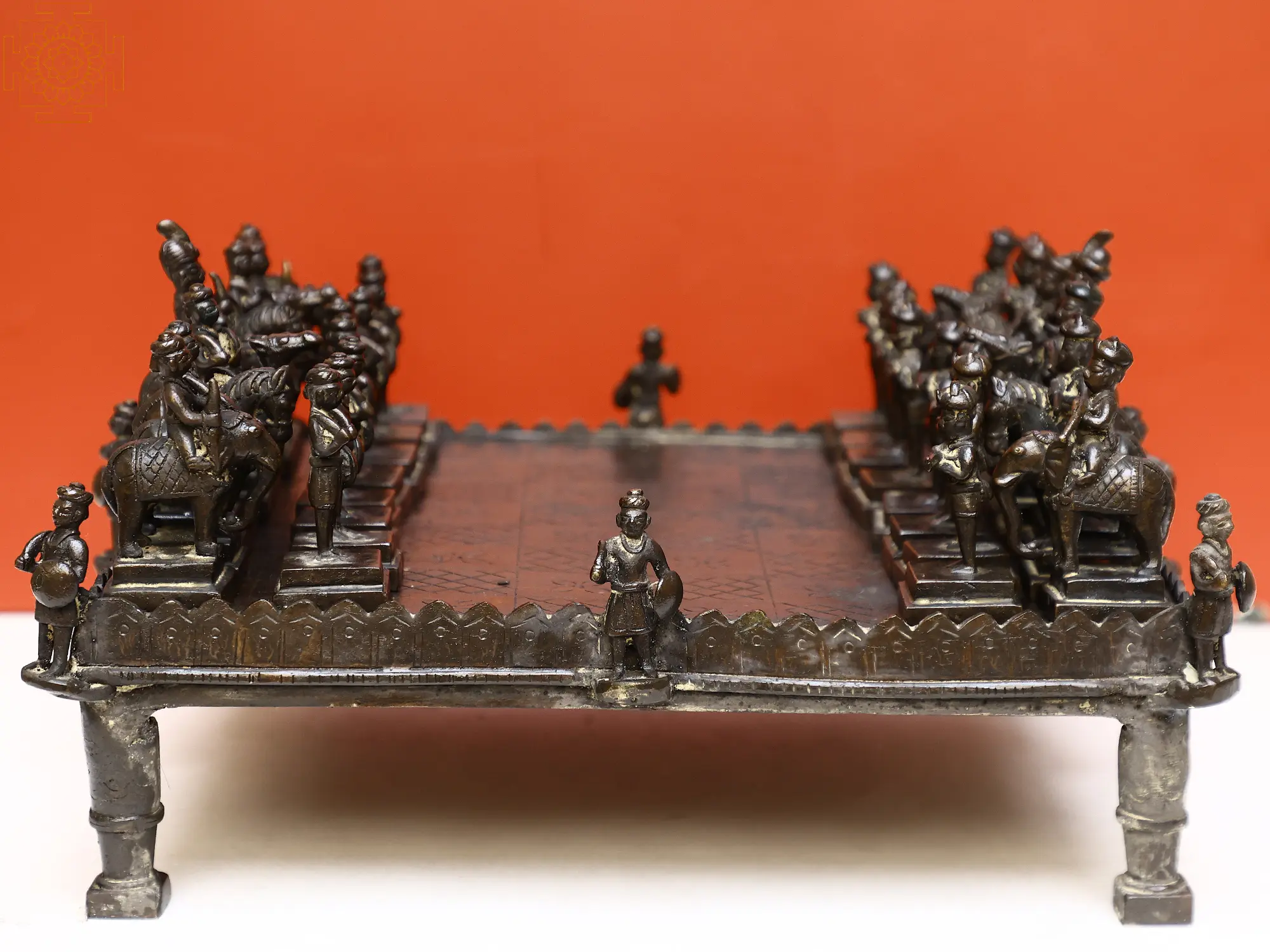 This chess set is a testament to exceptional craftsmanship. The pieces, depicting what appear to be mounted warriors and soldiers, are rendered with remarkable detail. From the ornate headdresses to the regal postures, each figure is a miniature sculpture, designed to stand proudly on the intricately detailed board. The board itself is a work of art, featuring raised edges and decorative elements that frame the playing surface, enhancing the overall aesthetic appeal. The tactile sensation of the cool, smooth brass as you move each piece across the board adds another dimension to the playing experience, connecting you to the tradition of chess through the ages.