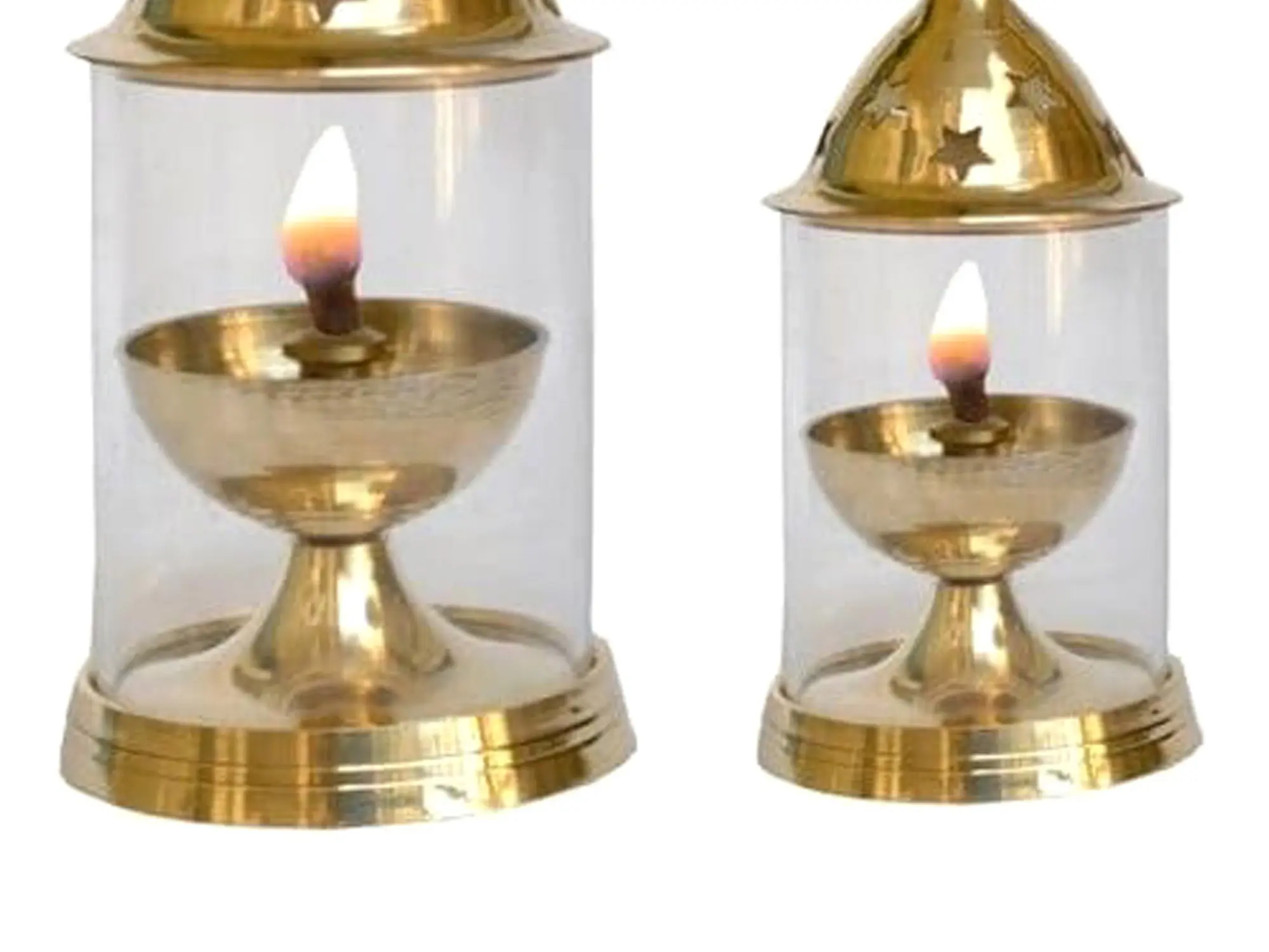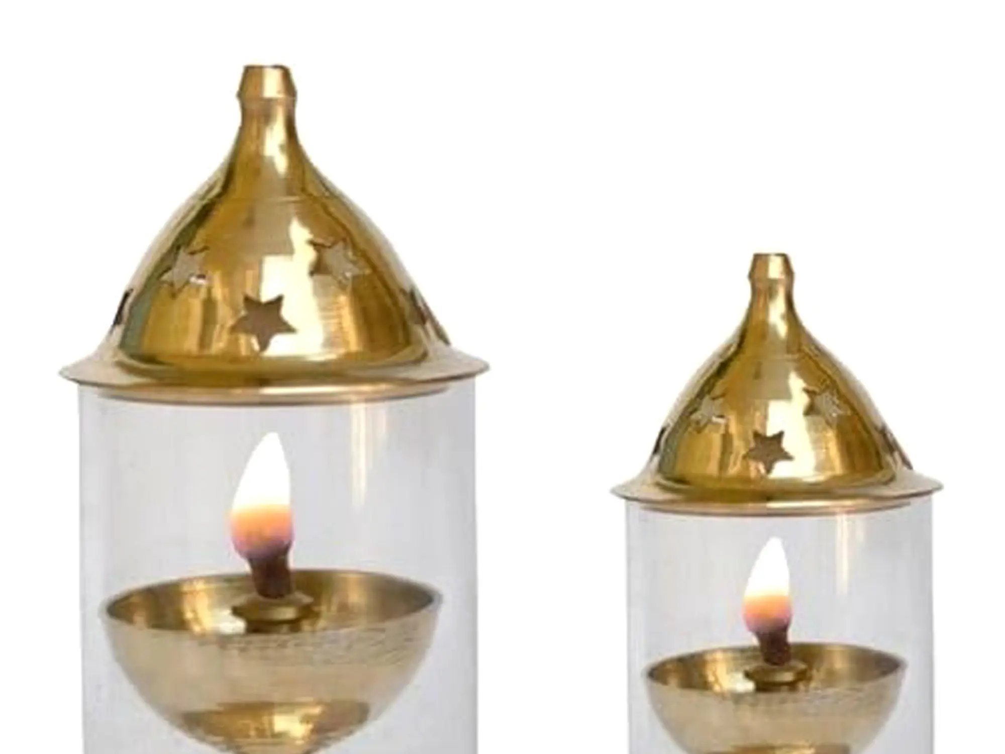 Each piece in this set showcases the meticulous attention to detail and the skillful artistry that goes into creating a truly exceptional home décor item. The brass body is carefully crafted to create a harmonious blend of form and function. The design incorporates a balance of curves and clean lines, making them visually appealing and perfectly suited for both traditional and modern interiors. The transparent enclosure surrounding the flame provides protection while allowing the warm light to spread freely, creating a mesmerizing effect. The top has star-shaped cutouts for added glow and appeal. The weighted base ensures stability, preventing accidental tipping and making them safe for use in any room. These diyas aren't merely decorative objects; they are a testament to the enduring beauty of traditional Indian craftsmanship.