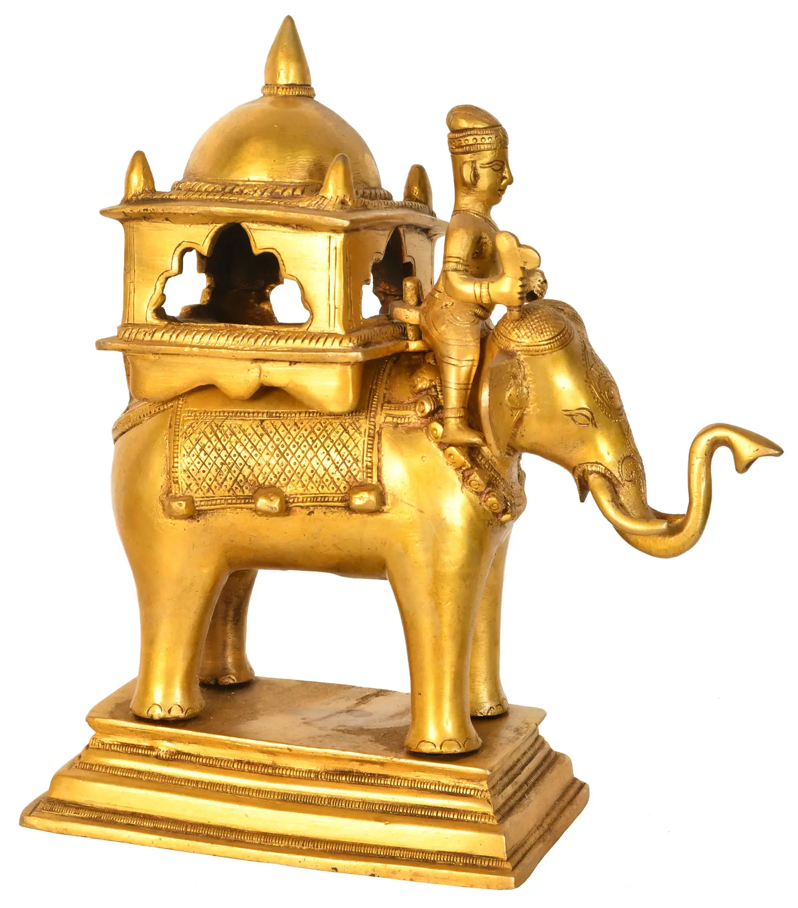 This Brass Elephant Palki of a King evokes the grandeur of regal processions with its stunning portrayal. This brass statue captures the essence of opulence as an elephant majestically carries a palki, embodying the regal conveyance of kings and queens. The attention to detail is evident in the presence of a Mahaut skillfully guiding the elephant, adding a touch of realism to the scene.