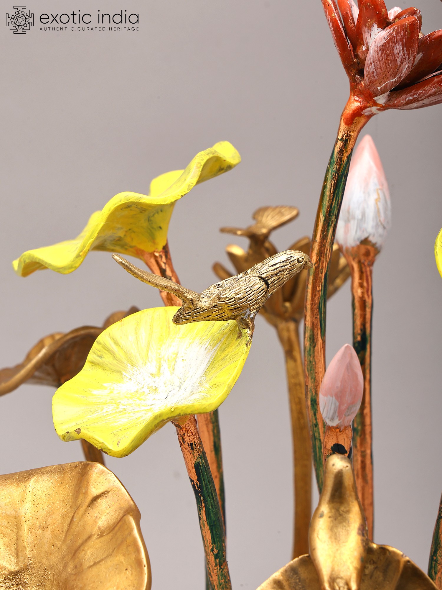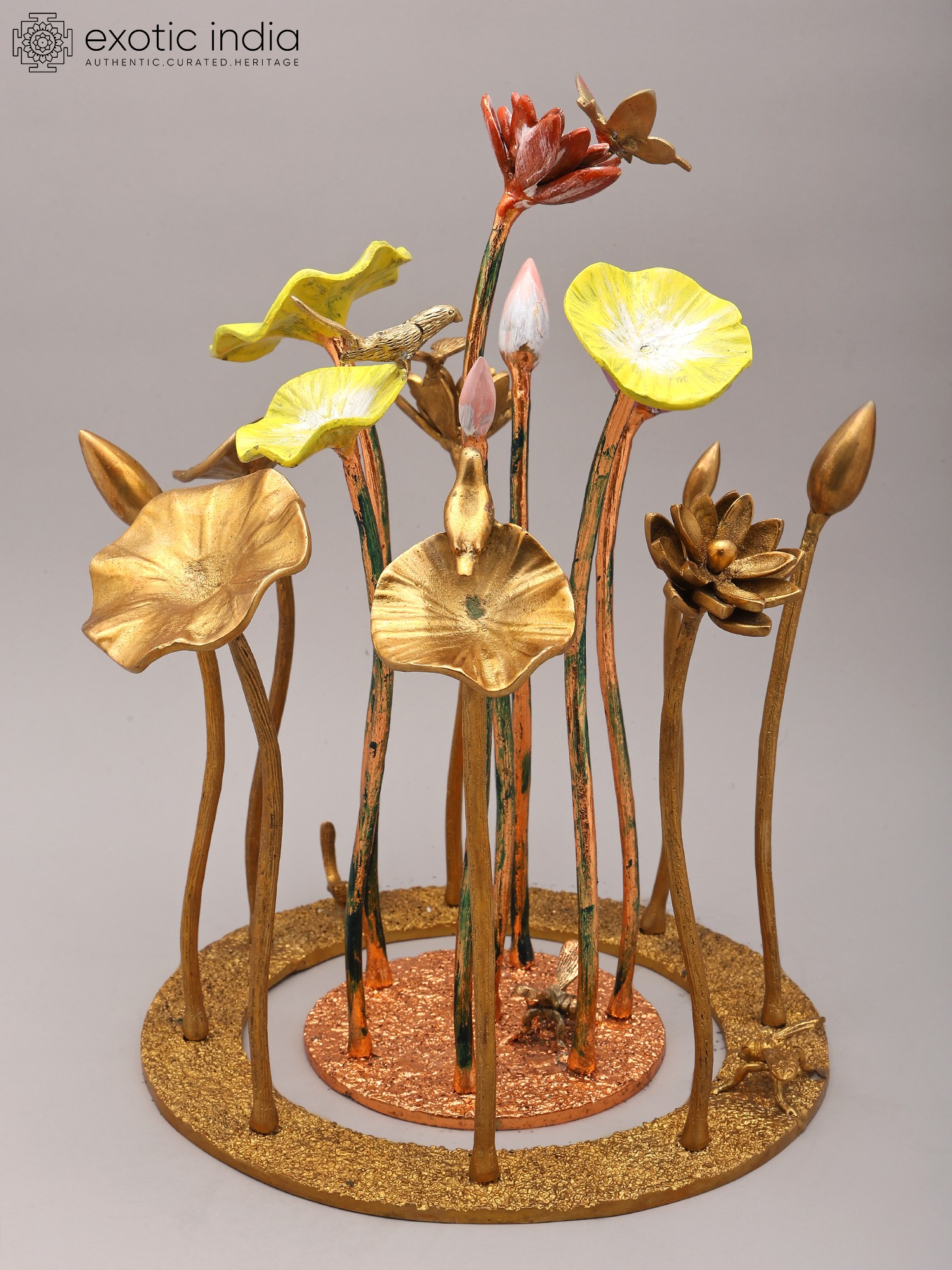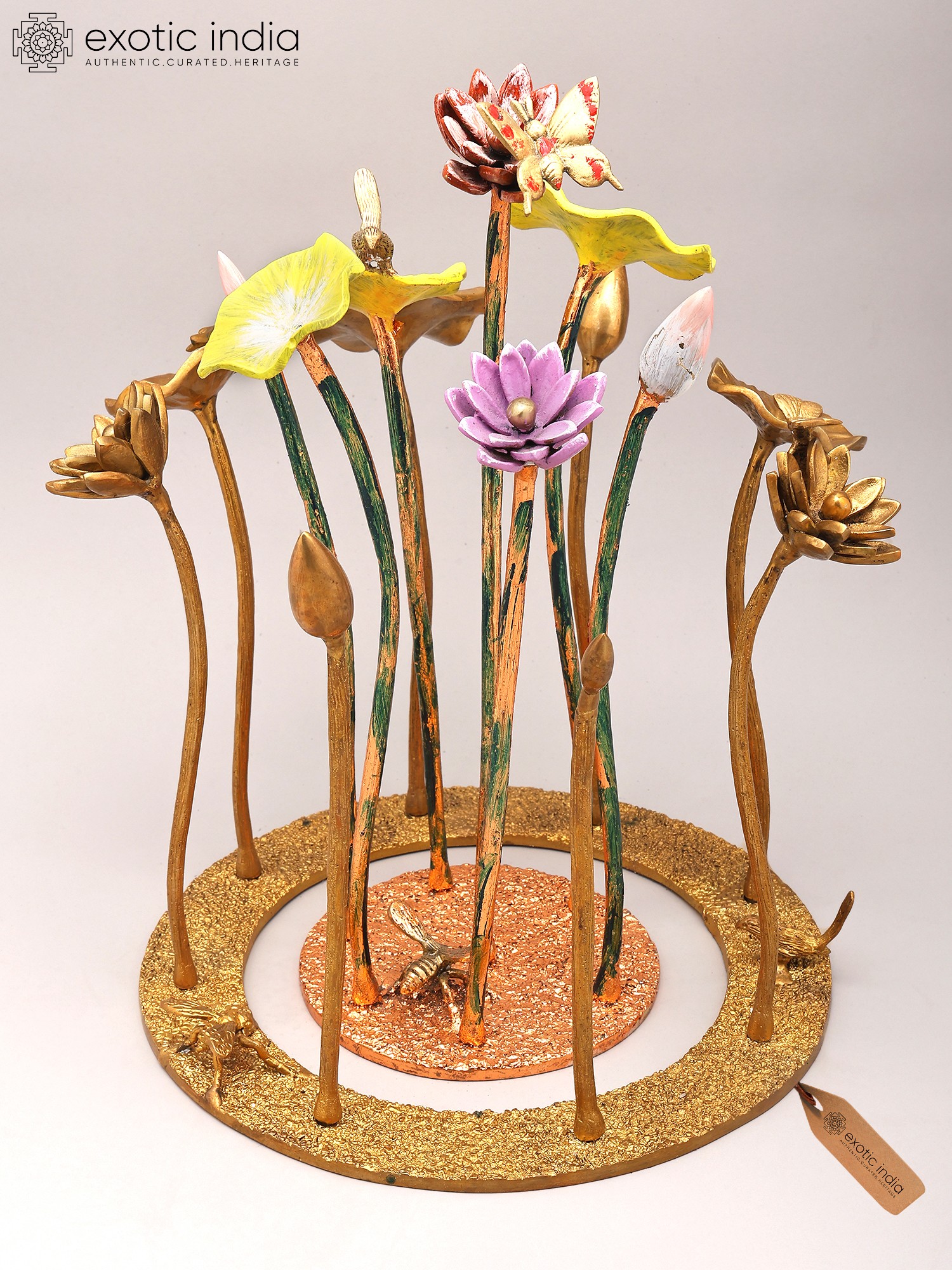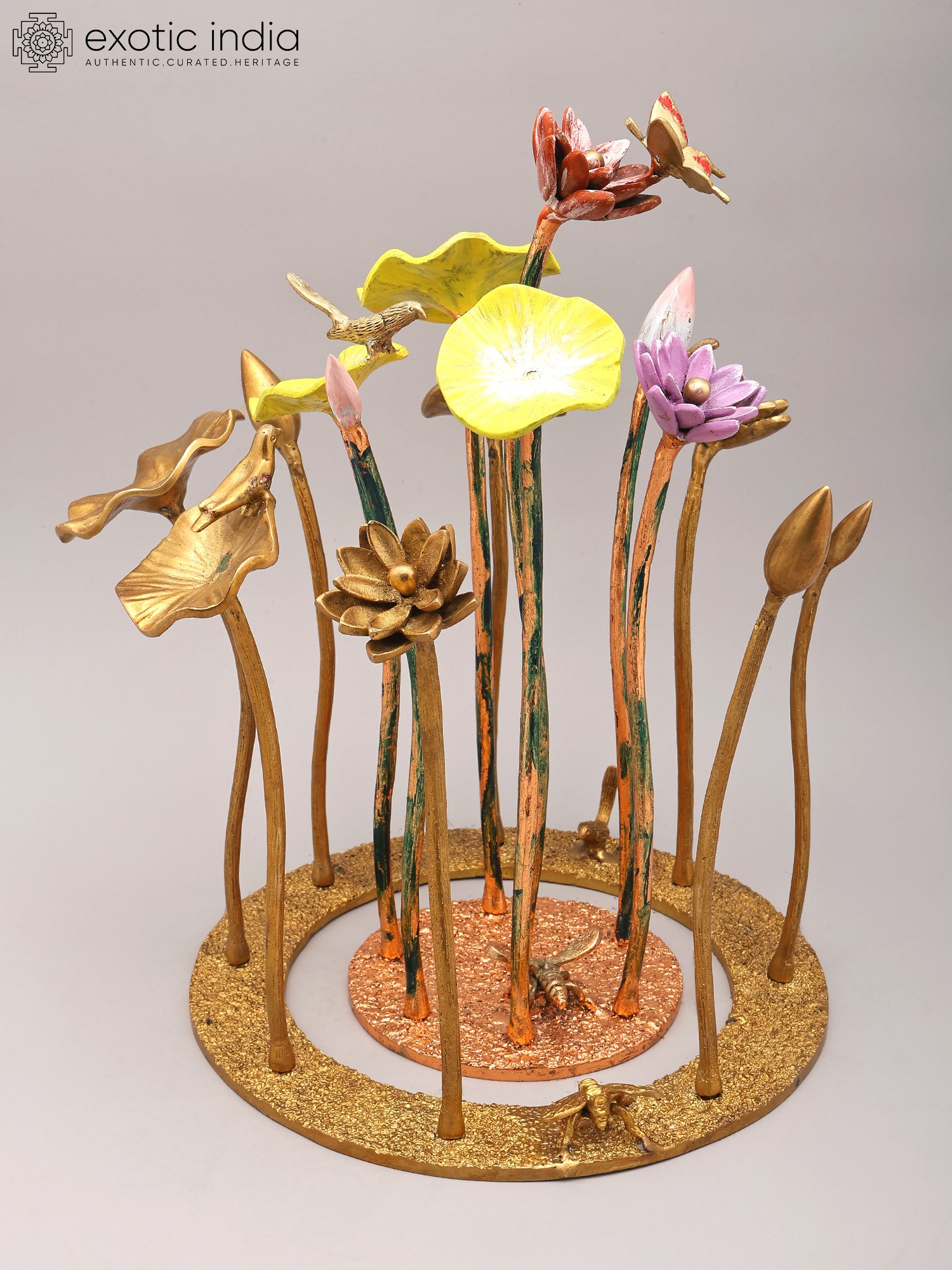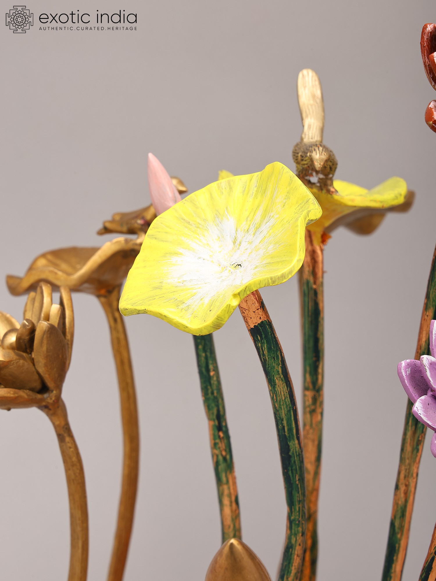 Features a striking arrangement of 16-inch brass flowers and buds.