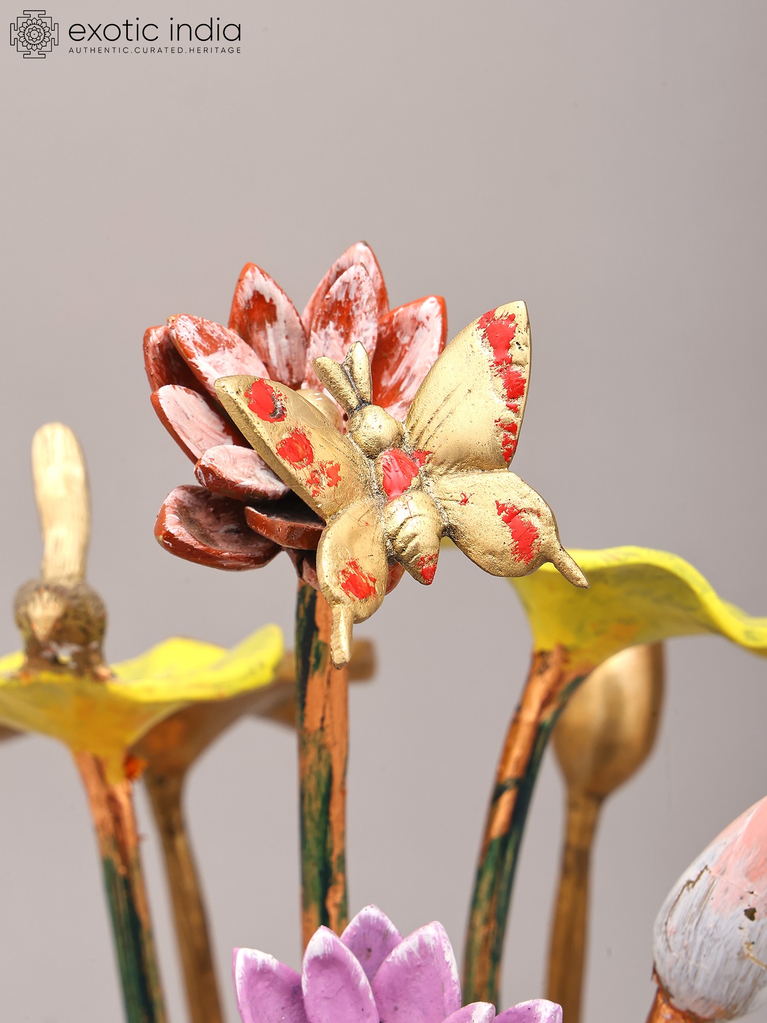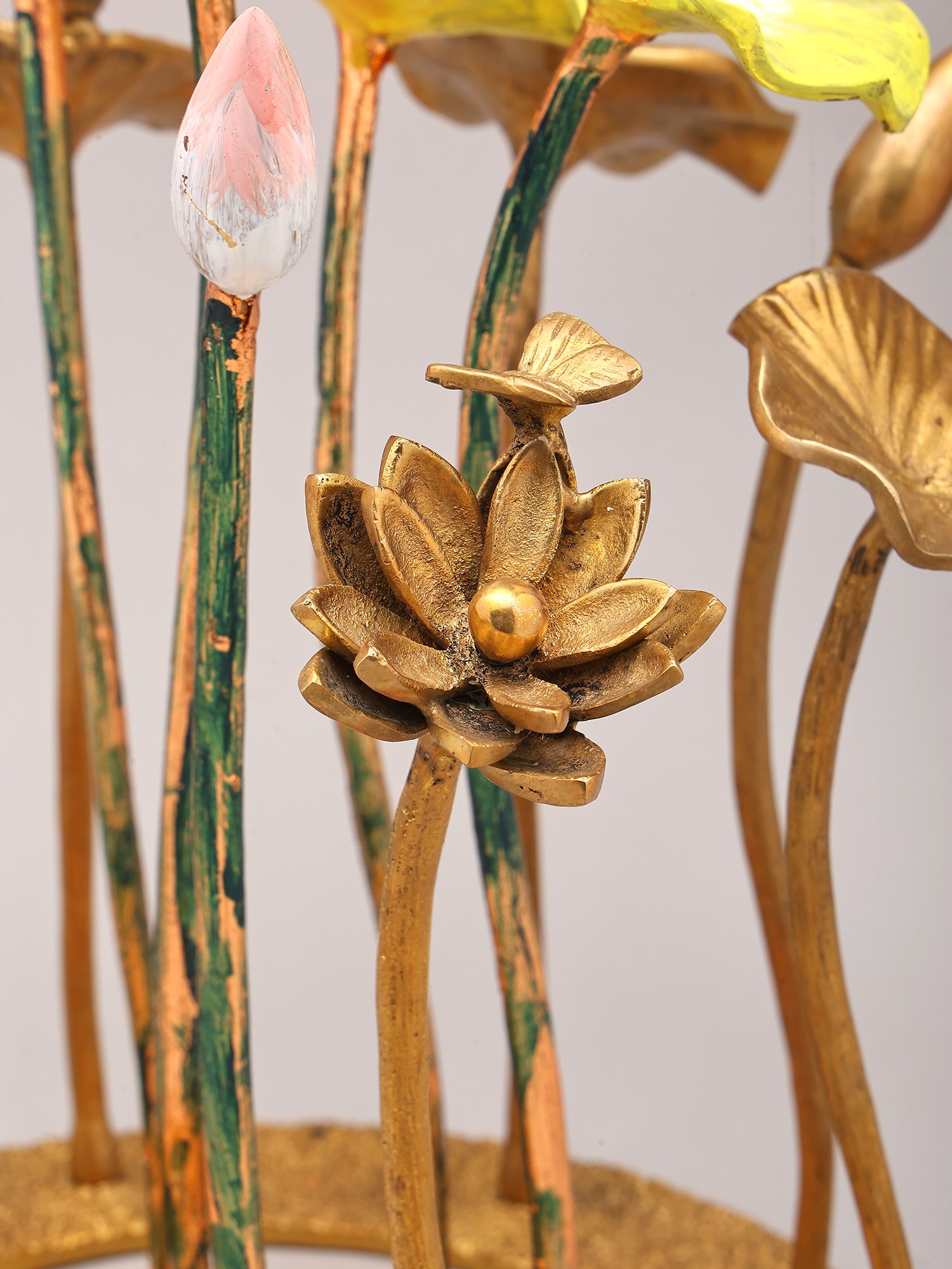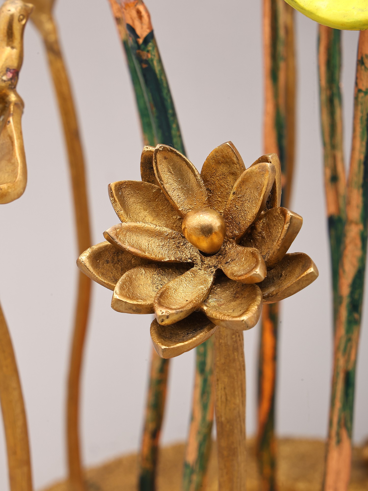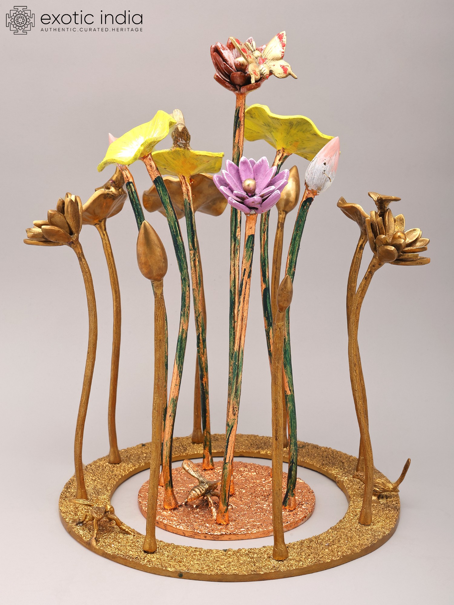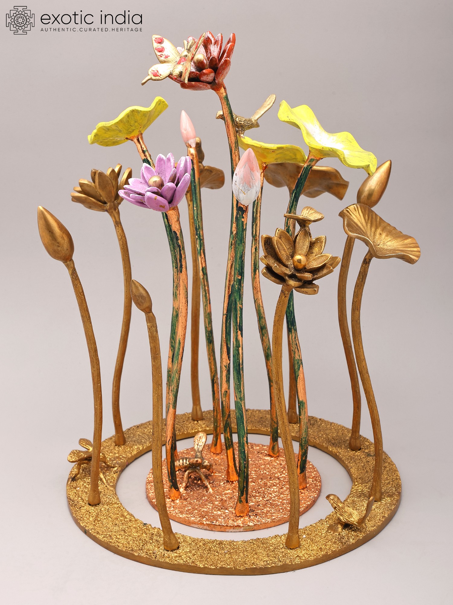 Features a striking arrangement of 16-inch brass flowers and buds.