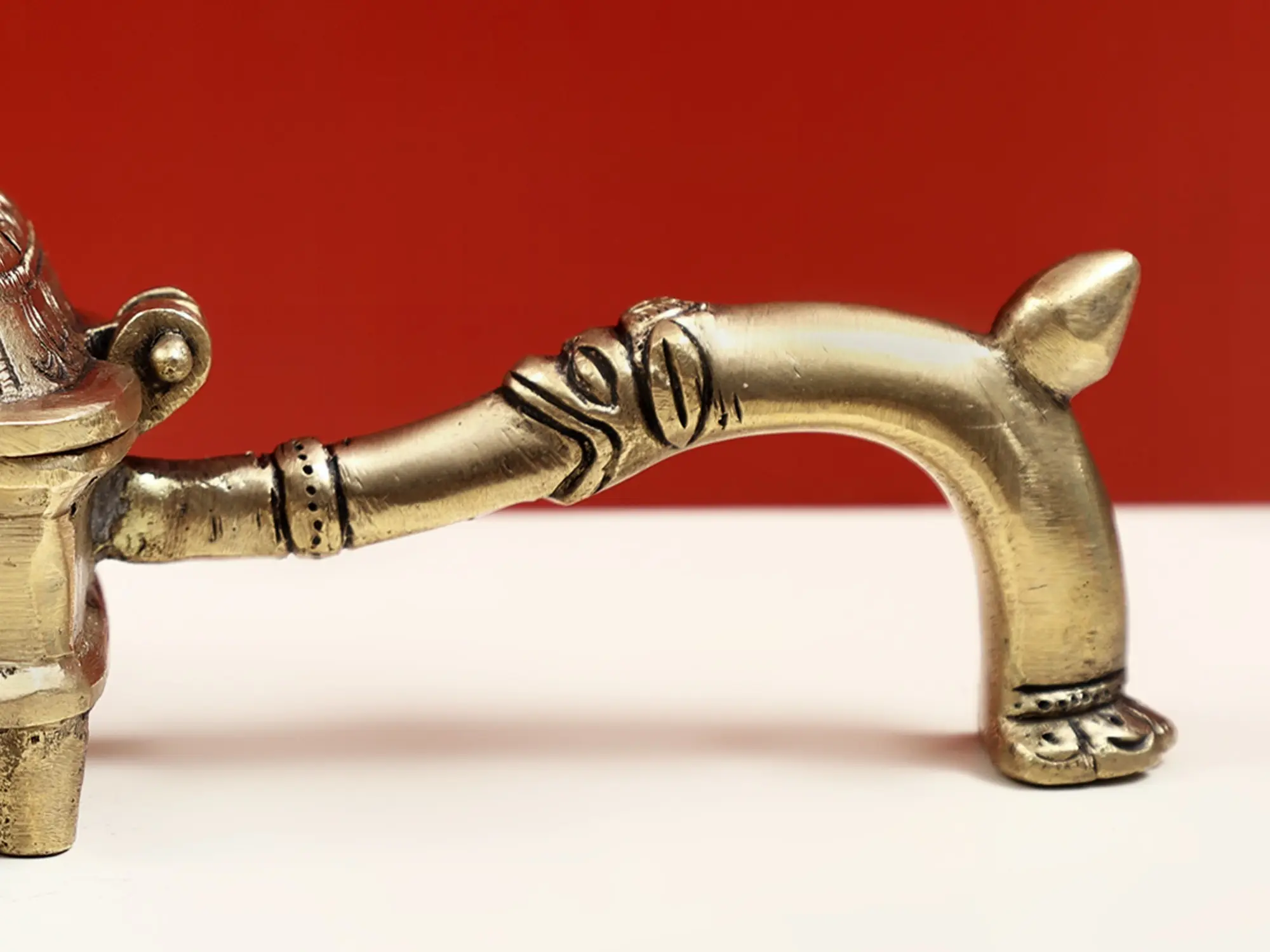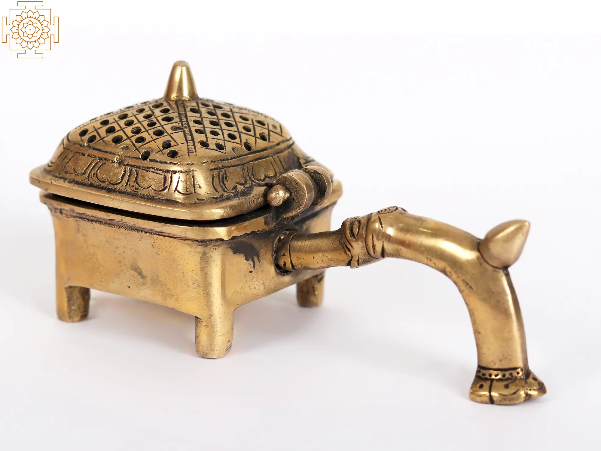 Experience spirituality in an aromatic environment, with this beautiful brass incense burner or Dhoopdani. Traditionally a multipurpose instrument, used in the Sringaar or ornamentation of women (to dry and nourish the hair), in places of worship and meditation, a Dhoopdani is a piece of utility with a distinct aesthetic appeal. This brass incense burner has its handle emerging from the mouth of an animal and has a perforated lid to let the fragrant smoke rise and embrace you in its heavenliness.