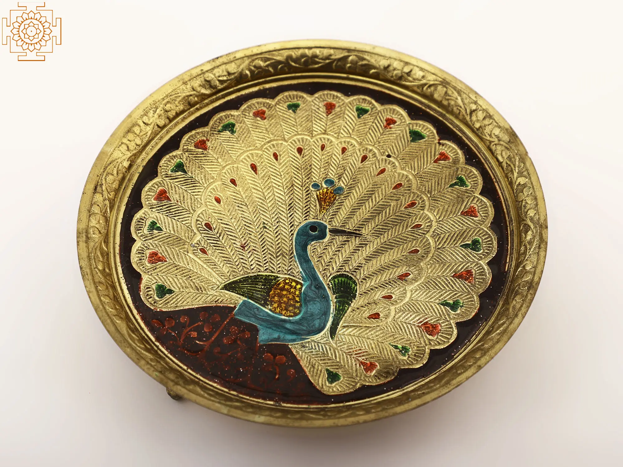 This plate has been meticulously crafted in brass and includes a mesmerising depiction of a majestic peacock, its brilliant plumage brought to life in painstaking detail. This plate is a statement piece that embodies elegance. Beyond its aesthetic allure, the Peacock Design Plate signifies grace, beauty, and prosperity, making it a thoughtful gift or a captivating addition to your home decor. Celebrate beautiful moments of life with this extraordinary piece.