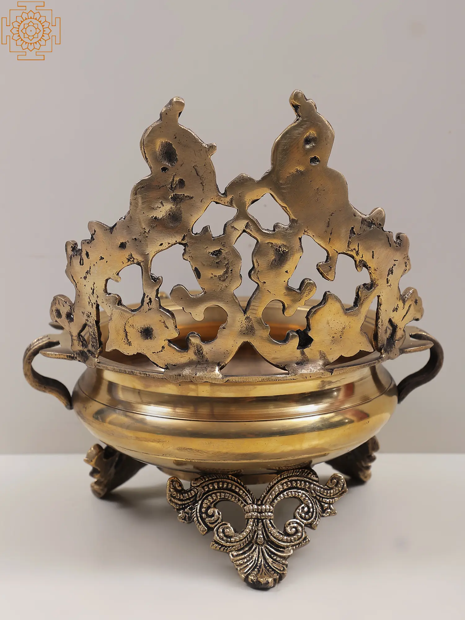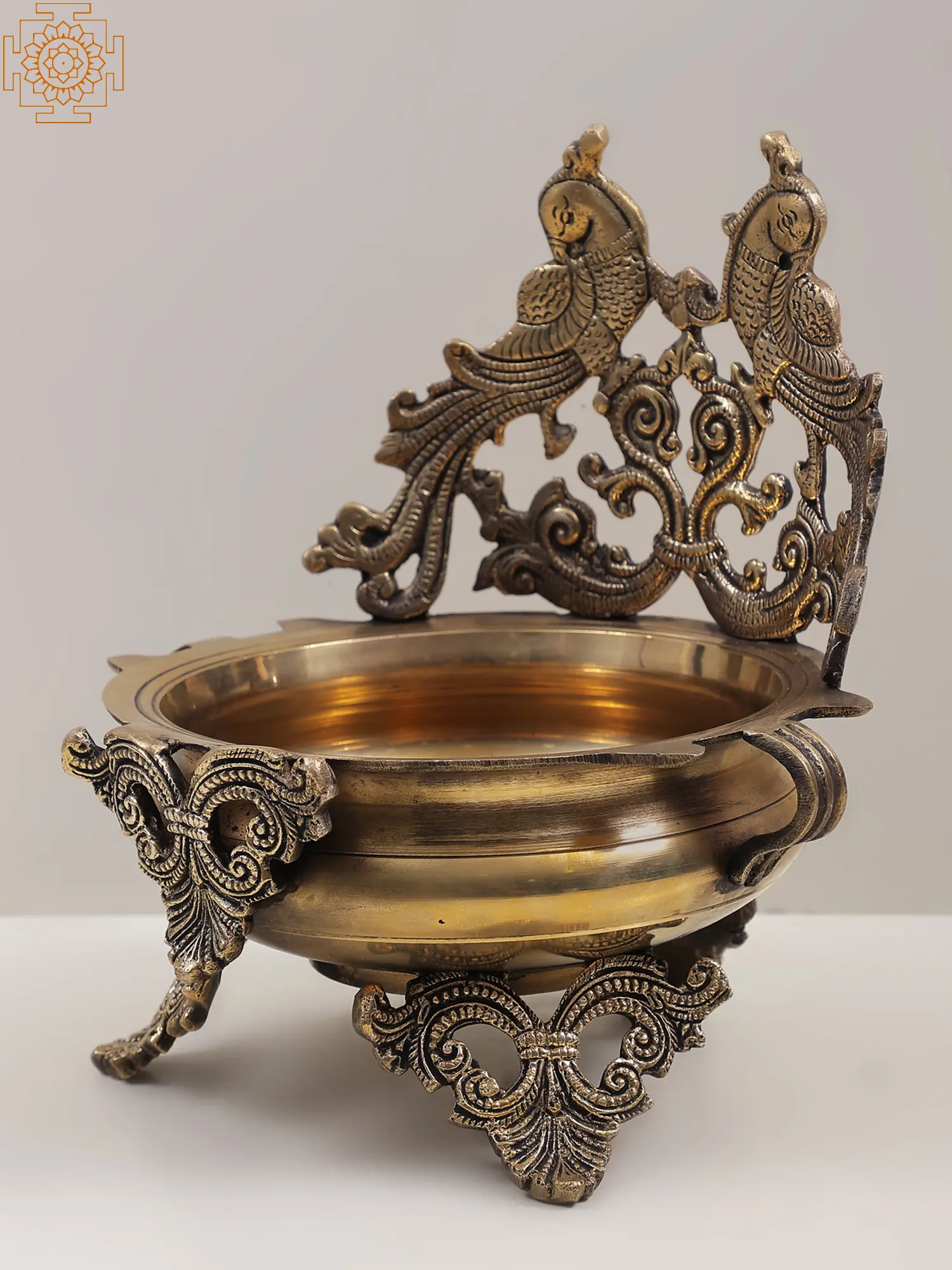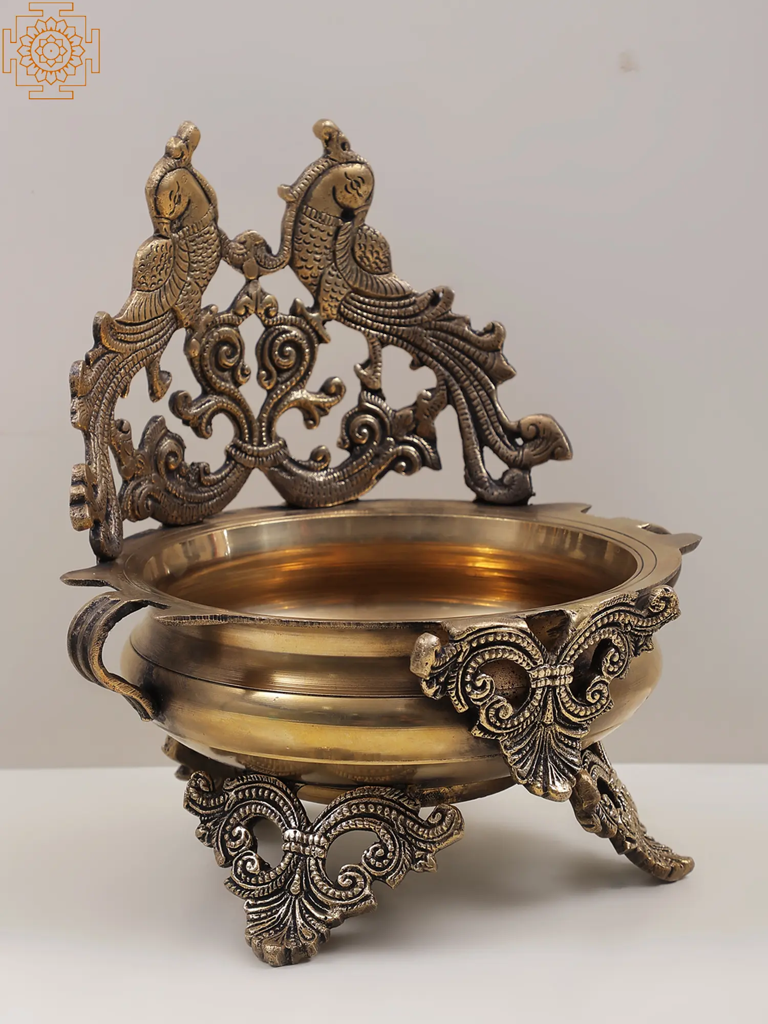 This Urli is a classic element of home decor to enhance the aesthetics of the living room. Made of brass, this Urli bowl features amazingly crafted peacocks and traditional designs around it. Peacock represents beauty, honor, and freedom, thereby, spreading joy and happiness in the family. You can adorn this Urli in your living room or in the Puja area to bring out a vibrant look in the space. It can be perfectly used in the festive decorations by filling it with water and floating petals of fresh flowers on it.