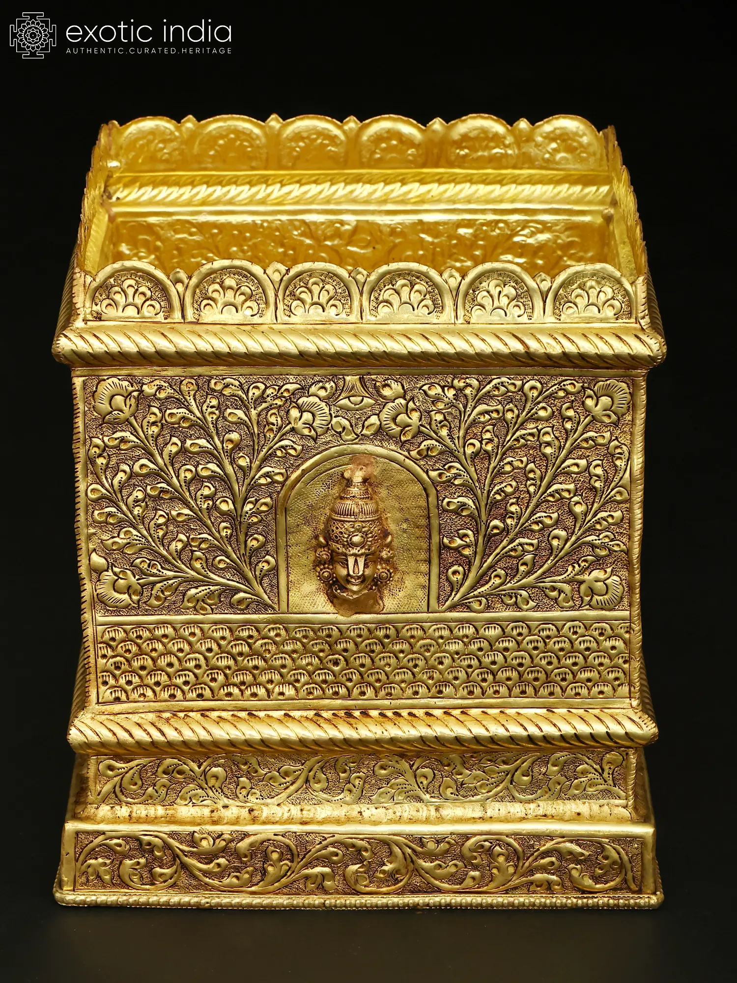 Meticulously handcrafted from solid brass, this piece is a testament to generations of artistic heritage. Skilled artisans have painstakingly carved and molded the metal, bringing to life intricate floral motifs and a central divine visage. Each detail, from the textured backgrounds to the flowing vine patterns, showcases an unwavering commitment to quality and aesthetic perfection, ensuring a truly heirloom-worthy artifact.