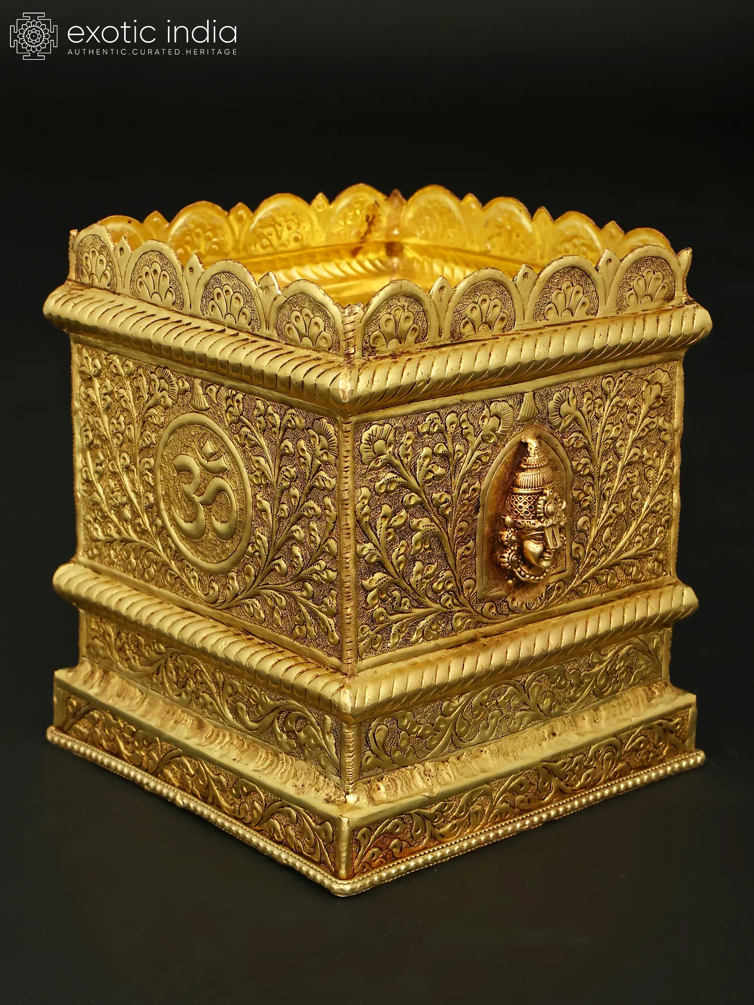 Ornate Brass Planter with Vaishnav Motifs - Shankh, Chakra, and Tilak