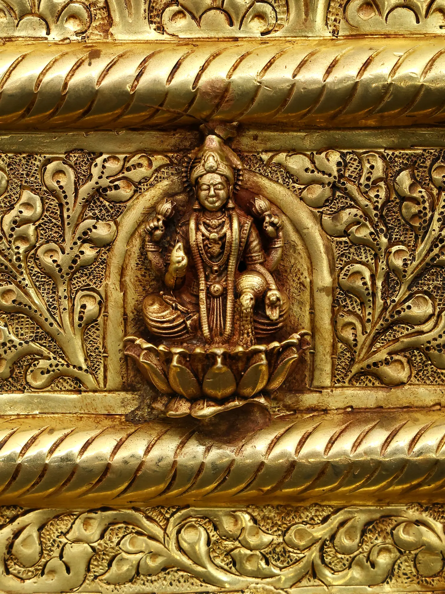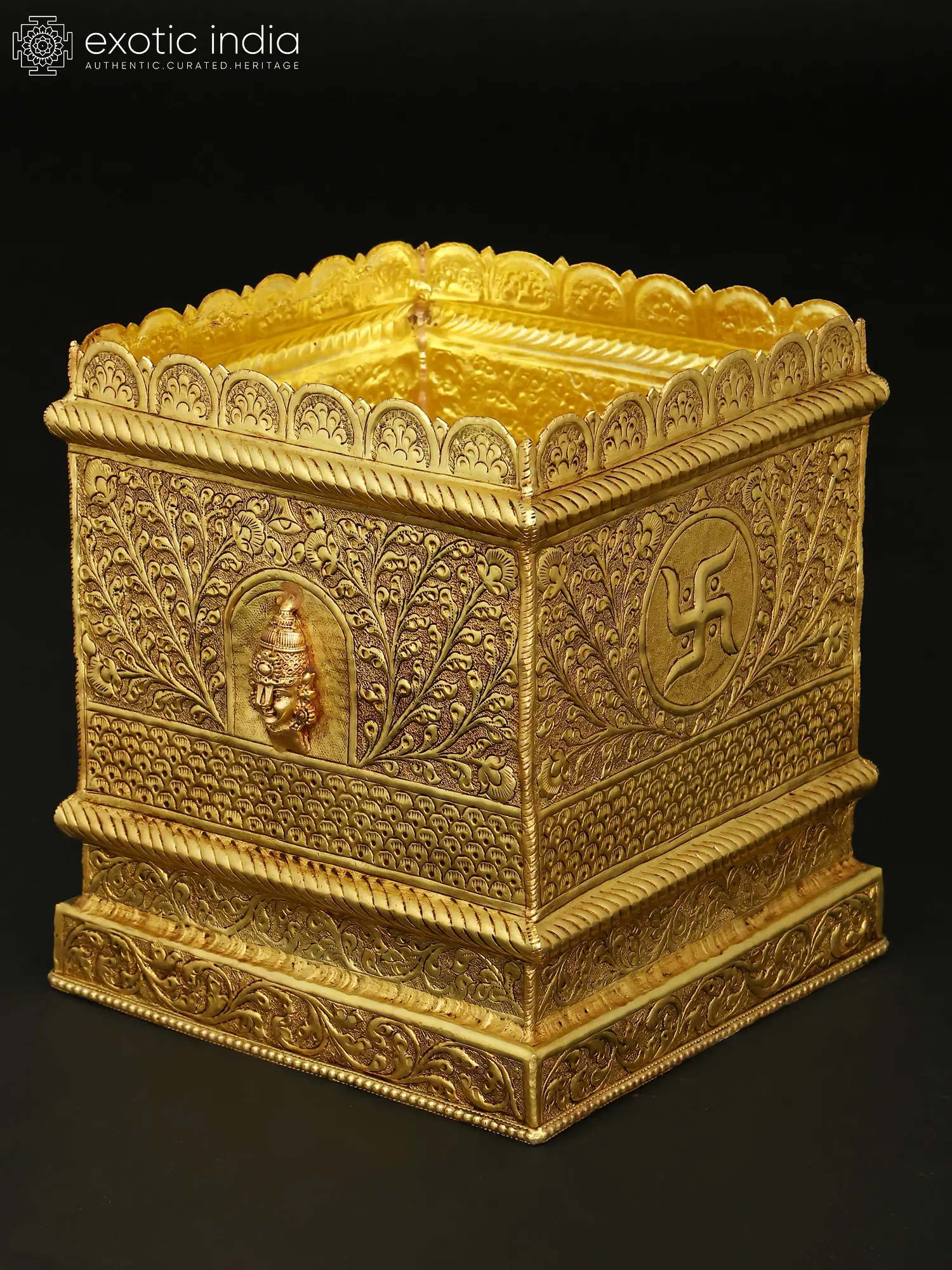 Meticulously handcrafted from solid brass, this piece is a testament to generations of artistic heritage. Skilled artisans have painstakingly carved and molded the metal, bringing to life intricate floral motifs and a central divine visage. Each detail, from the textured backgrounds to the flowing vine patterns, showcases an unwavering commitment to quality and aesthetic perfection, ensuring a truly heirloom-worthy artifact.