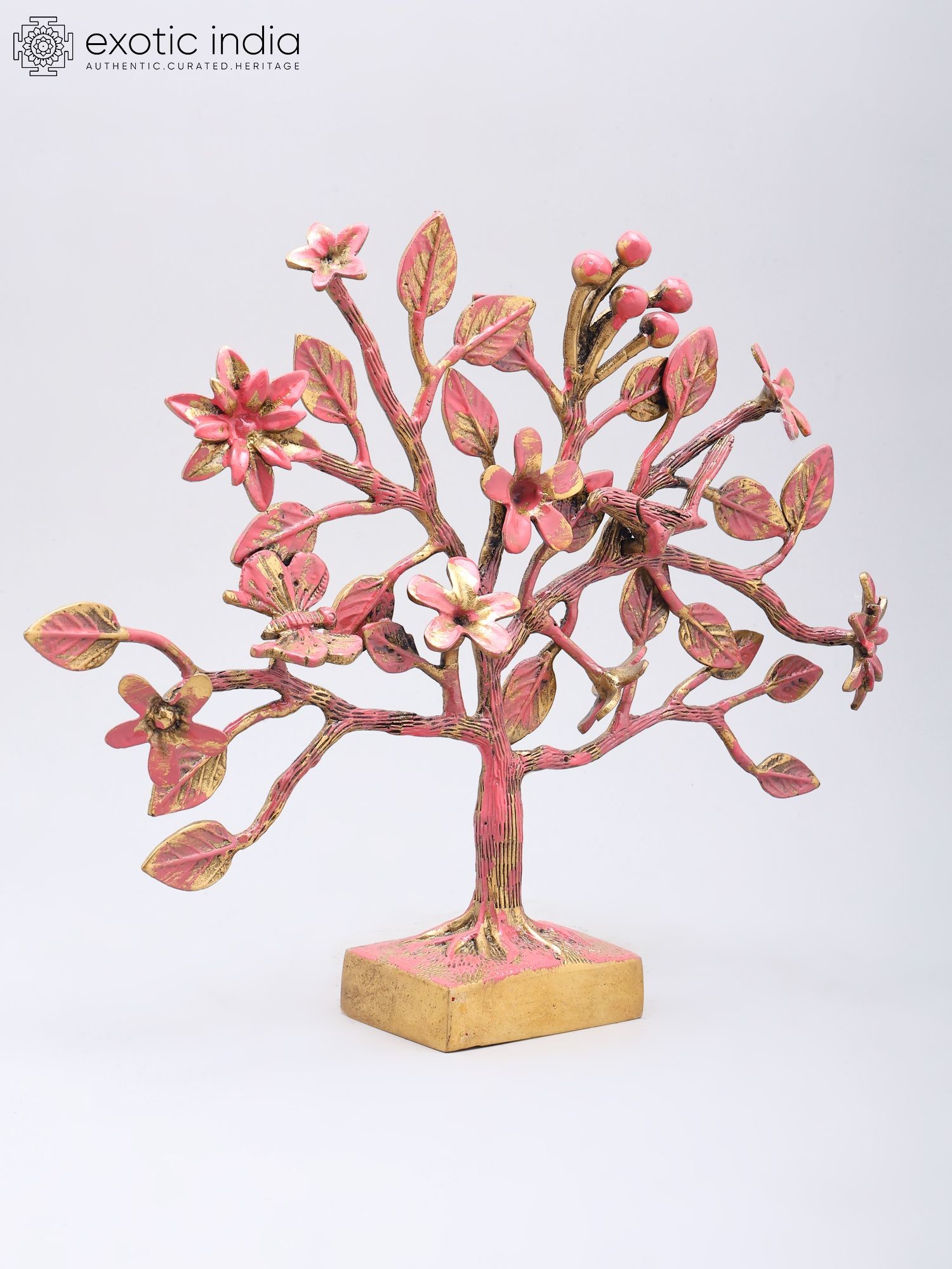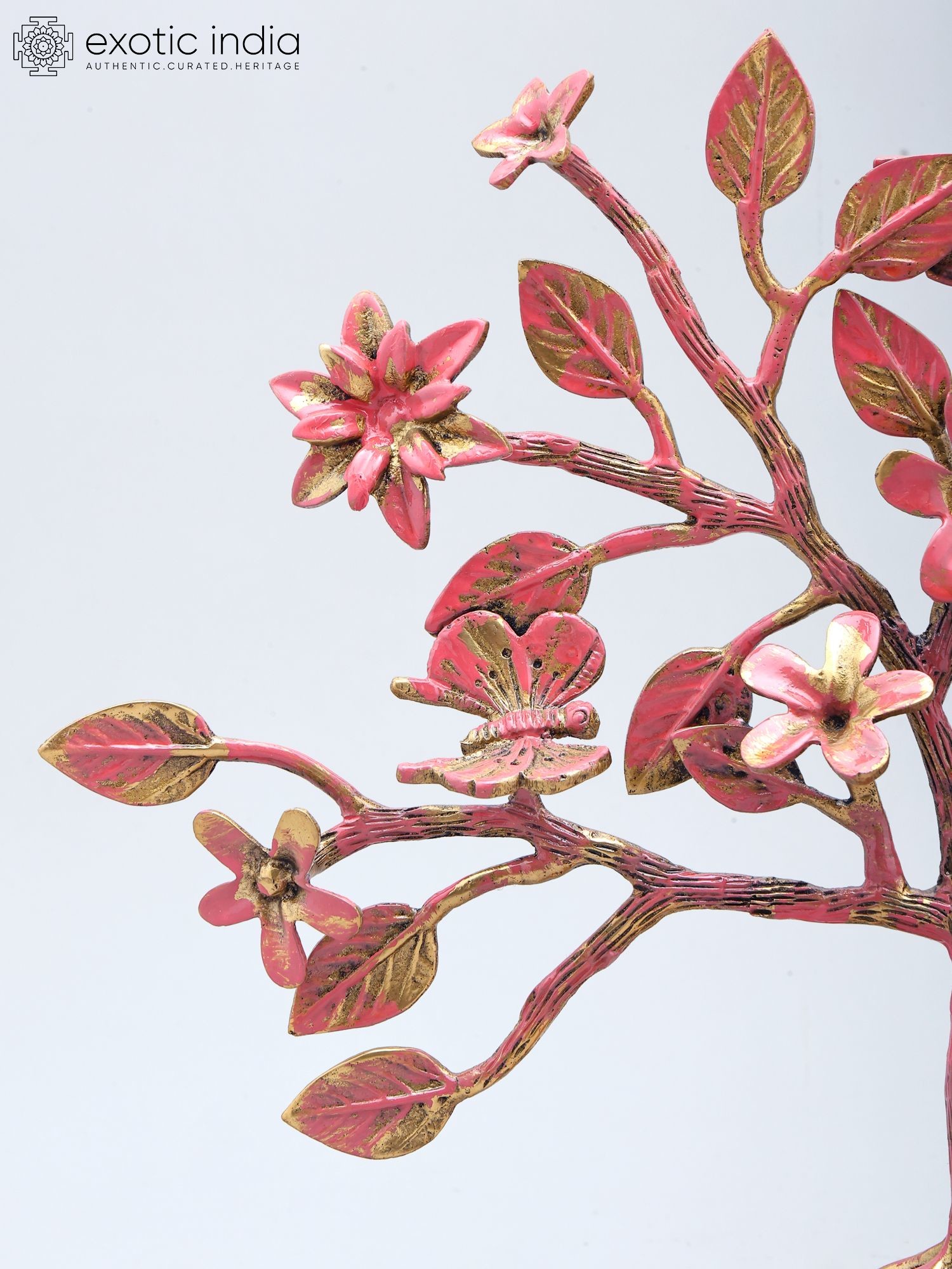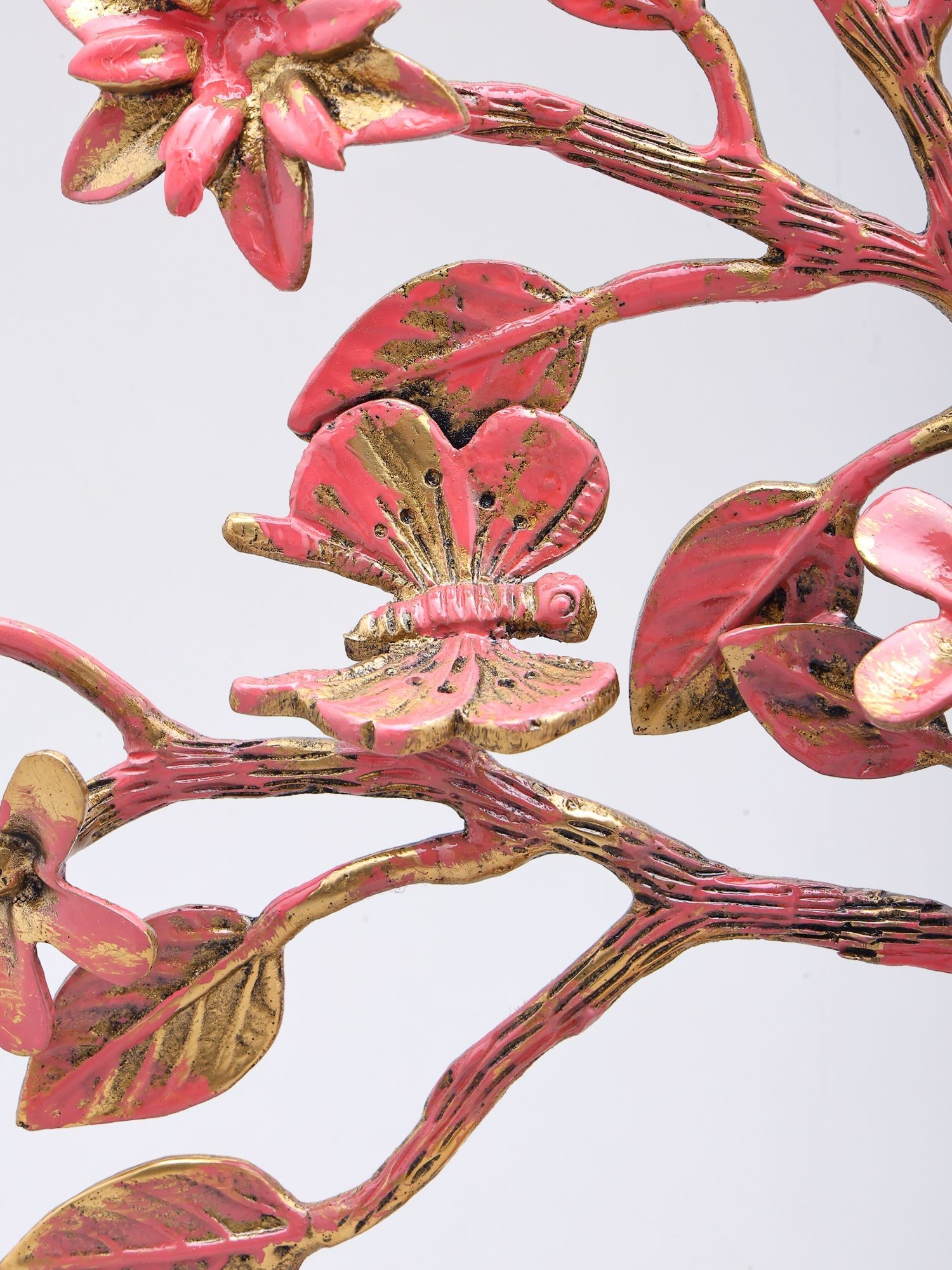 Standing at ten inches tall with a graceful spread of thirteen inches and a depth of three inches, its dimensions create a captivating presence without overpowering your decor. The textured brass, finished with a harmonious blend of soft pink and antique gold, imparts a vibrant yet sophisticated aura. Delicate flowers and intricate leaves, some adorned with tiny, life-like butterflies, draw the eye and invite closer inspection.